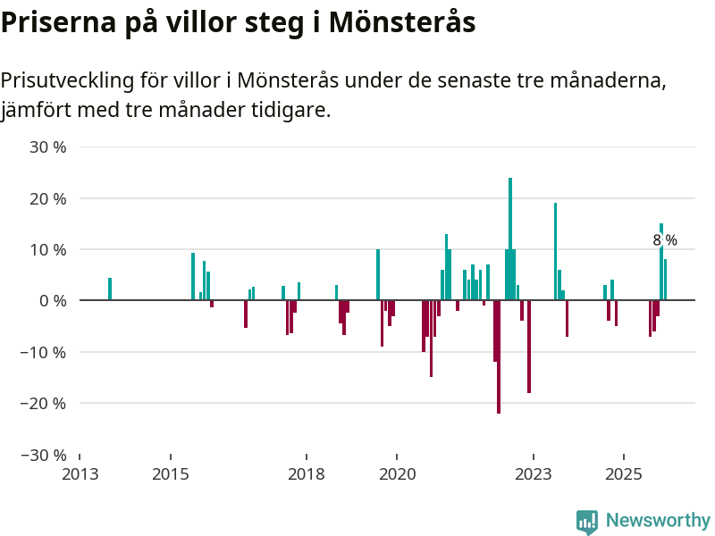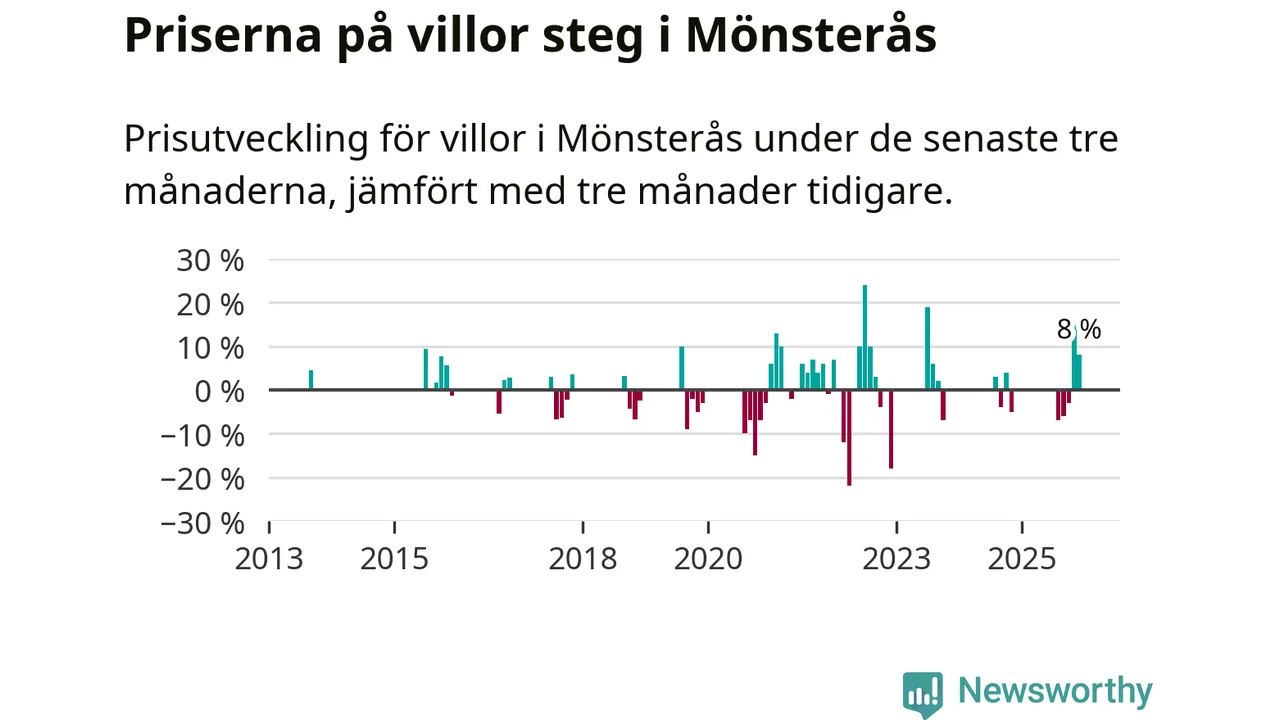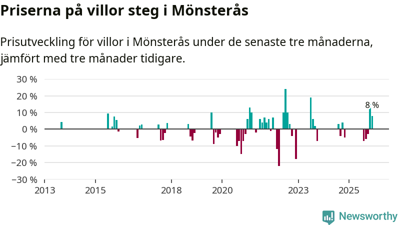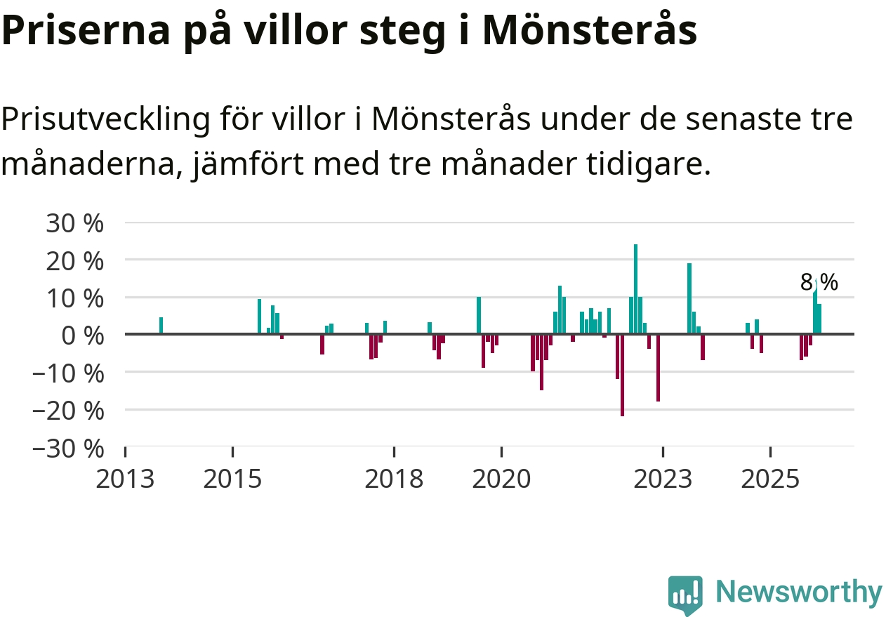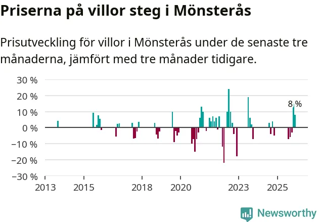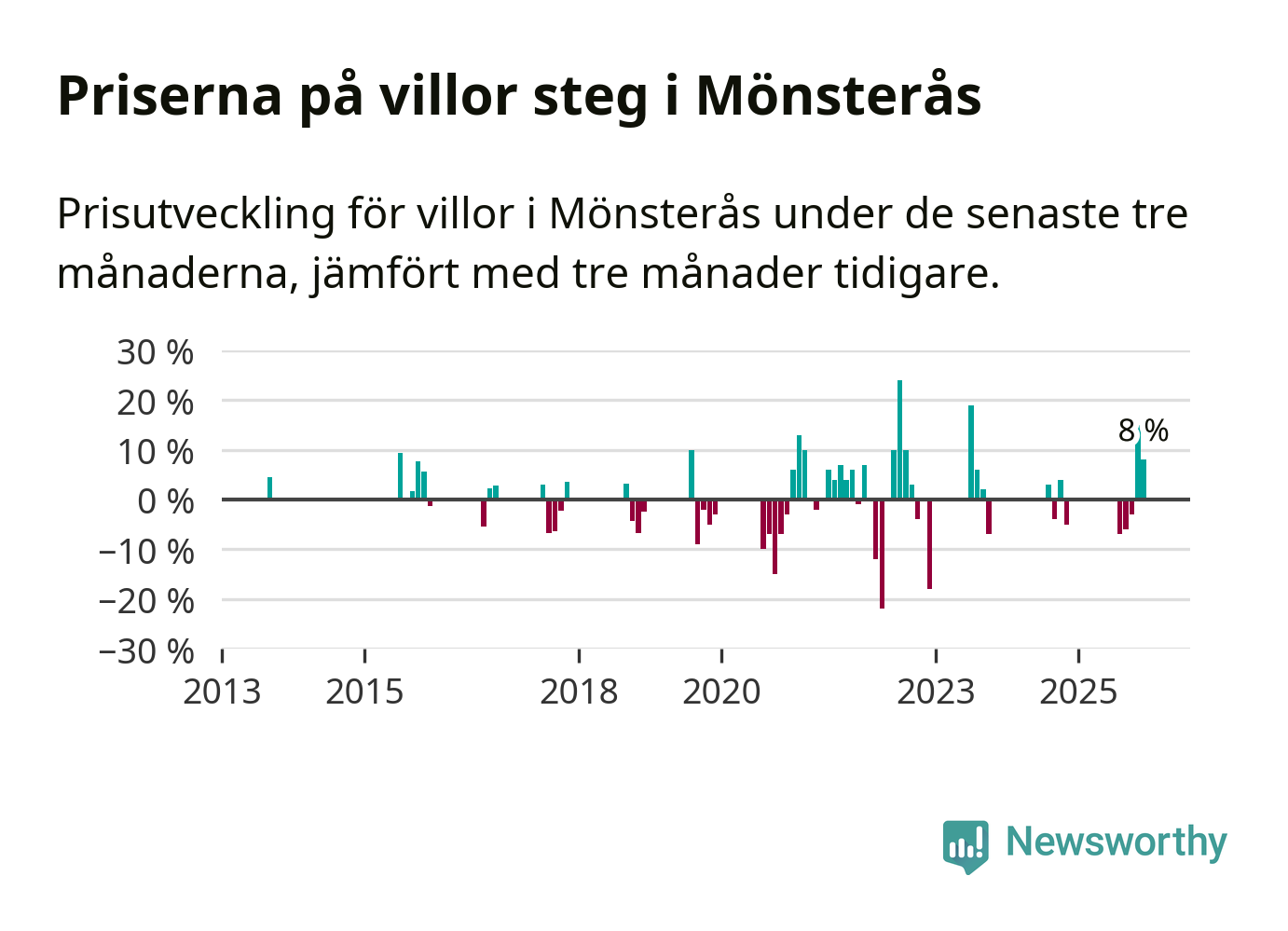 Statistiken visar även på en stor prisuppgång i Mönsterås kommun. Medelpriset på försäljningarna av villor i kommunen var 8 procent högre än för tre månader sedan. I hela Kalmar län däremot sjunker villapriserna. I hela länet noterades en prisnedgång på 5 procent.