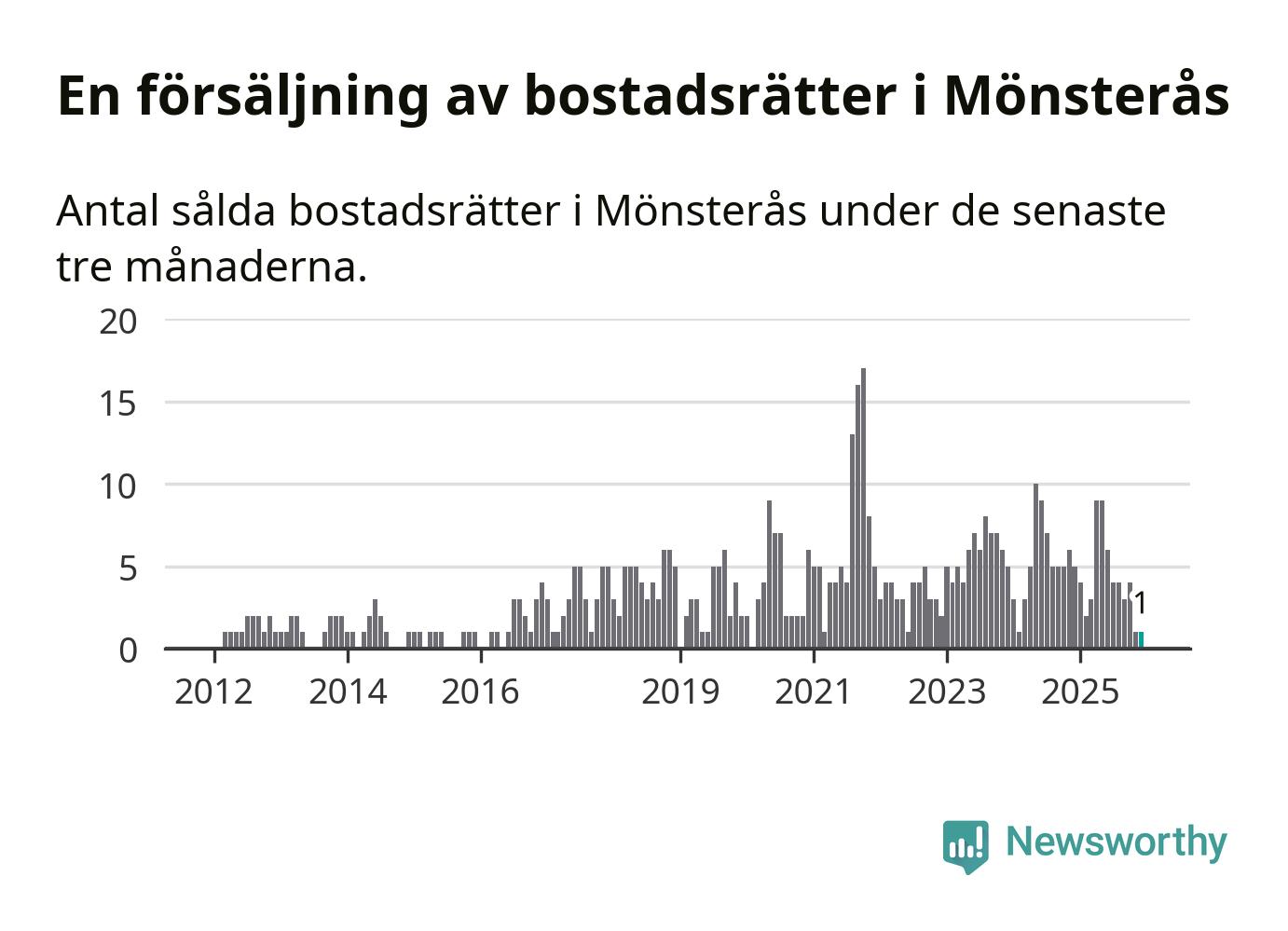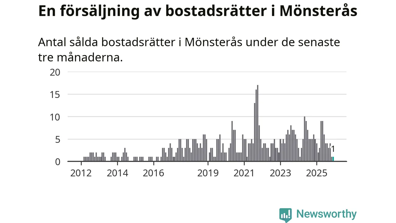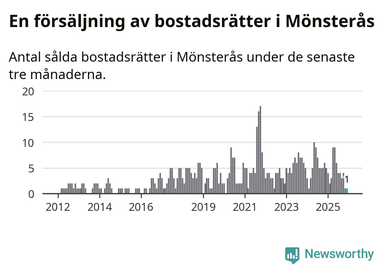 Mellan oktober och december gjordes sammanlagt en affär med bostadsrätter i Mönsterås kommun. Det kan jämföras med fem vid motsvarande tid i fjol.