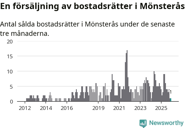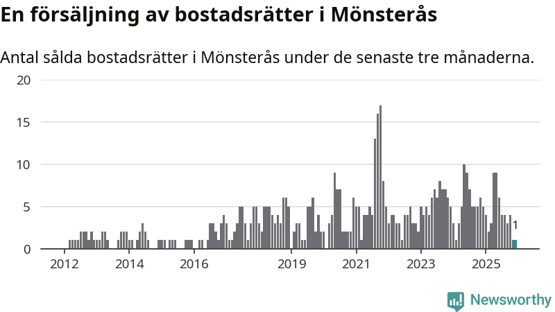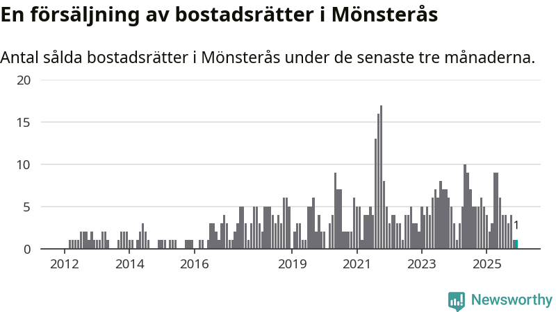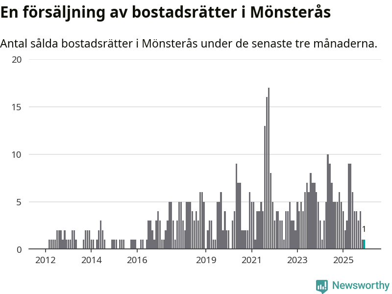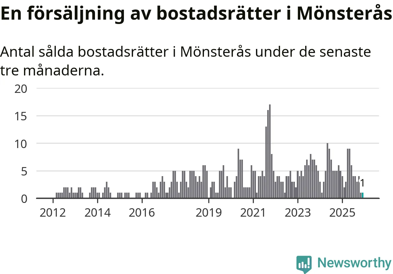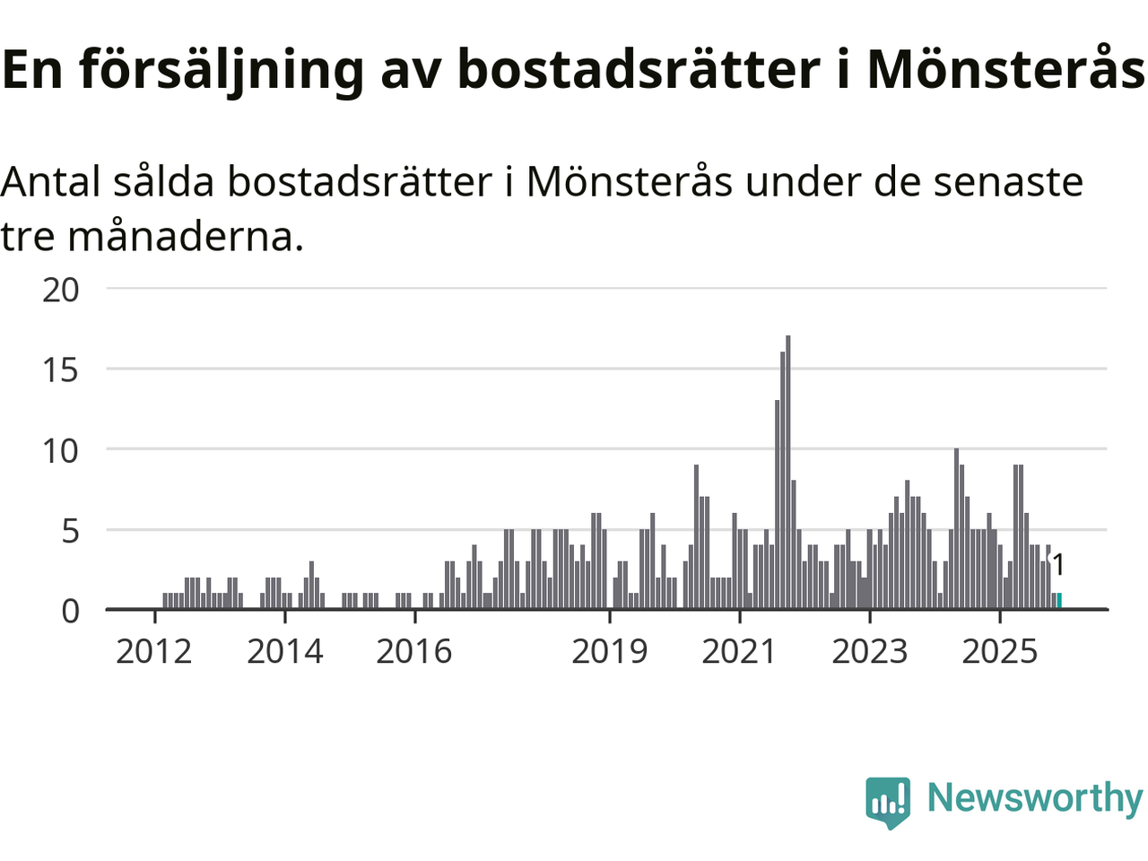 Mellan oktober och december gjordes sammanlagt en affär med bostadsrätter i Mönsterås kommun. Det kan jämföras med fem vid motsvarande tid i fjol.