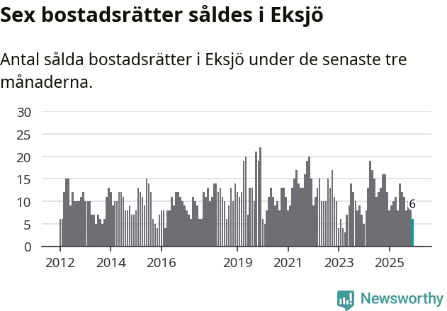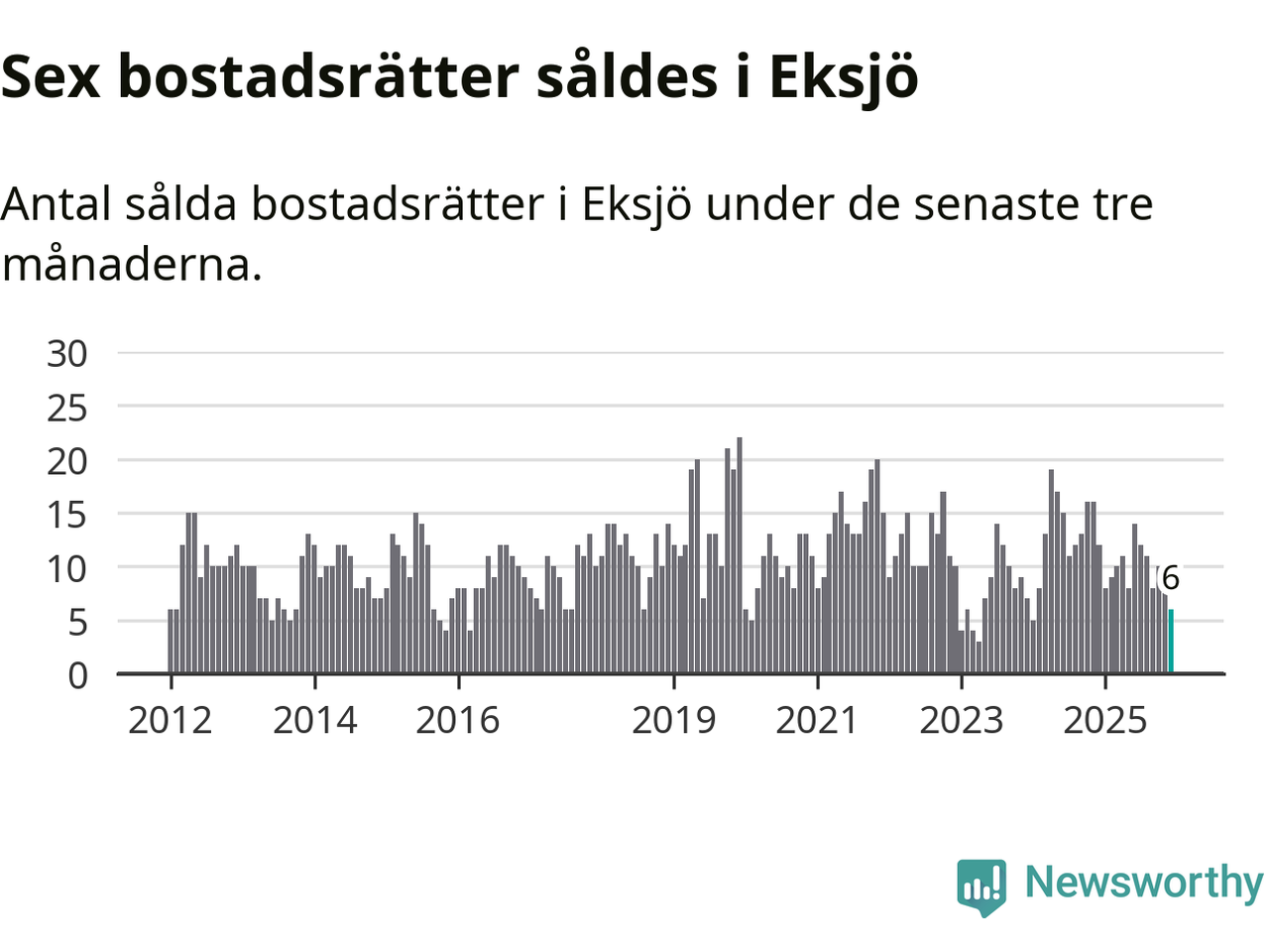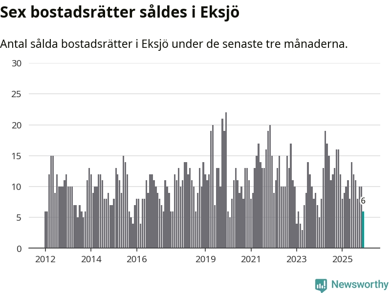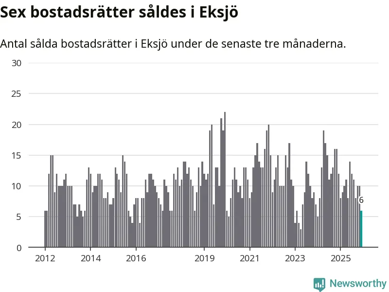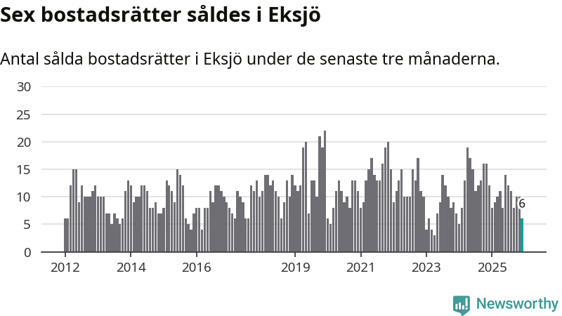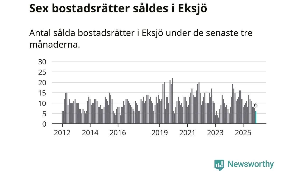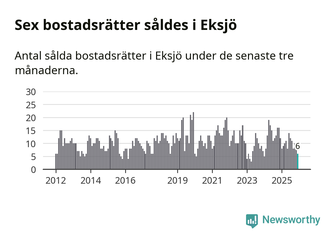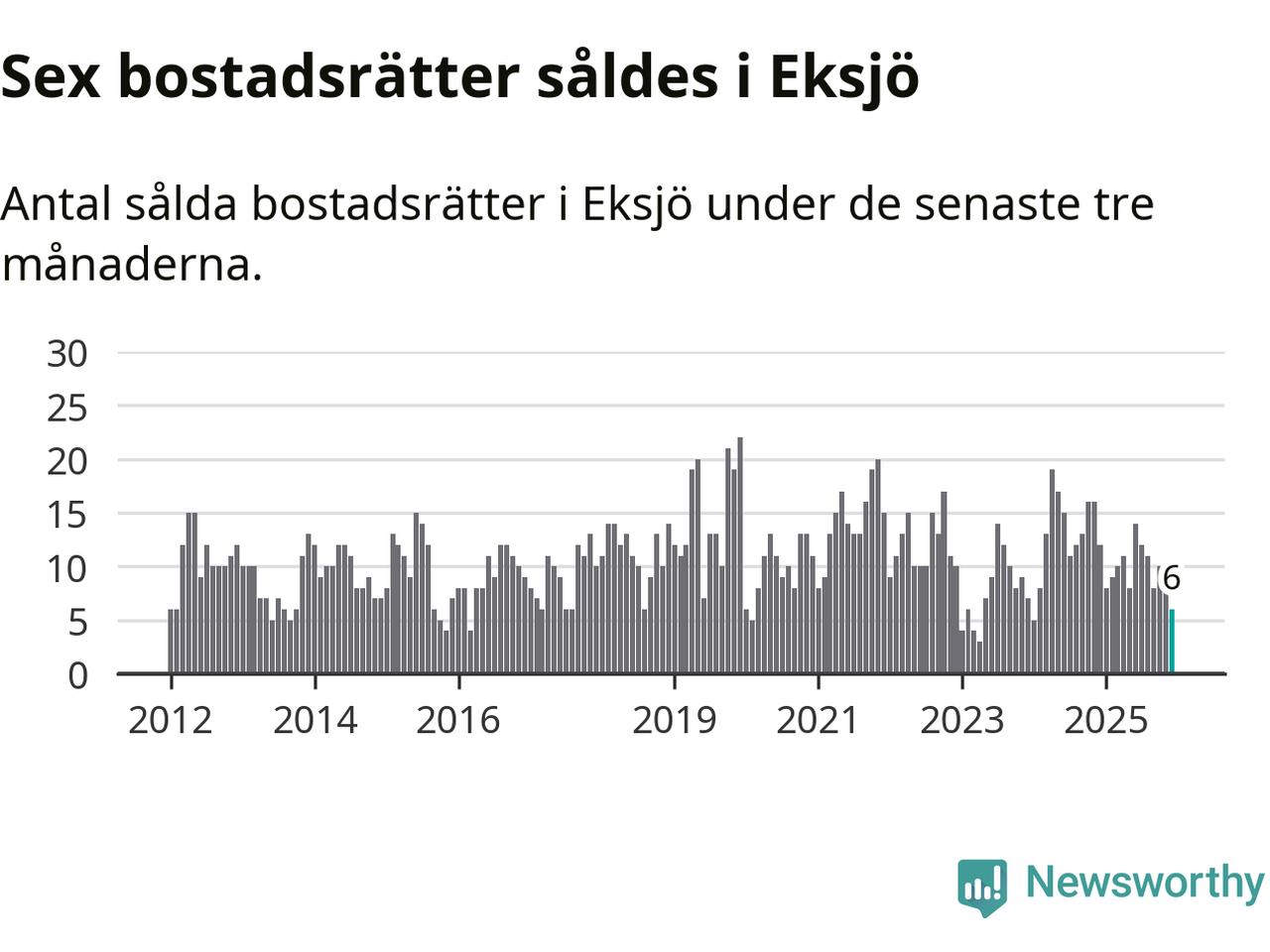 Mellan oktober och december gjordes sammanlagt sex affärer med bostadsrätter i Eksjö kommun. Det kan jämföras med tolv vid motsvarande tid i fjol.