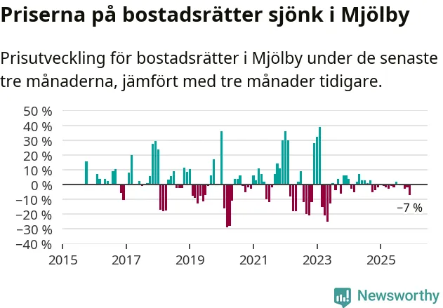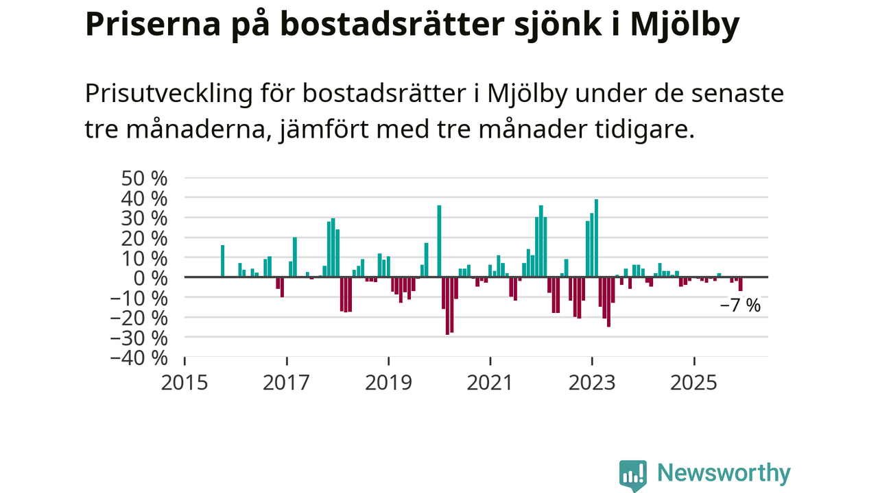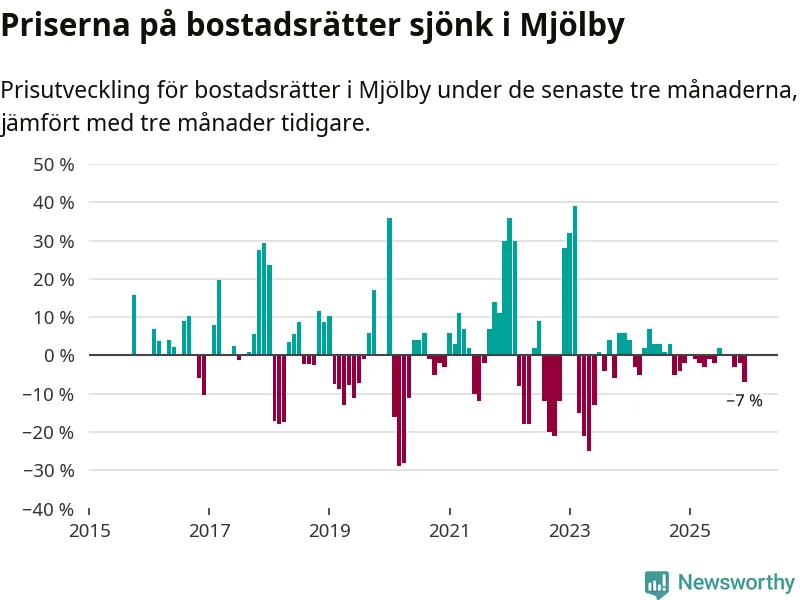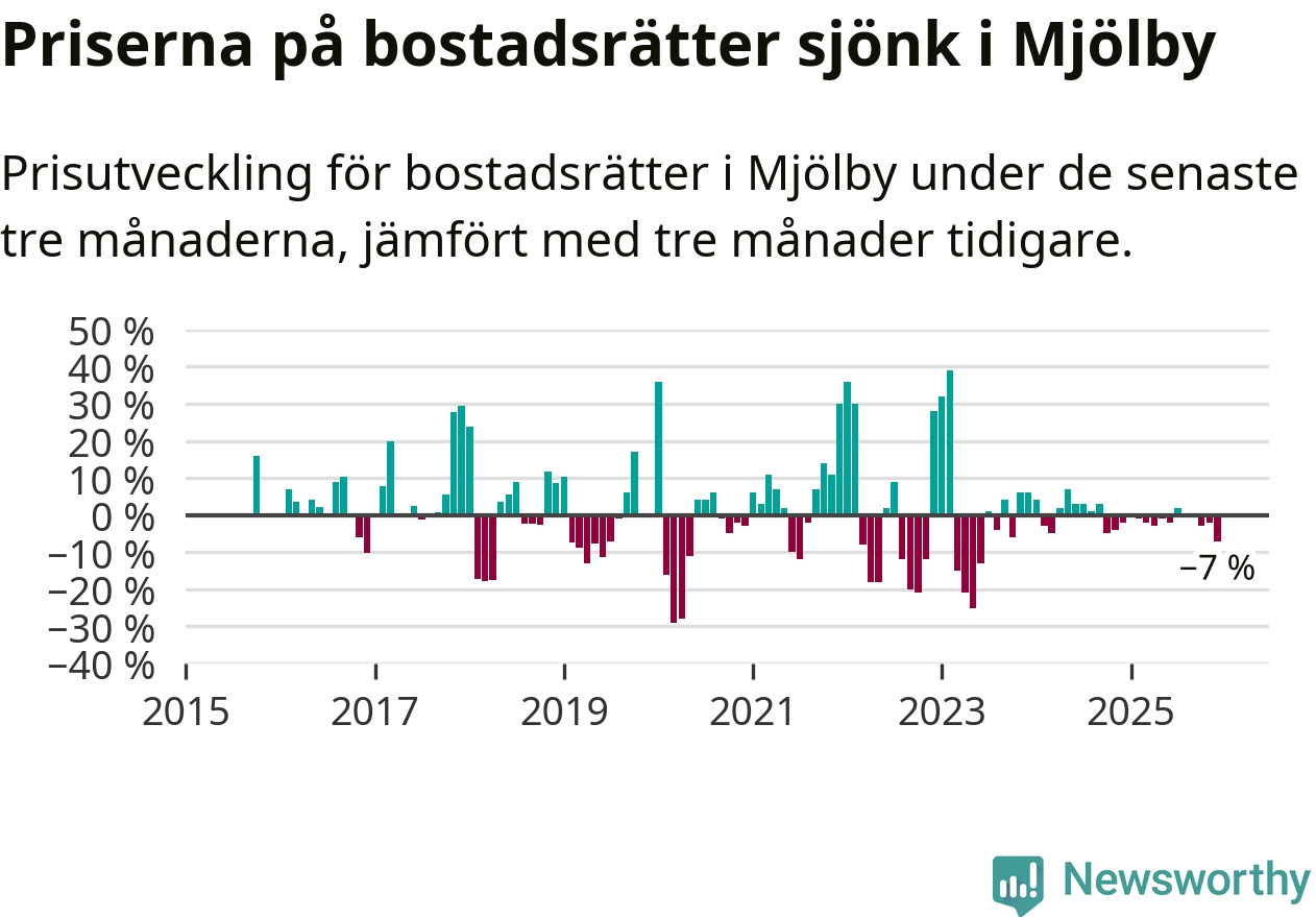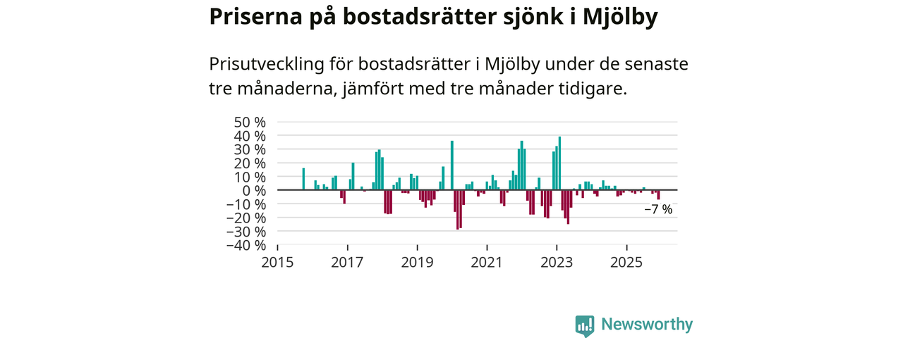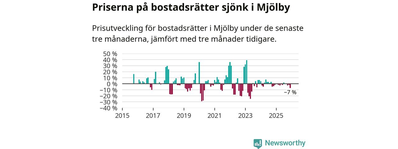 Under oktober till december såldes det sju färre bostadsrätter i Mjölby än snittet för det senaste året. Detta trots att bostadsmarknaden under oktober till december, historiskt sett, varit förhållandevis aktiv.