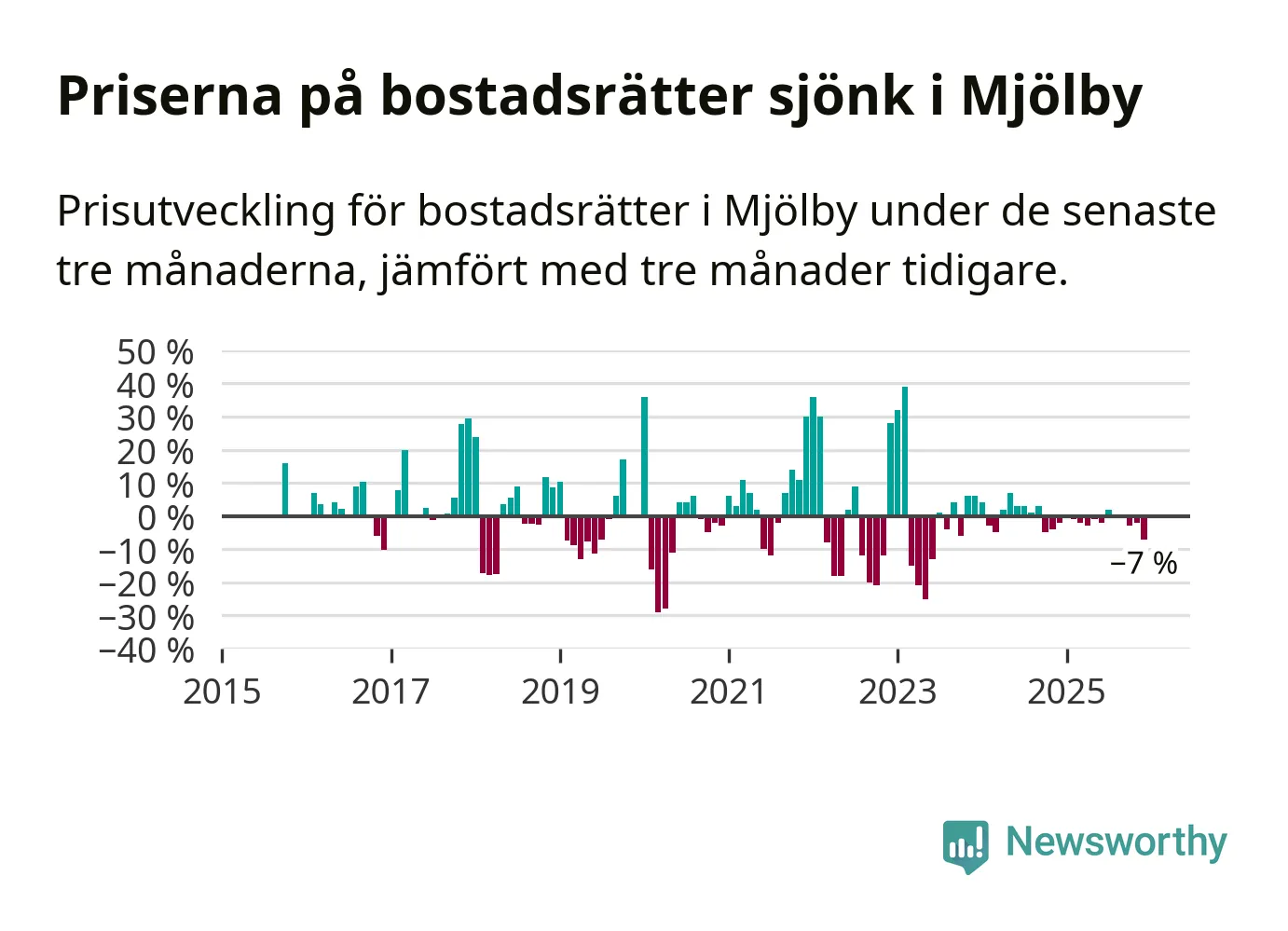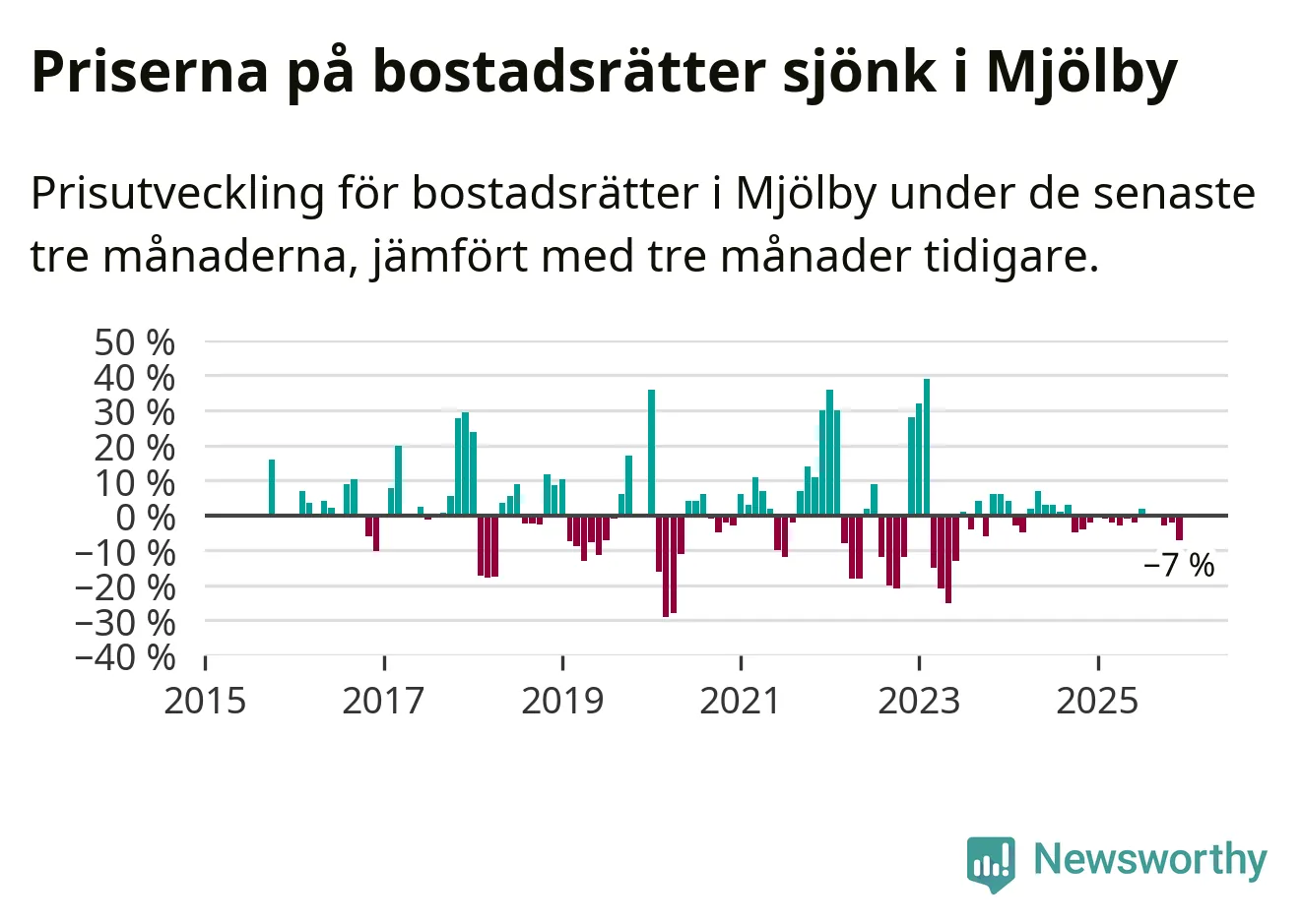 Statistiken visar även på en kännbar prisnedgång i Mjölby kommun. Medelpriset på försäljningarna av bostadsrätter i kommunen var 7 procent lägre än för tre månader sedan. Även i hela Östergötland sjunker priserna på bostadsrätter. I hela länet noterades en prisnedgång på 7 procent.