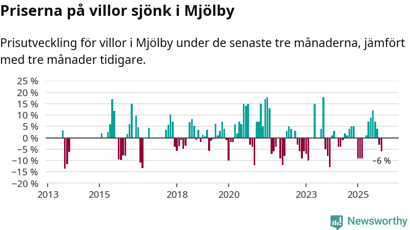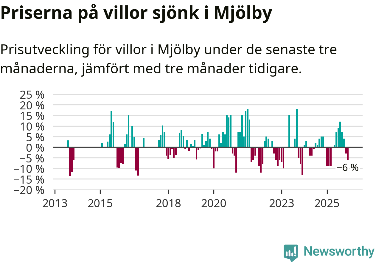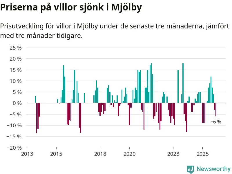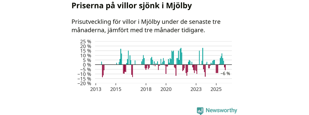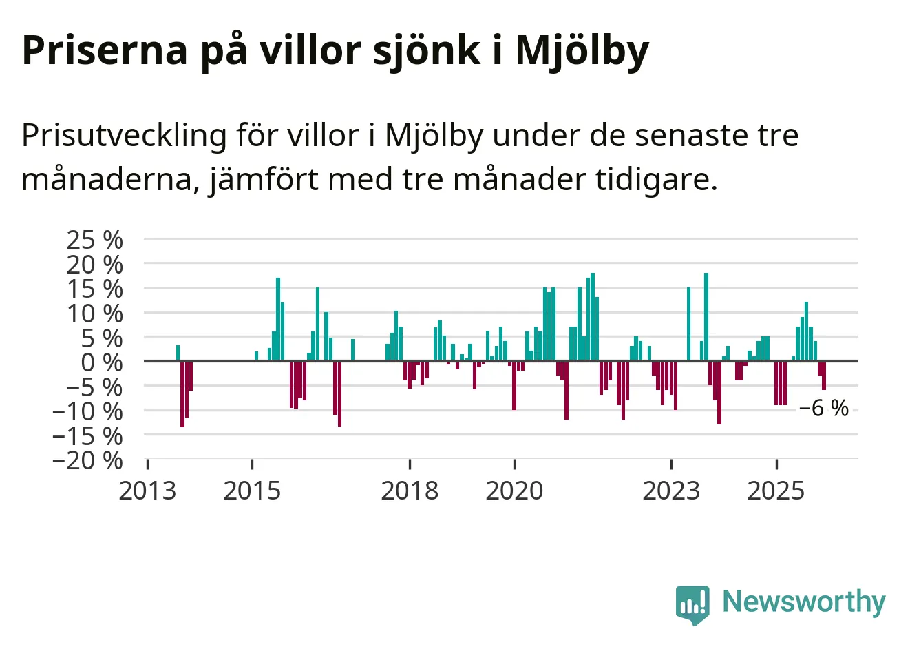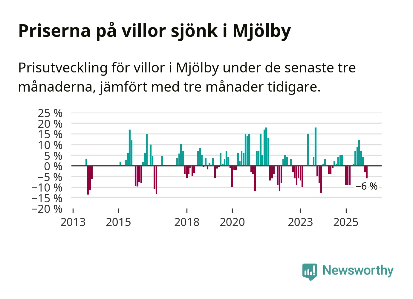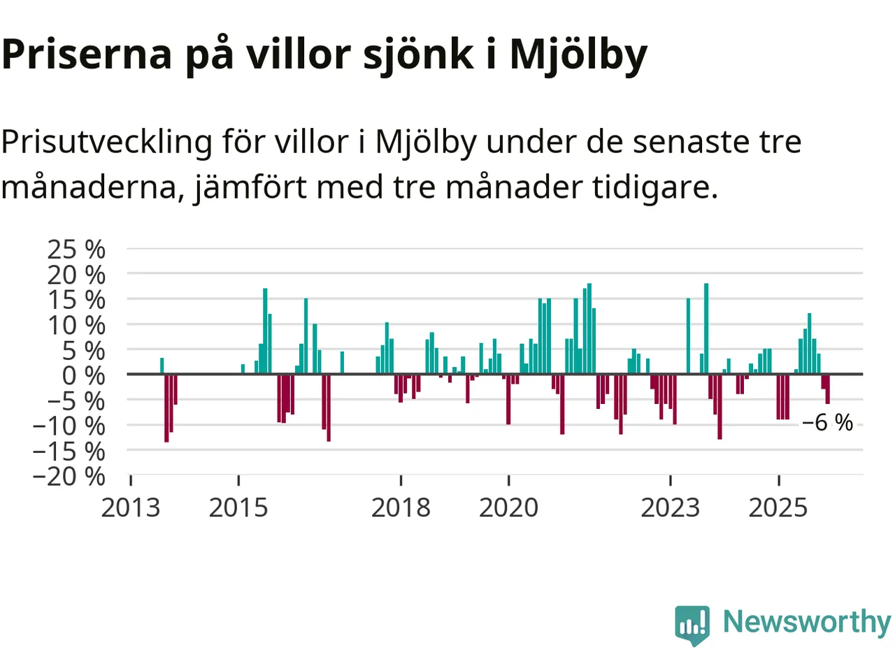 Villapriserna har gått ner i Mjölby kommun. Medelpriset på försäljningarna under de senaste tre månaderna visar på en nedgång med 6 procent.