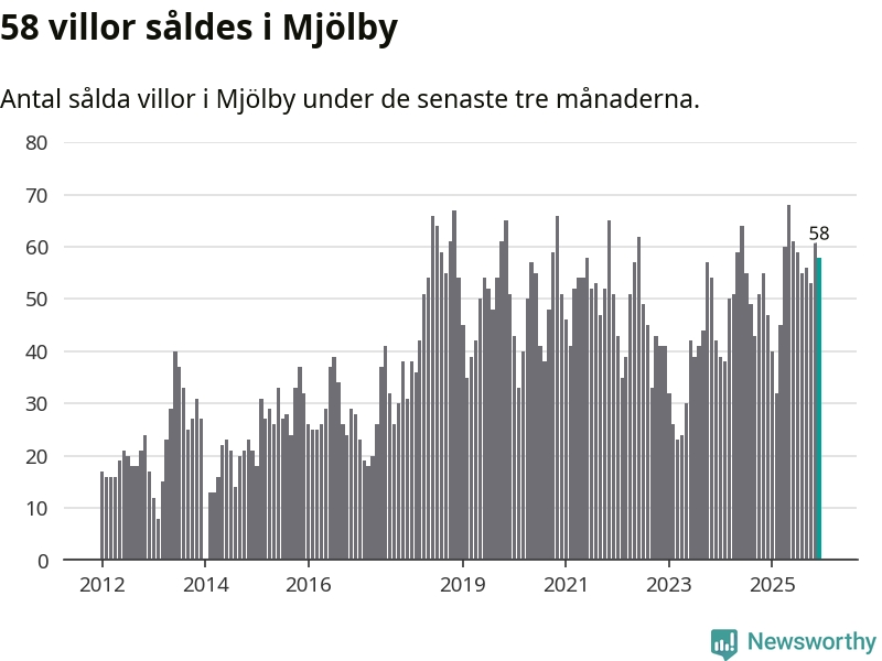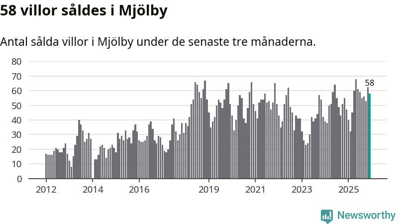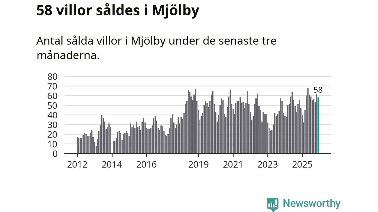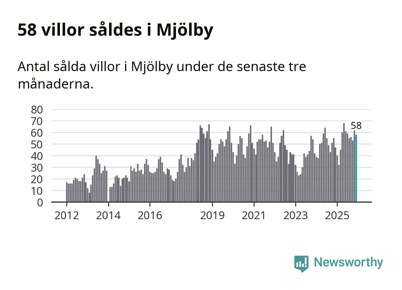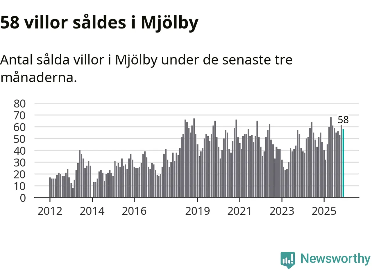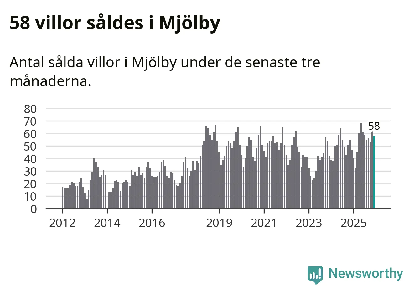 Sammanlagt såldes 58 villor i Mjölby kommun mellan oktober och december till ett genomsnittligt pris på 3,0 miljoner kronor. I fjol gjordes 47 affärer vid den här tiden på året.