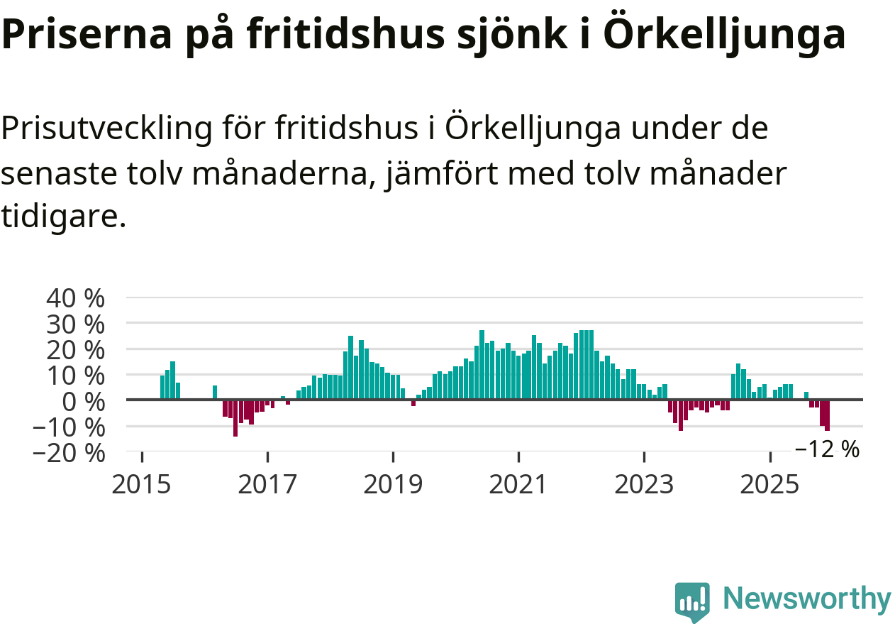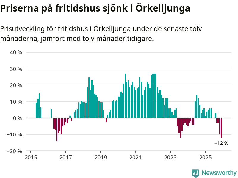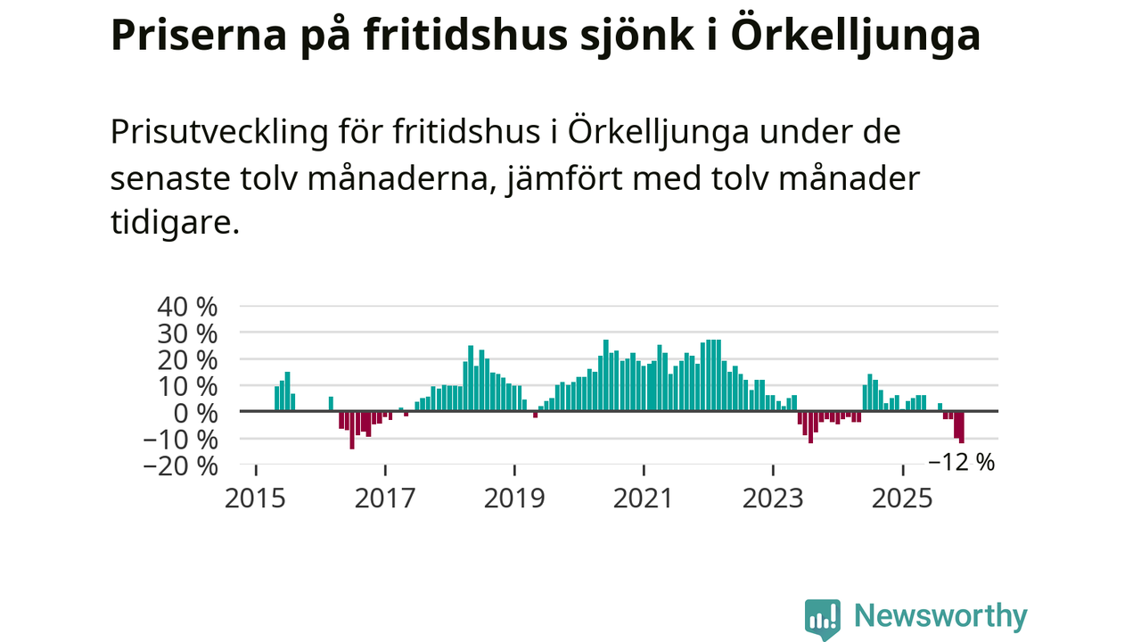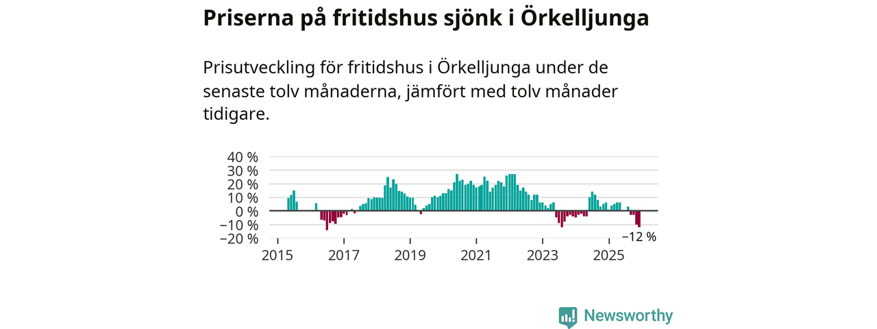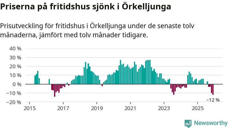Priserna på fritidshus har gått ner i Örkelljunga kommun. Medelpriset på försäljningarna under de senaste tolv månaderna visar på en nedgång med 12 procent.