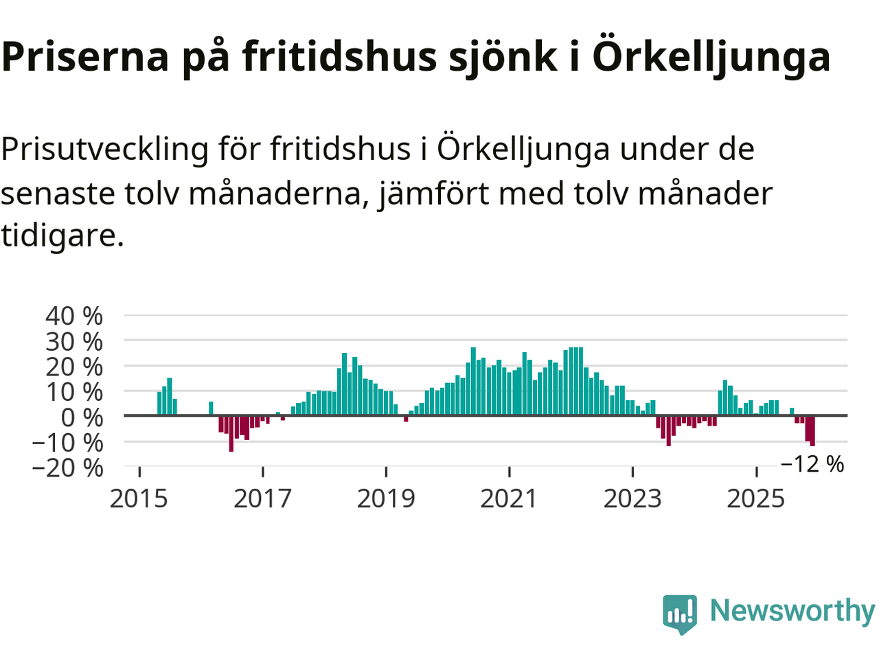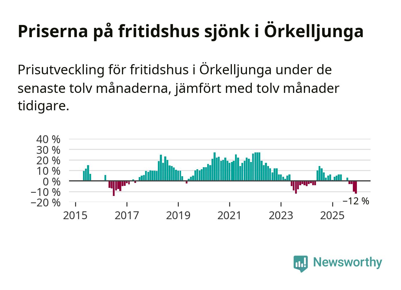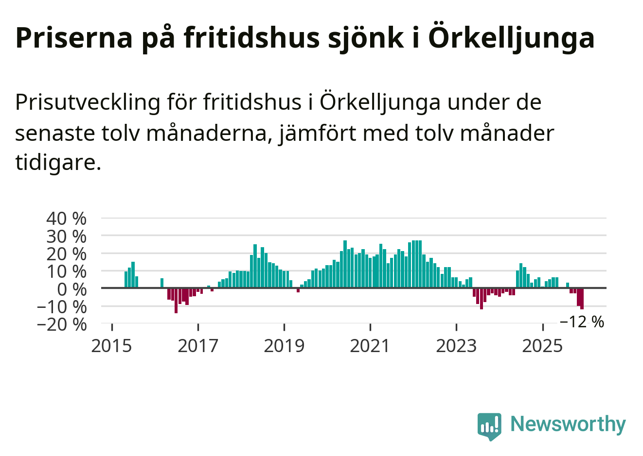 Priserna på fritidshus har gått ner i Örkelljunga kommun. Medelpriset på försäljningarna under de senaste tolv månaderna visar på en nedgång med 12 procent.