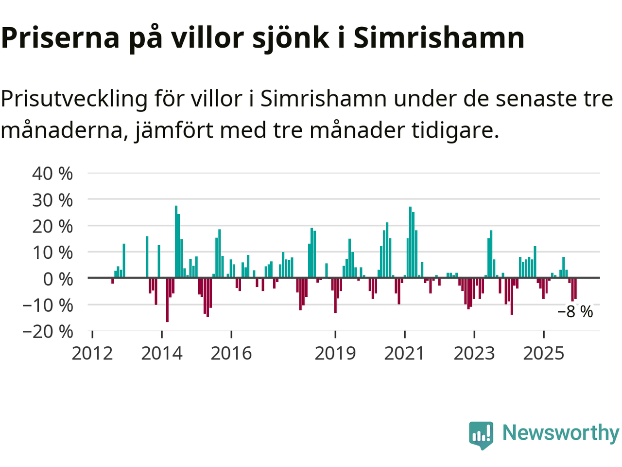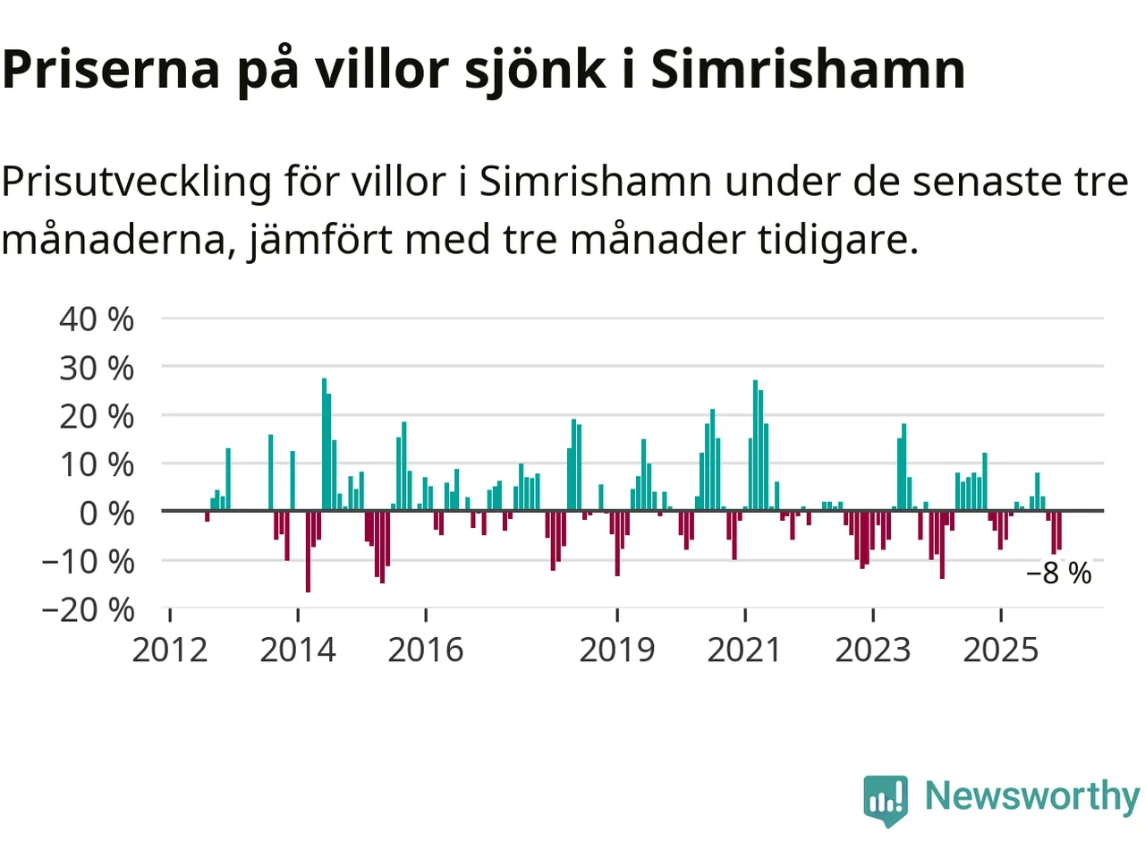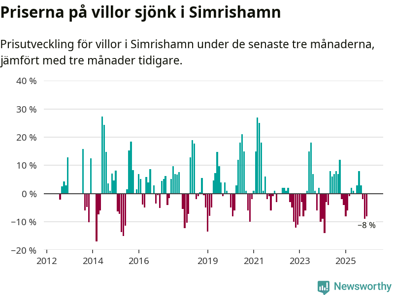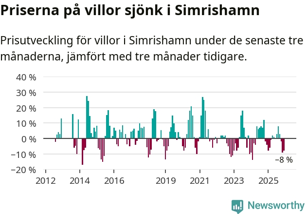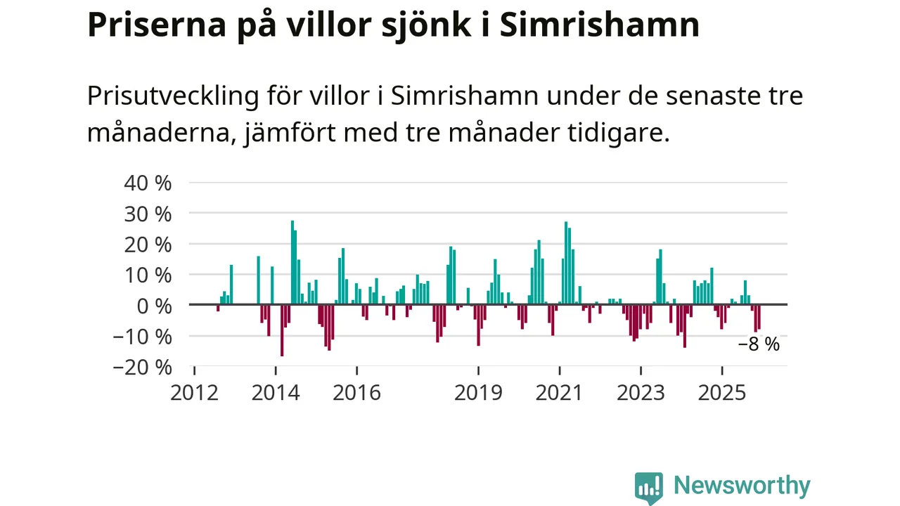 Statistiken visar även på en stor prisnedgång i Simrishamns kommun. Medelpriset på försäljningarna av villor i kommunen var 8 procent lägre än för tre månader sedan. Även i hela Skåne sjunker villapriserna. I hela länet noterades en prisnedgång på 2 procent.