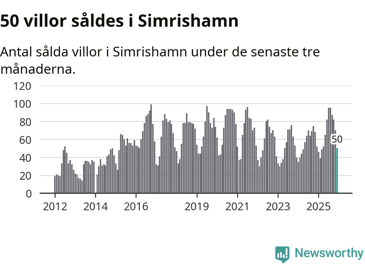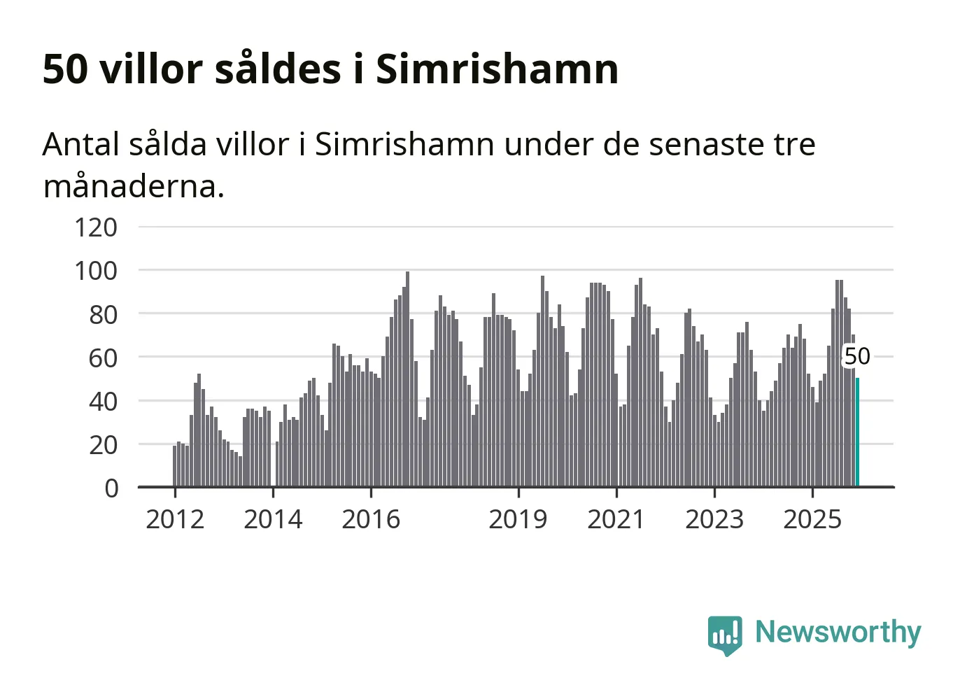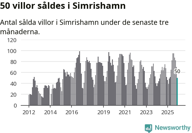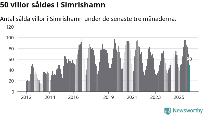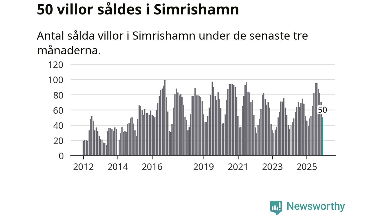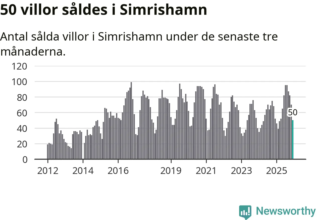 Mellan oktober och december såldes 50 villor i Simrishamns kommun. Det är relativt få sett till aktiviteten på bostadsmarknaden i kommunen under de senaste tolv månaderna, samt det historiska snittet för den här tiden på året.