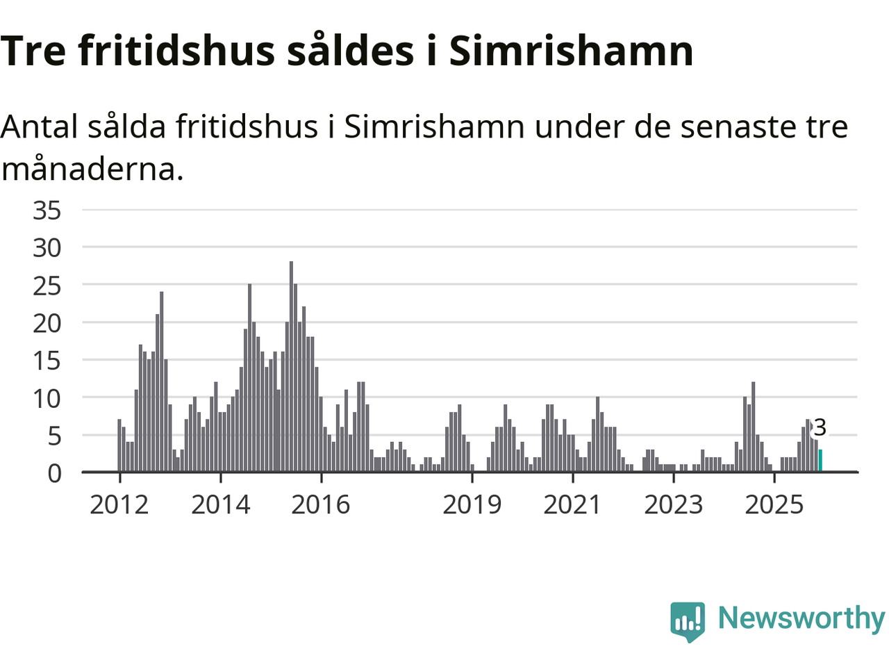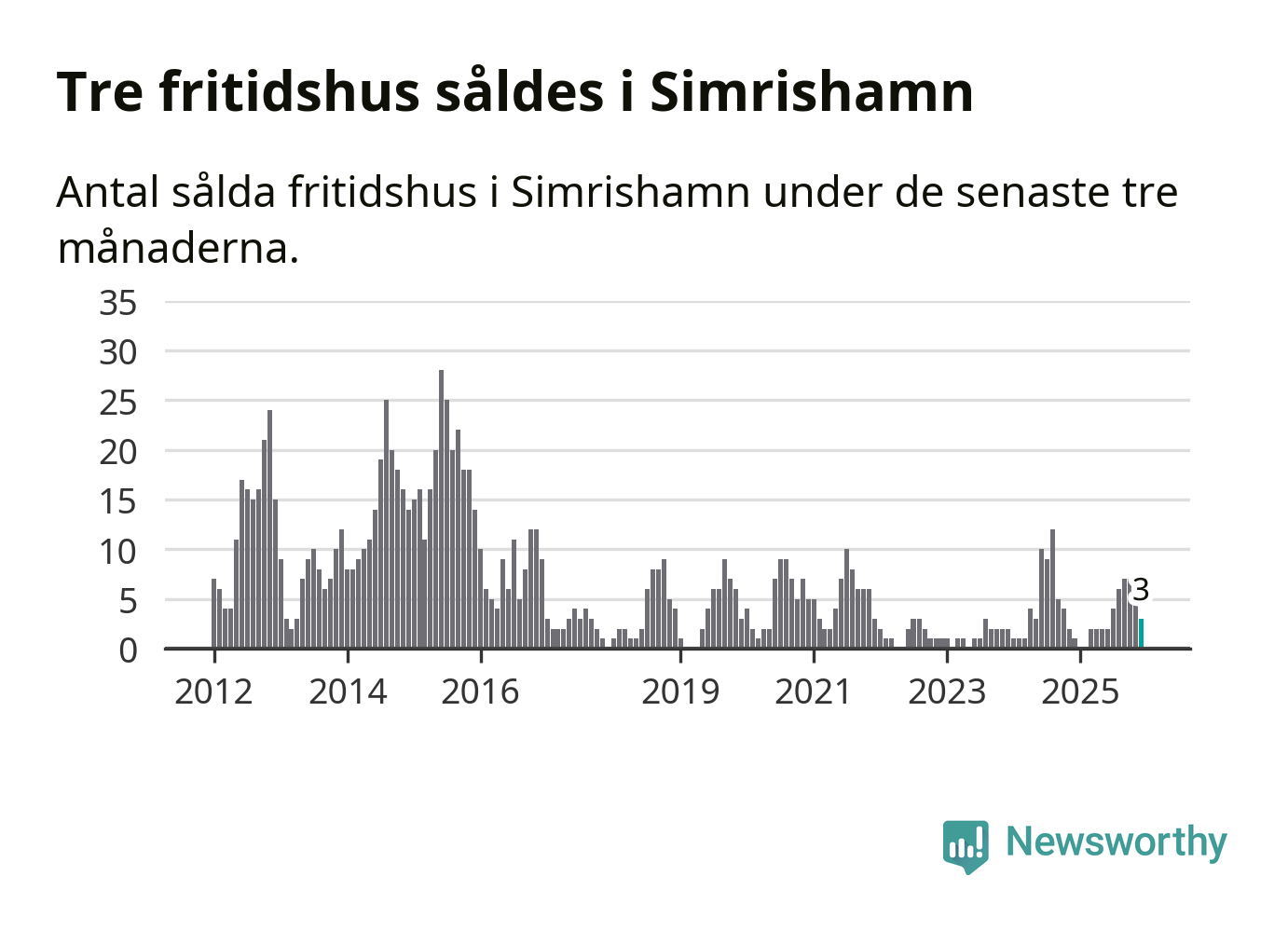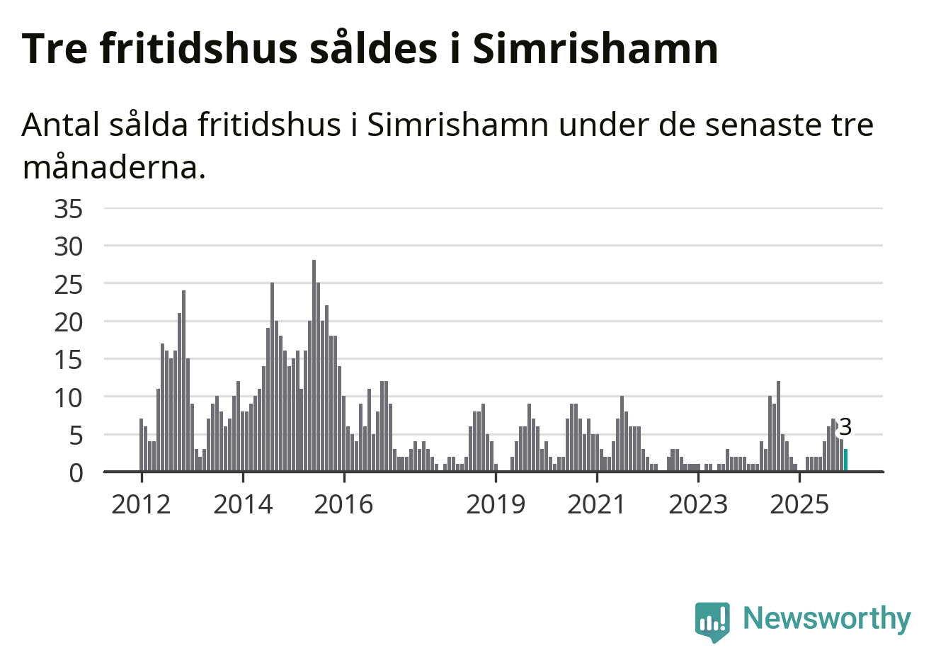 Mellan oktober och december gjordes sammanlagt tre affärer med fritidshus i Simrishamns kommun. Det kan jämföras med ett vid motsvarande tid i fjol.