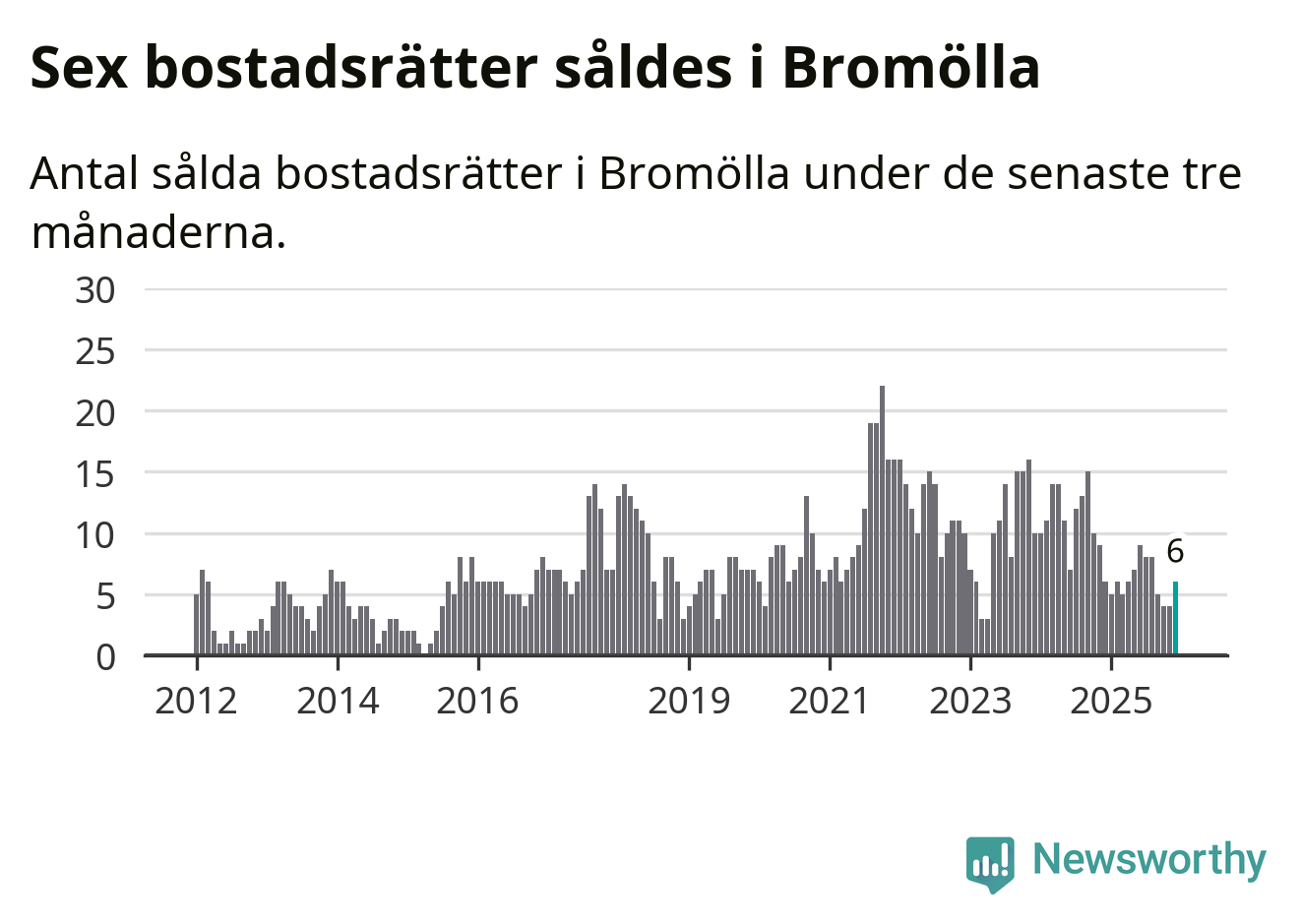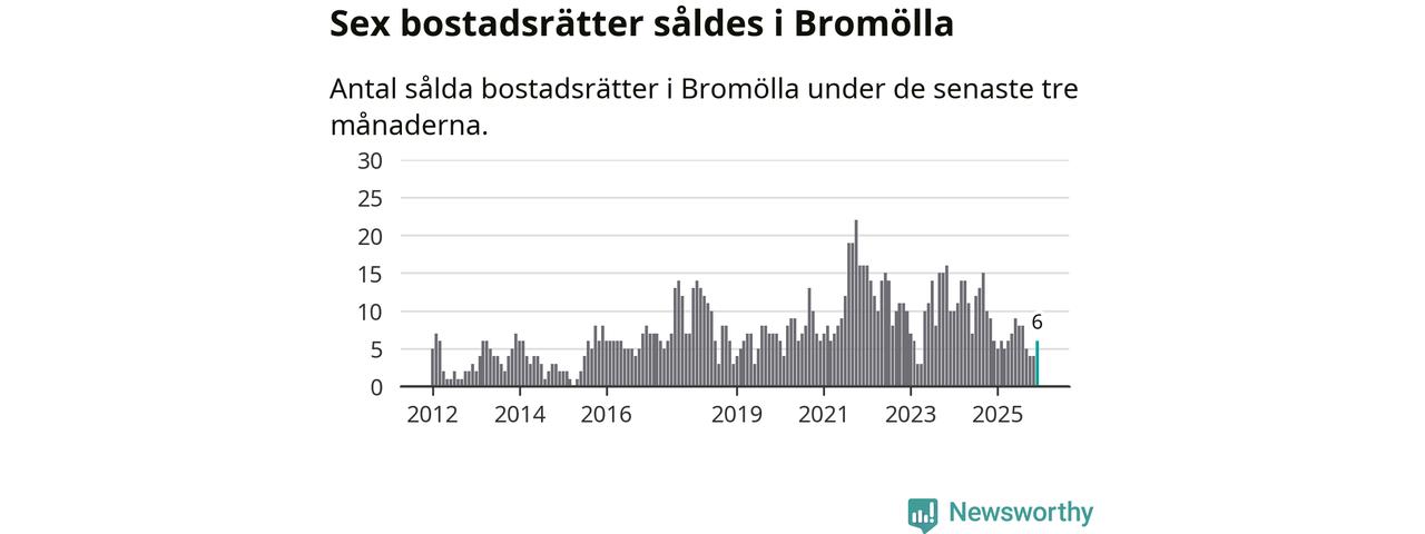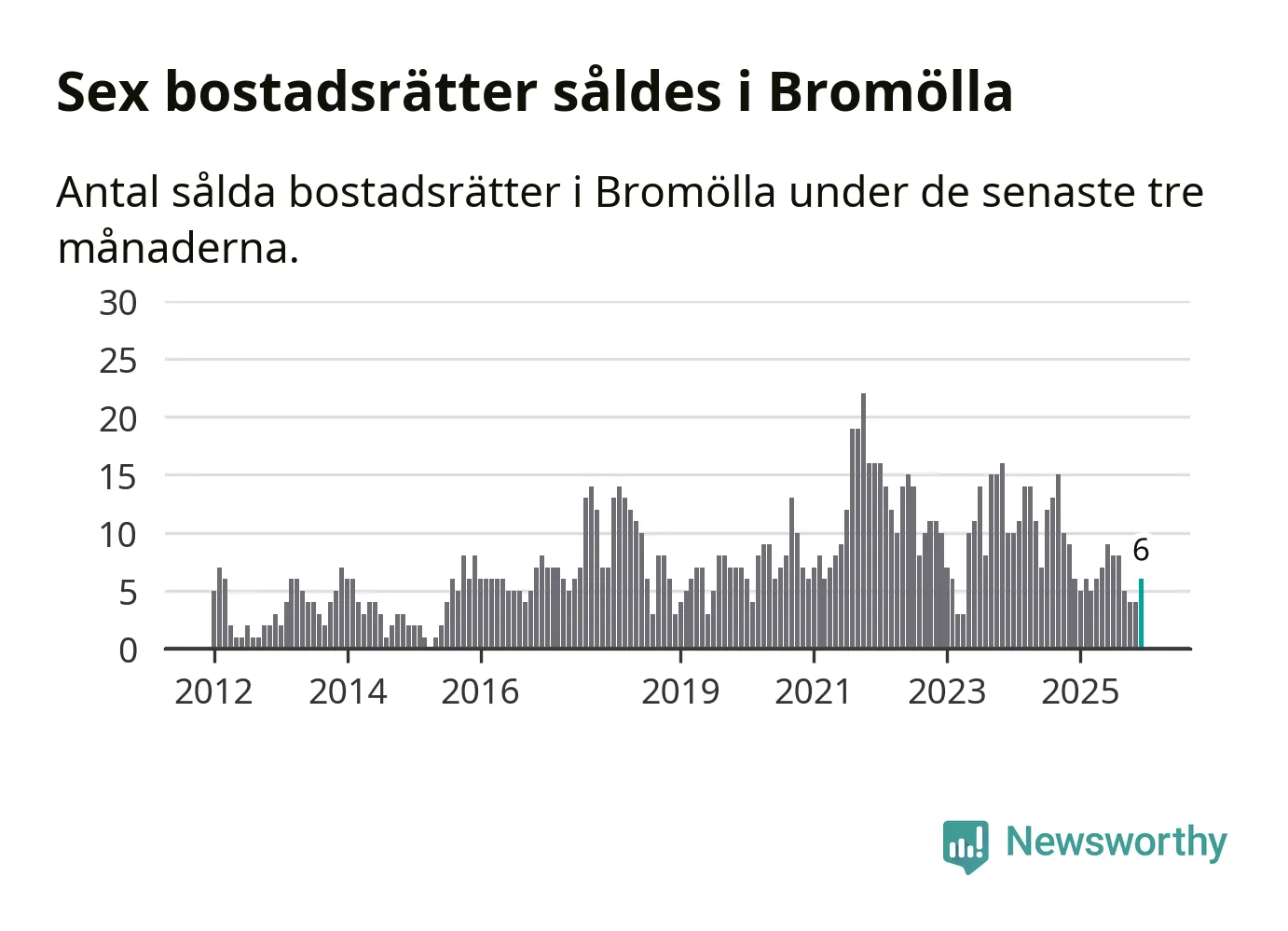 Mellan oktober och december gjordes sammanlagt sex affärer med bostadsrätter i Bromölla kommun. Det är lika många affärer som vid motsvarande tid i fjol.