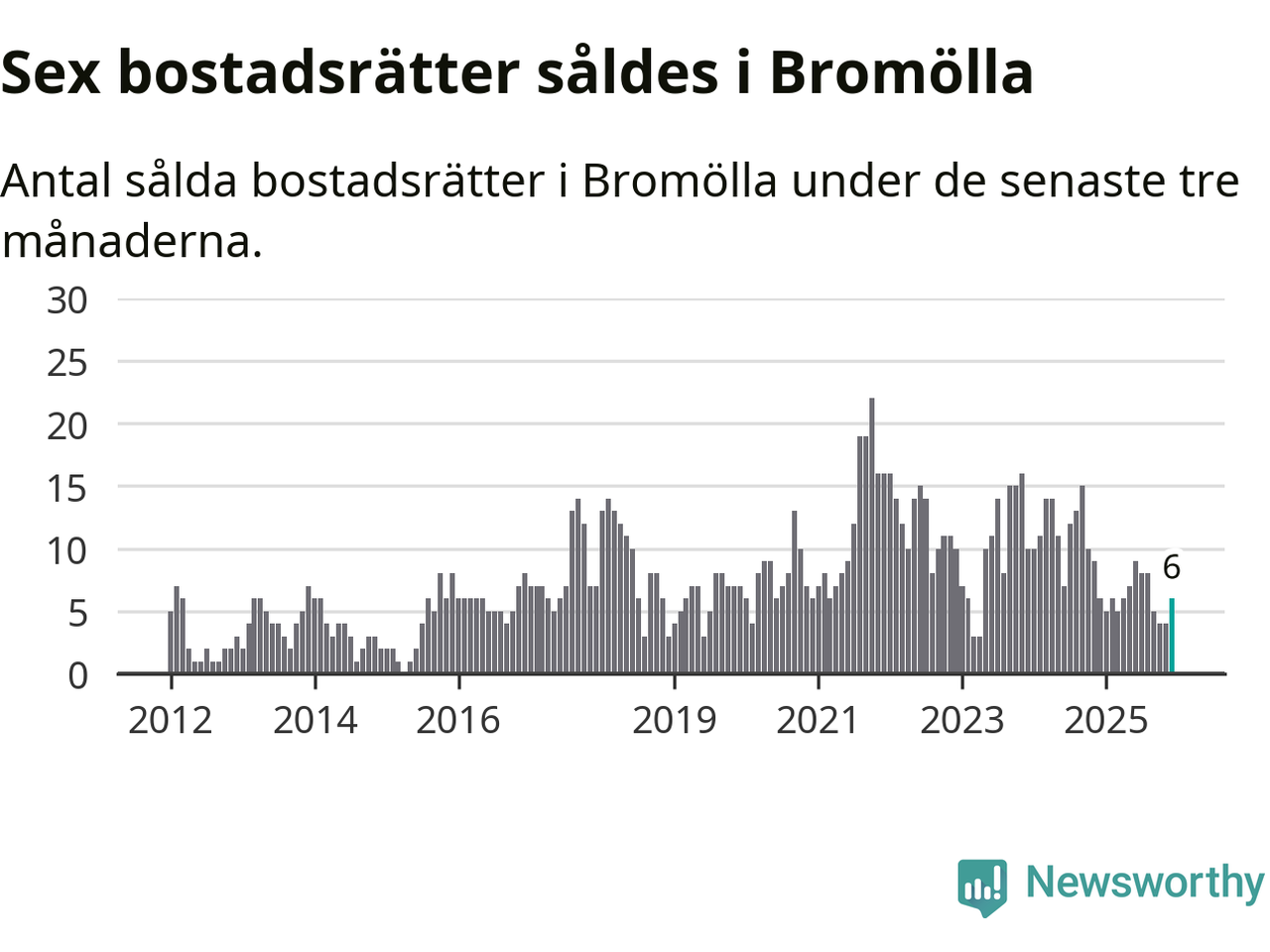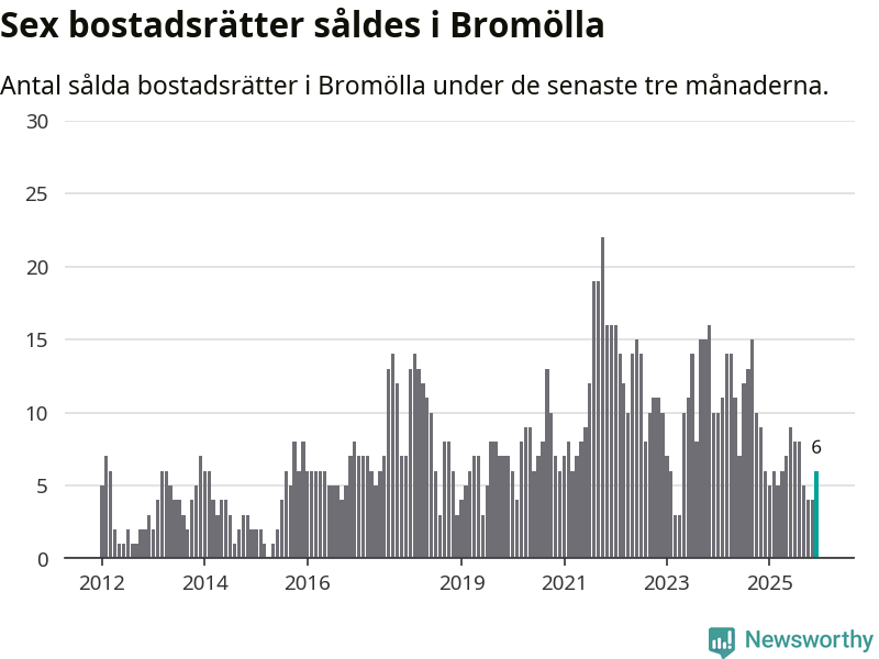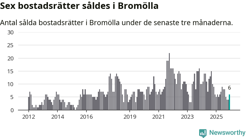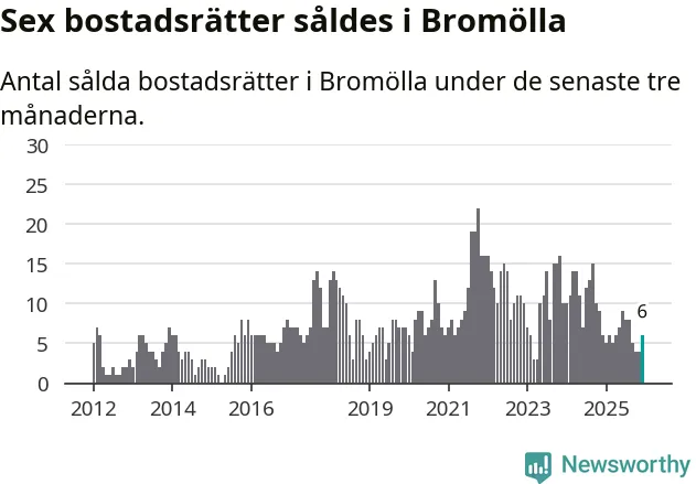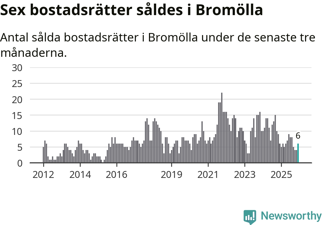 Mellan oktober och december gjordes sammanlagt sex affärer med bostadsrätter i Bromölla kommun. Det är lika många affärer som vid motsvarande tid i fjol.