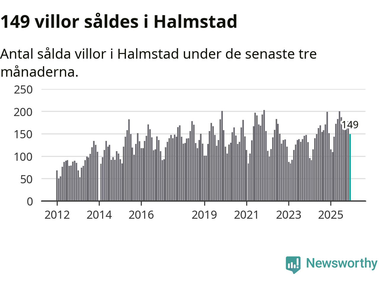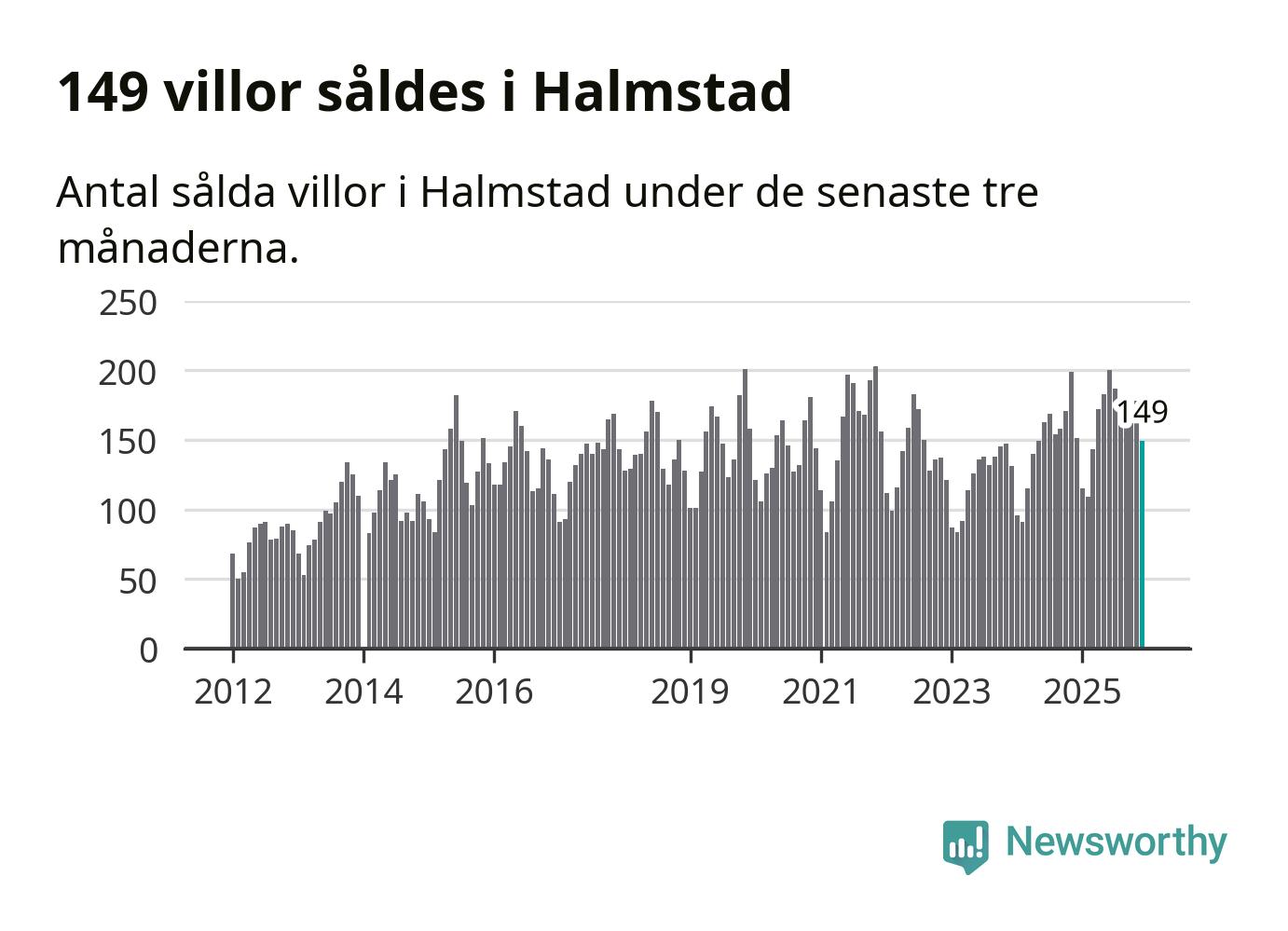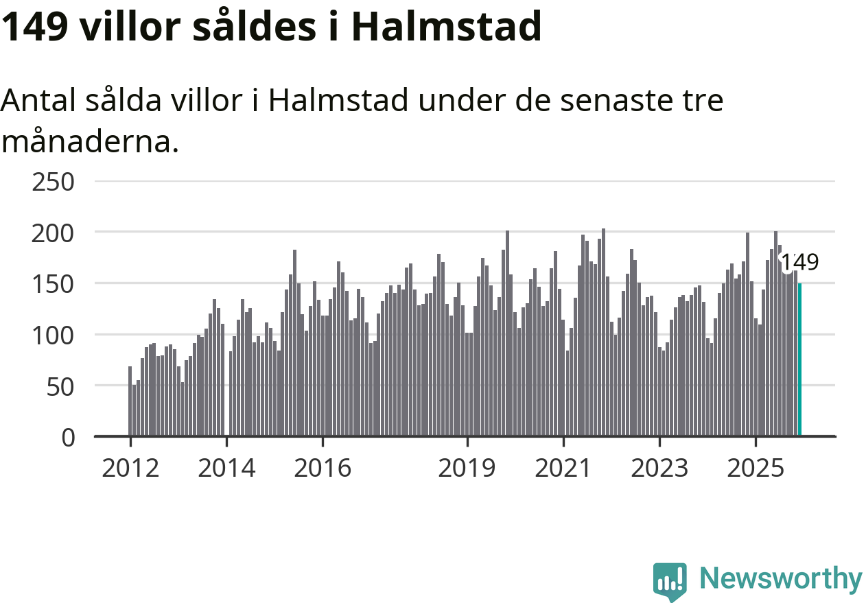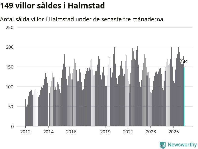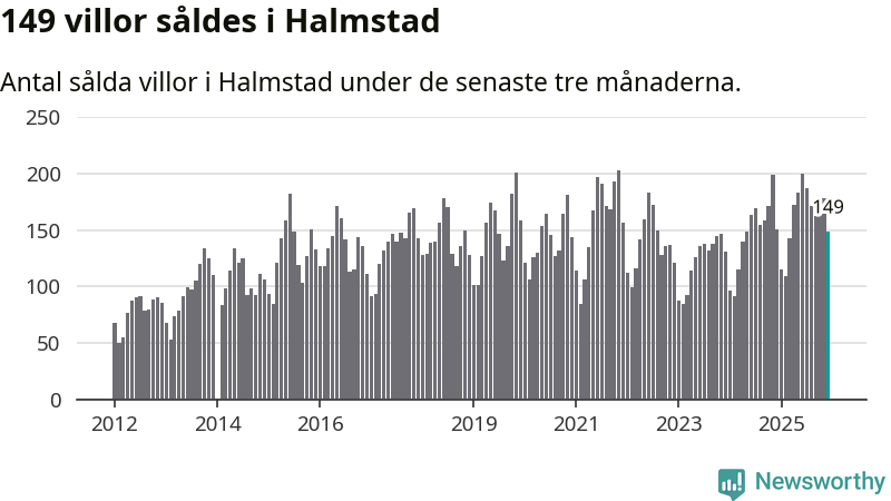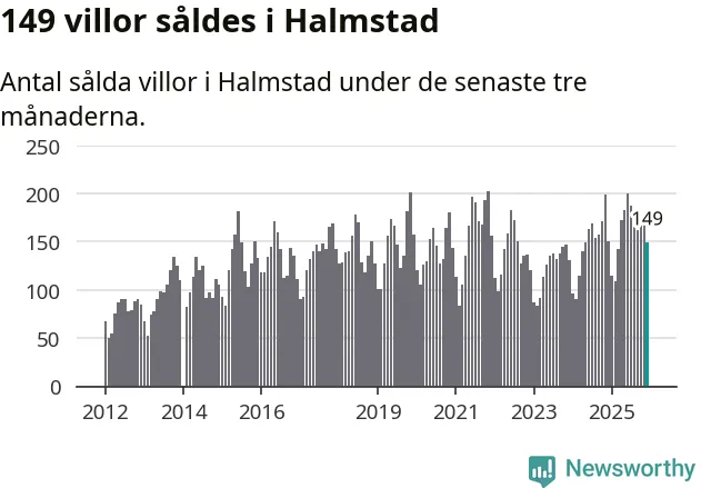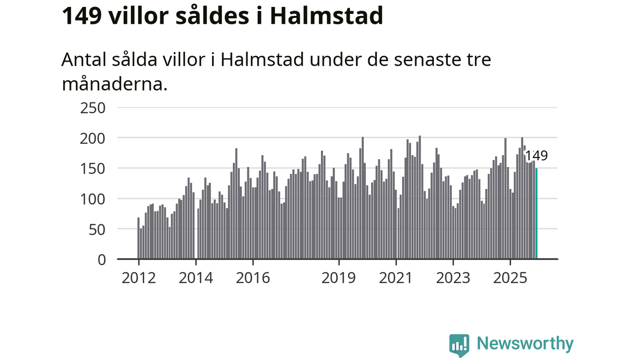 Sammanlagt såldes 149 villor i Halmstads kommun mellan oktober och december till ett genomsnittligt pris på 4,0 miljoner kronor. I fjol gjordes 151 affärer vid den här tiden på året.