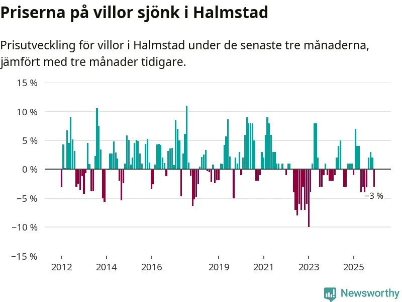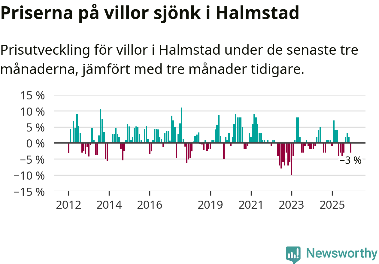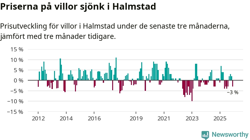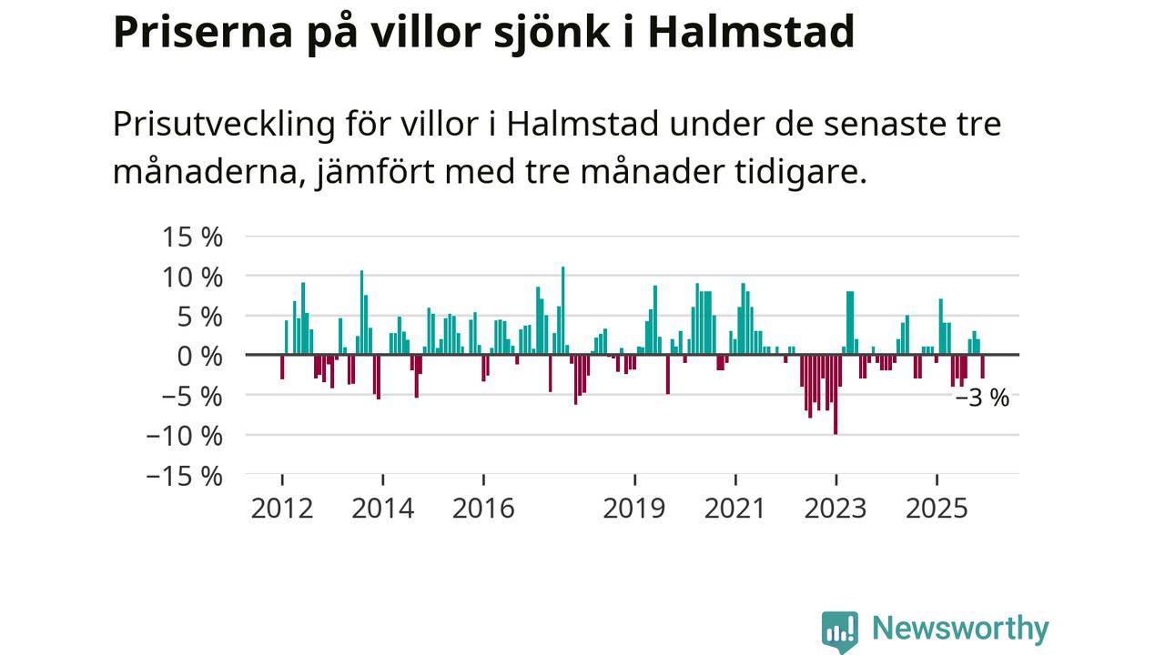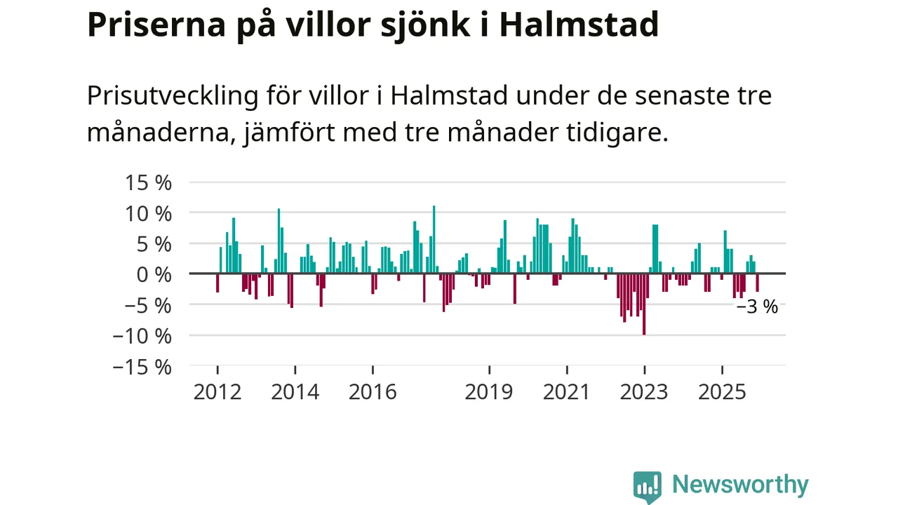 Villapriserna har gått ner i Halmstads kommun. Medelpriset på försäljningarna under de senaste tre månaderna visar på en nedgång med 3 procent.