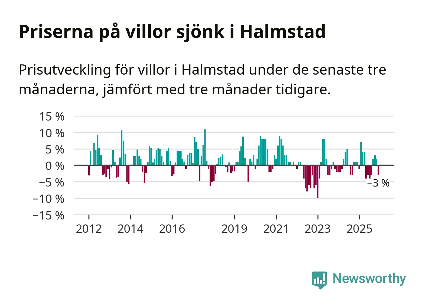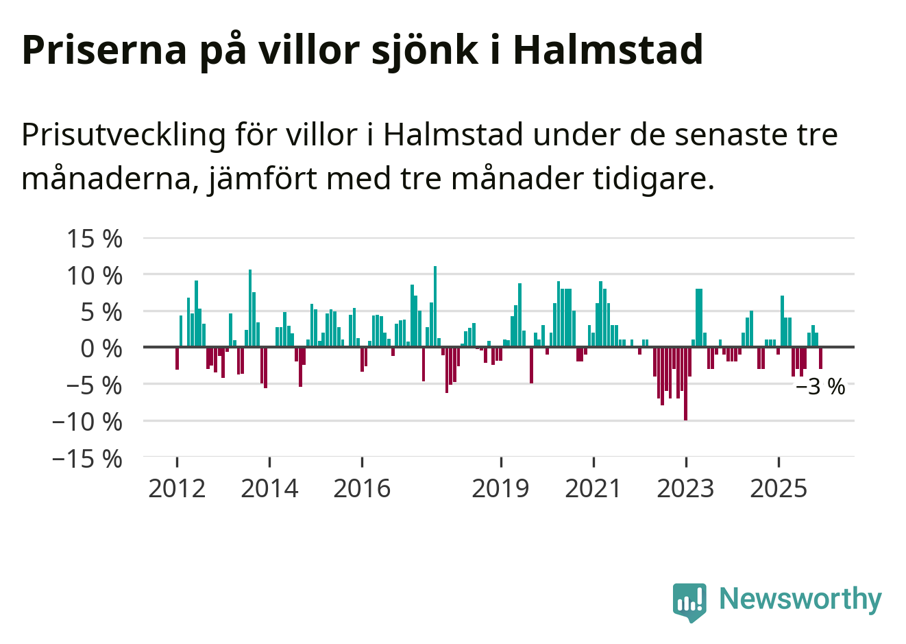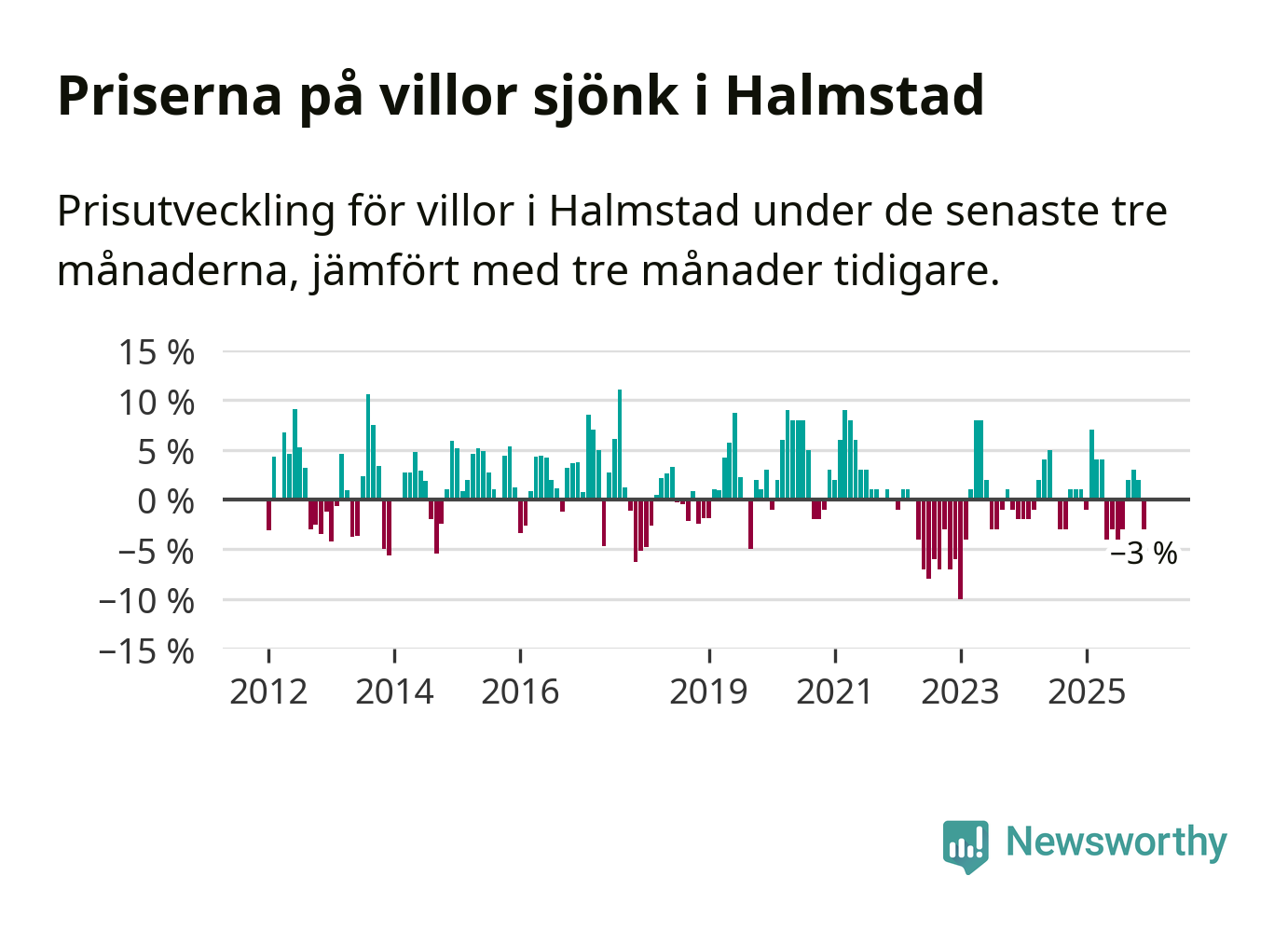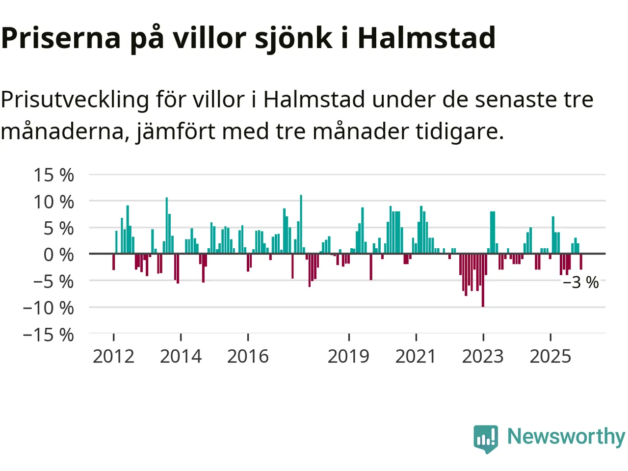 Villapriserna har gått ner i Halmstads kommun. Medelpriset på försäljningarna under de senaste tre månaderna visar på en nedgång med 3 procent.