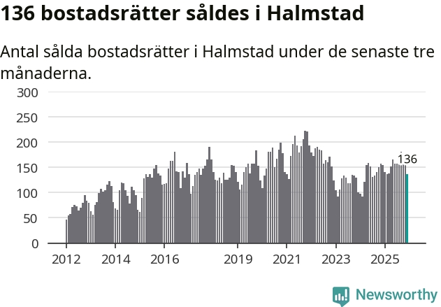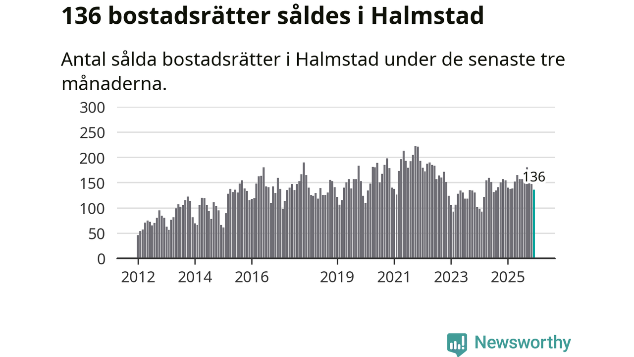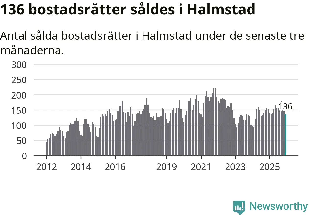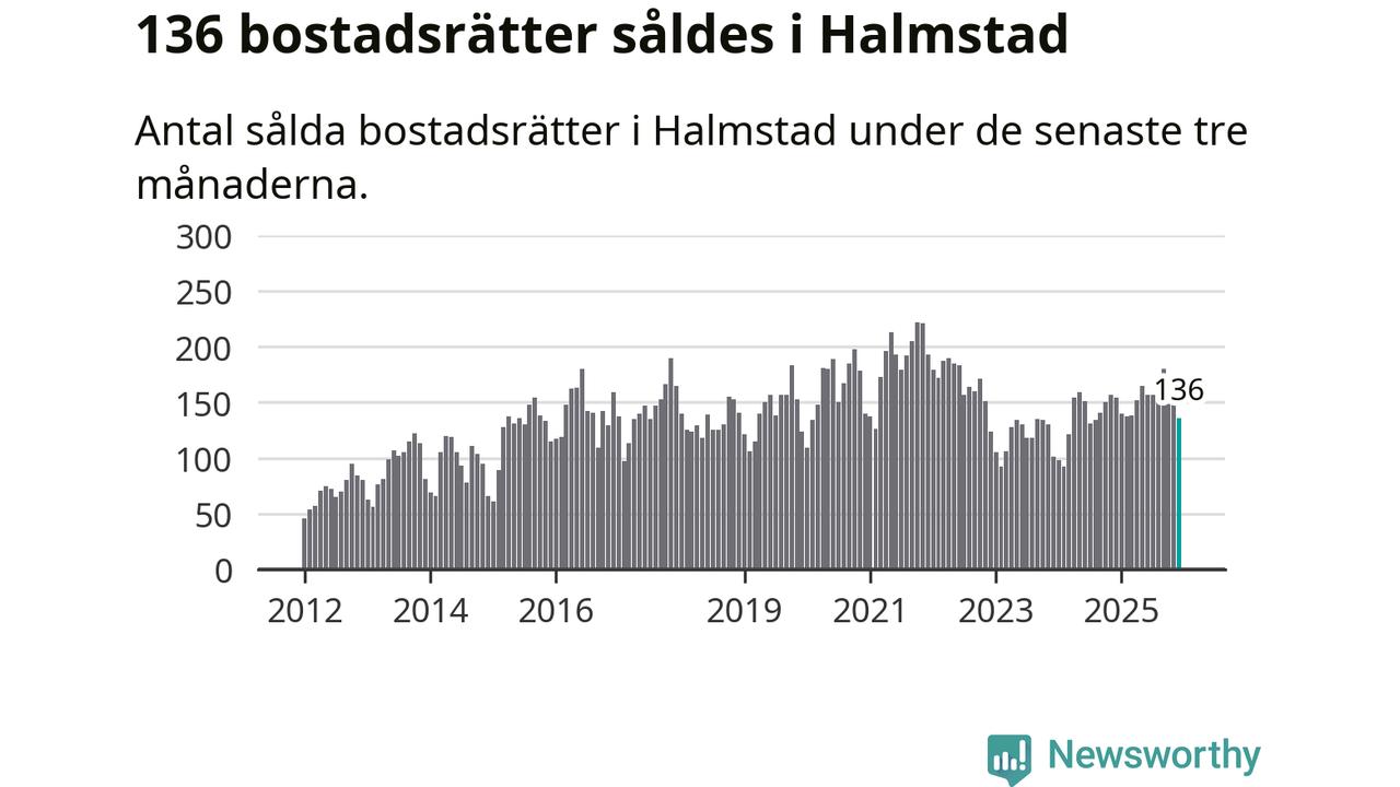 Sammanlagt såldes 136 bostadsrätter i Halmstads kommun mellan oktober och december till ett genomsnittligt pris på 2,2 miljoner kronor. I fjol gjordes 154 affärer vid den här tiden på året.