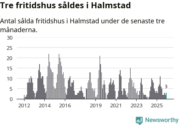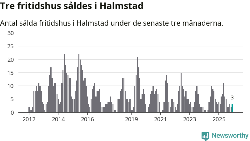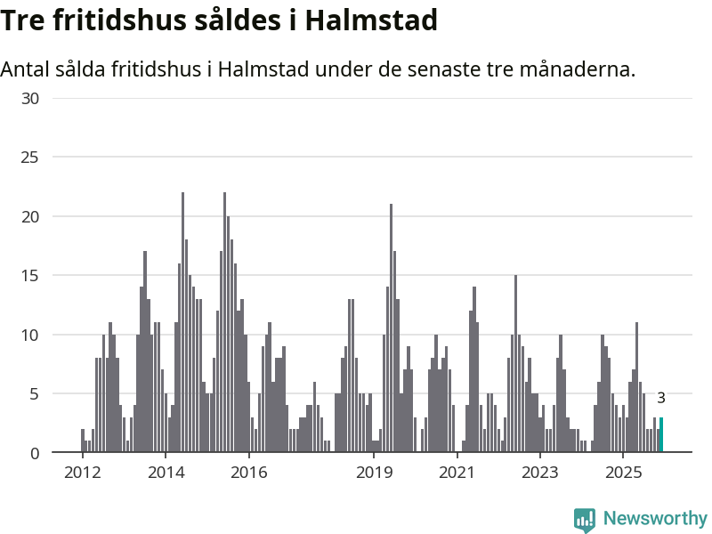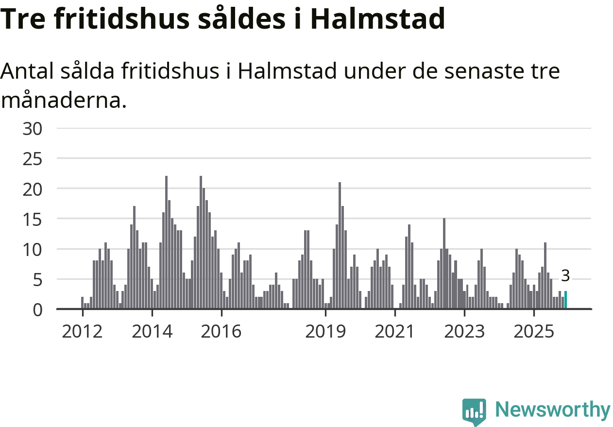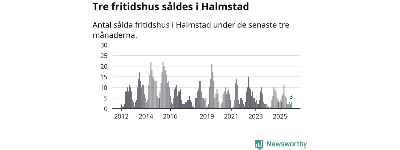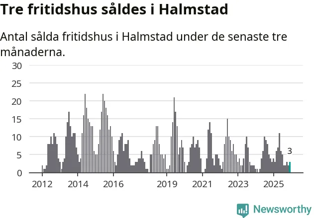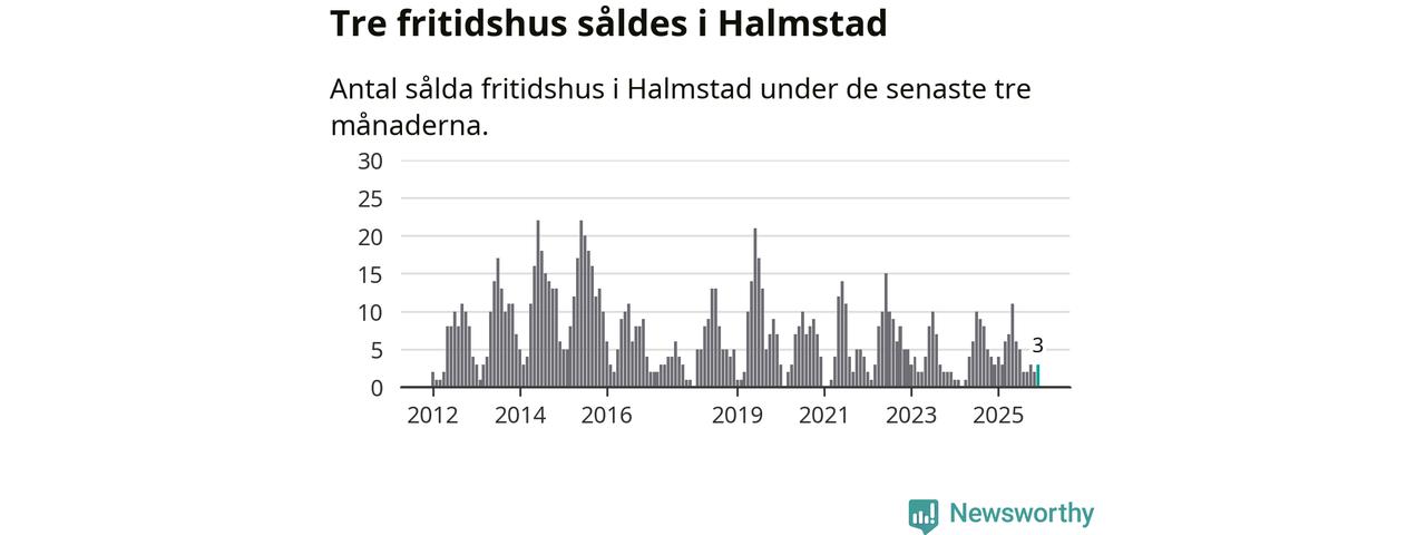 Mellan oktober och december gjordes sammanlagt tre affärer med fritidshus i Halmstads kommun. Det är lika många affärer som vid motsvarande tid i fjol.