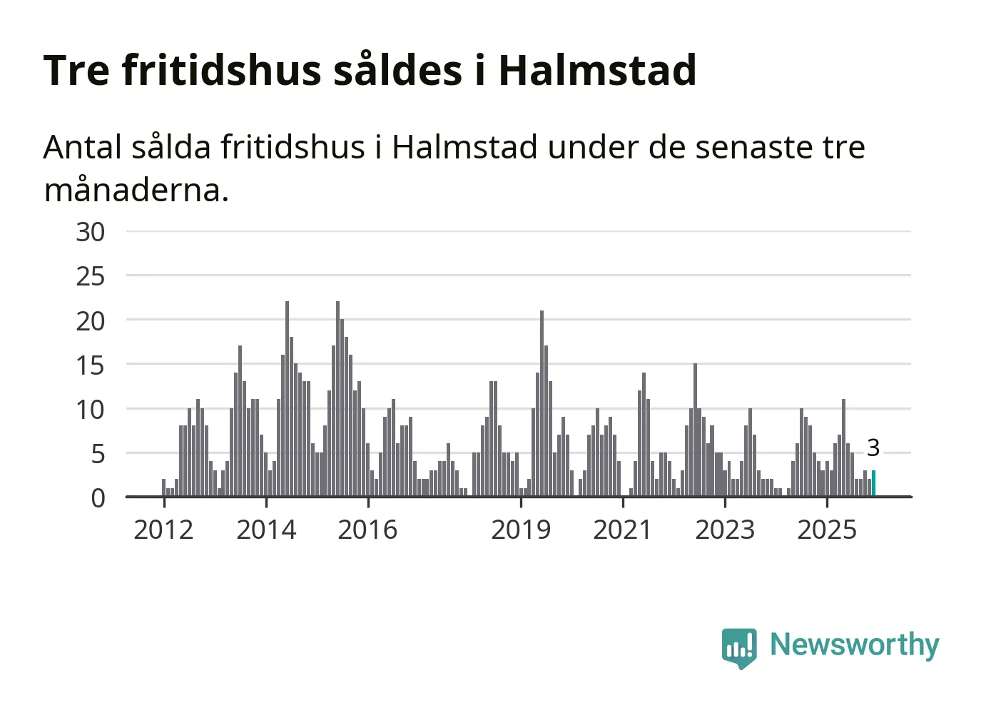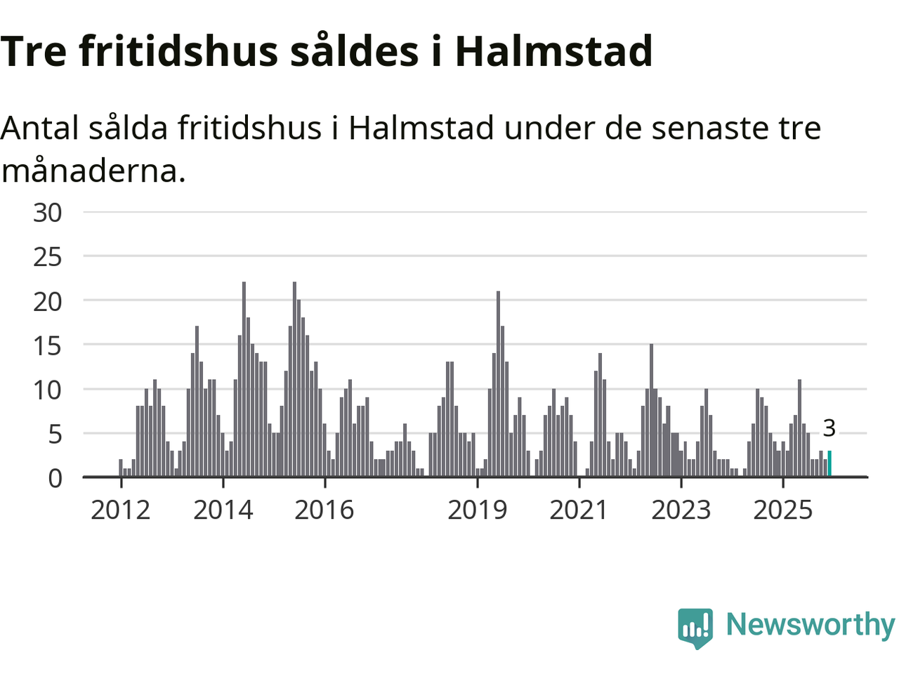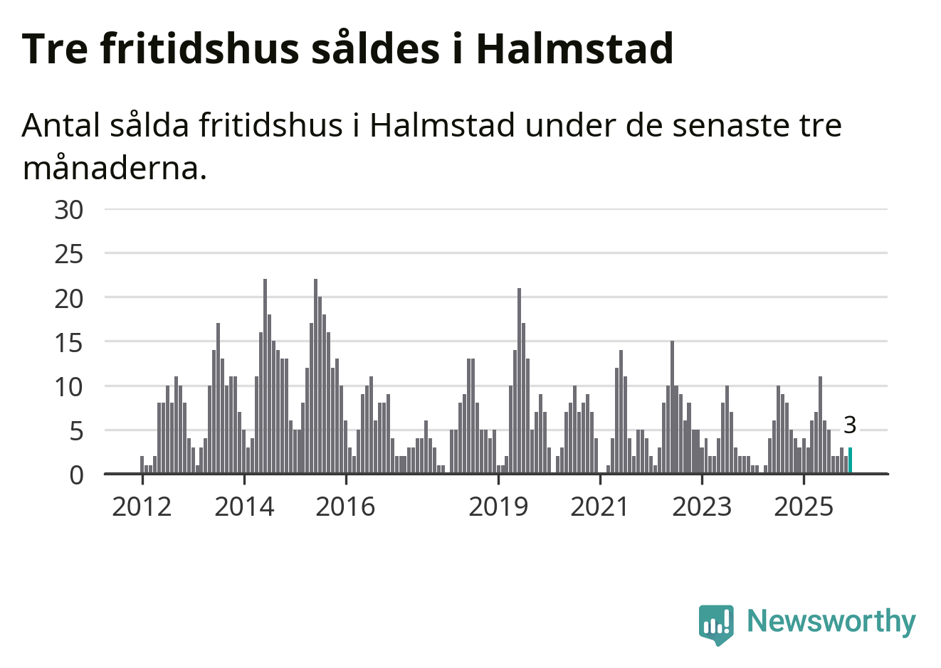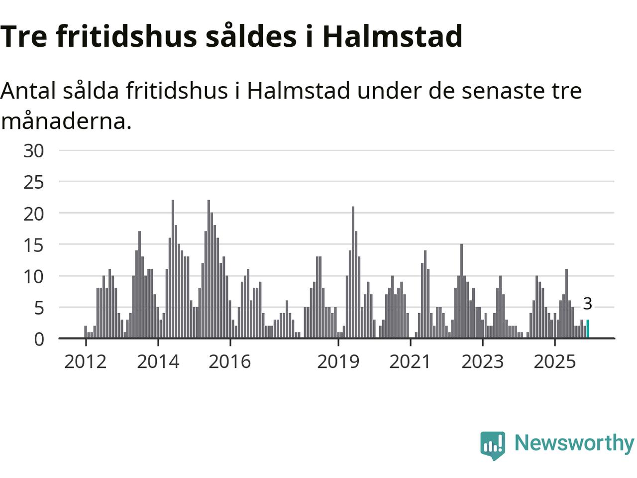 Mellan oktober och december gjordes sammanlagt tre affärer med fritidshus i Halmstads kommun. Det är lika många affärer som vid motsvarande tid i fjol.