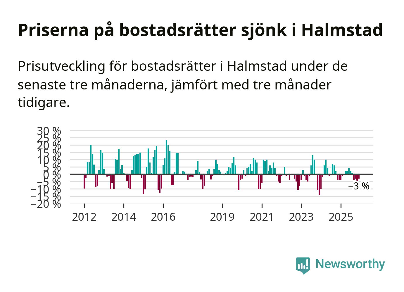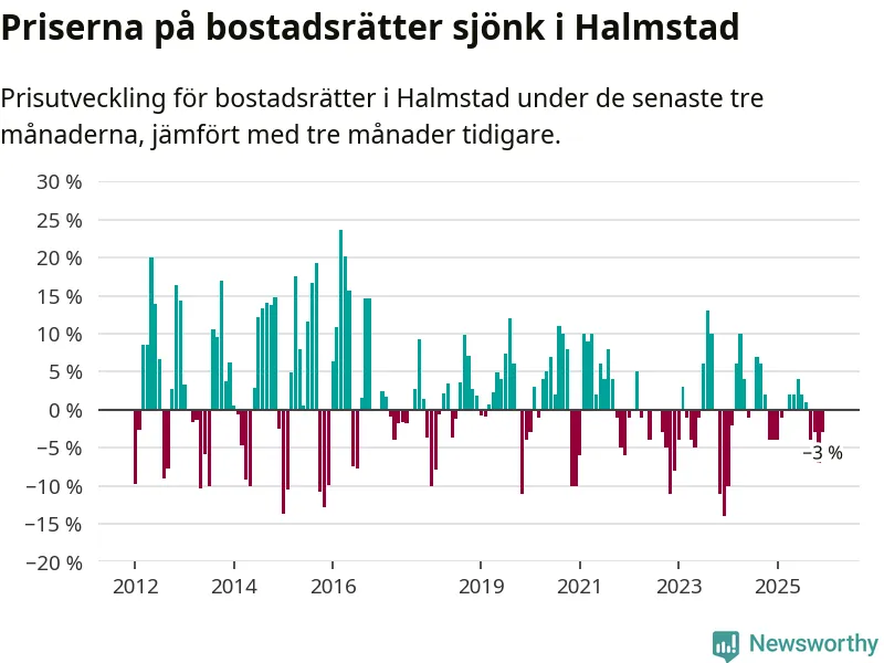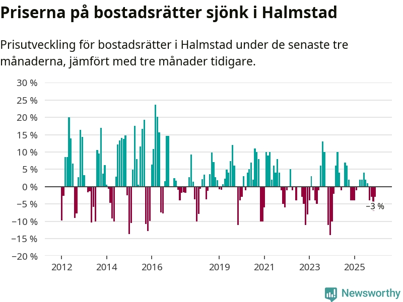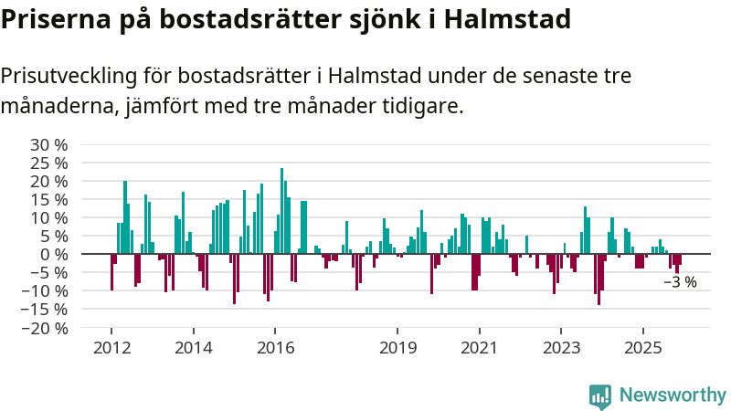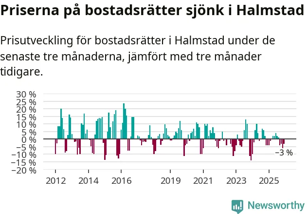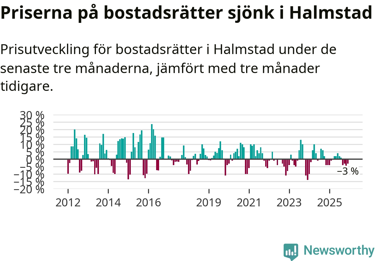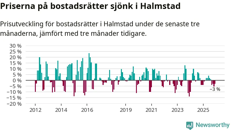 Priserna på bostadsrätter har gått ner i Halmstads kommun. Medelpriset på försäljningarna under de senaste tre månaderna visar på en nedgång med 3 procent.