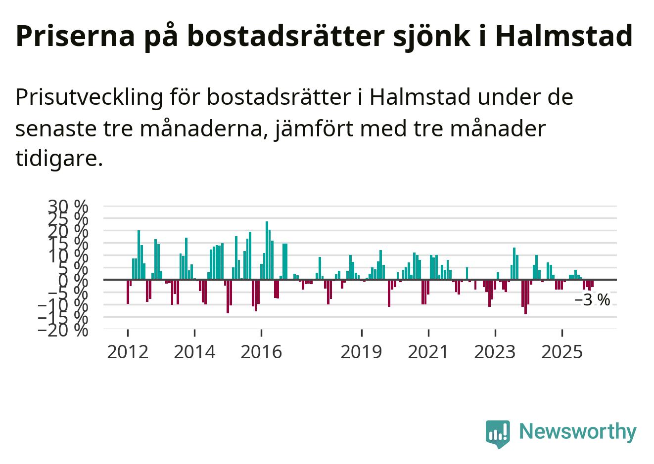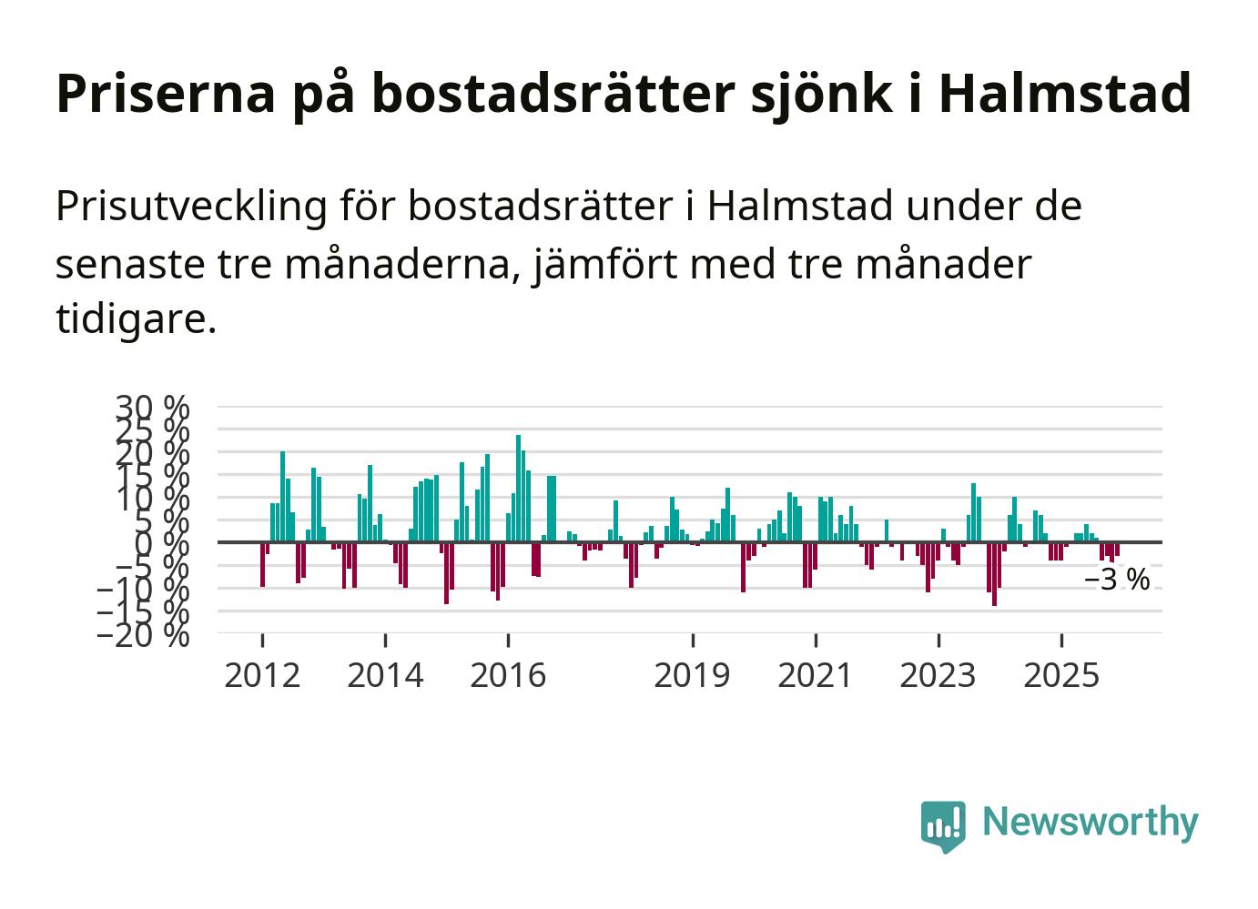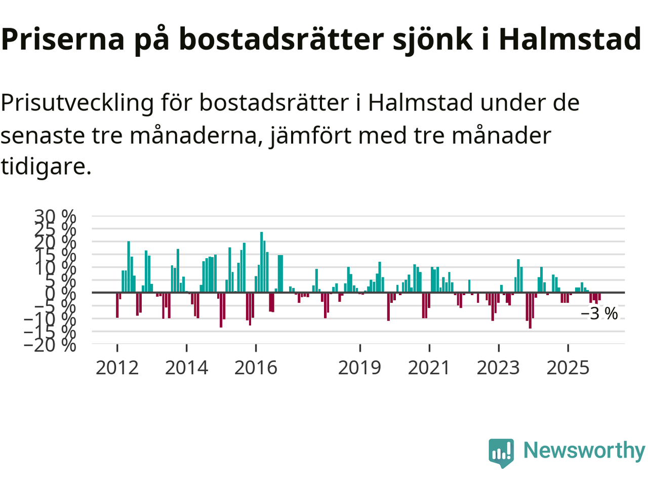 Priserna på bostadsrätter har gått ner i Halmstads kommun. Medelpriset på försäljningarna under de senaste tre månaderna visar på en nedgång med 3 procent.