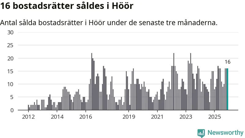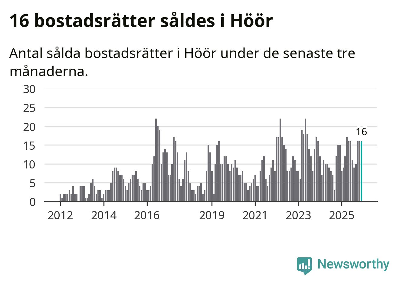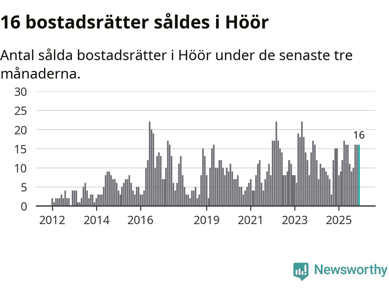 Mellan oktober och december gjordes sammanlagt 16 affärer med bostadsrätter i Höörs kommun. Det kan jämföras med 15 vid motsvarande tid i fjol.