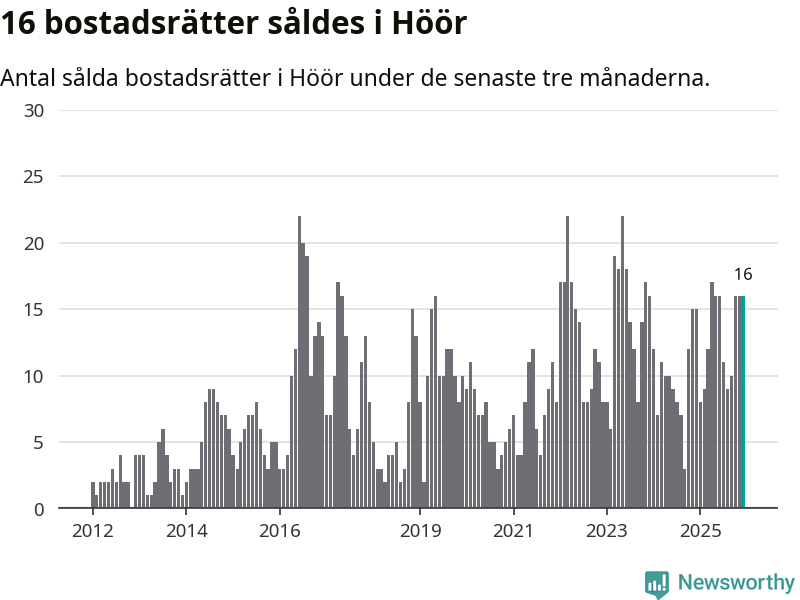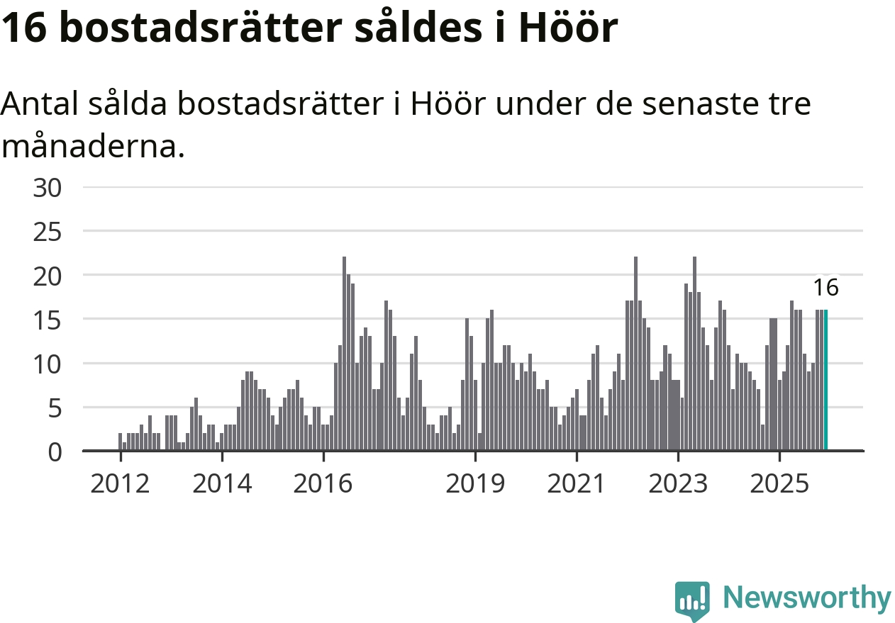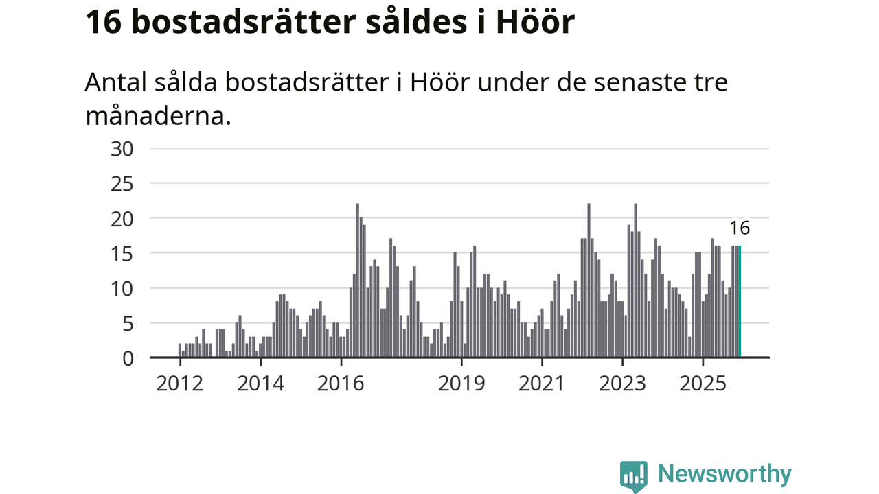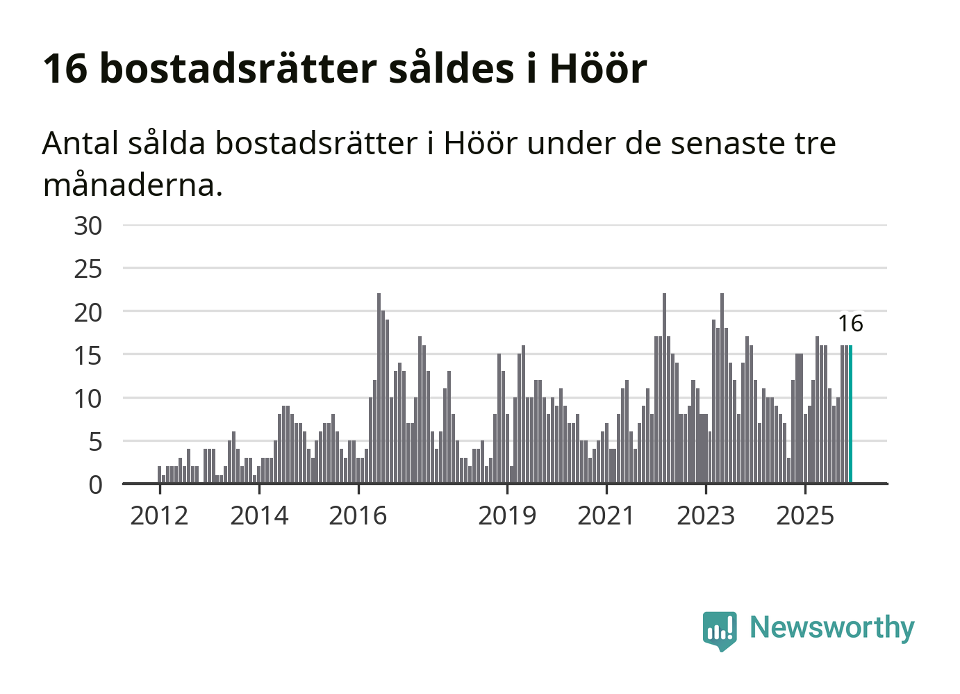 Mellan oktober och december gjordes sammanlagt 16 affärer med bostadsrätter i Höörs kommun. Det kan jämföras med 15 vid motsvarande tid i fjol.