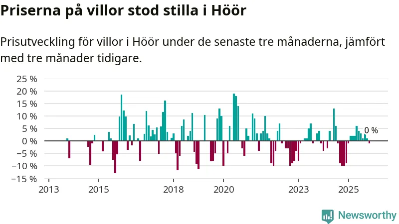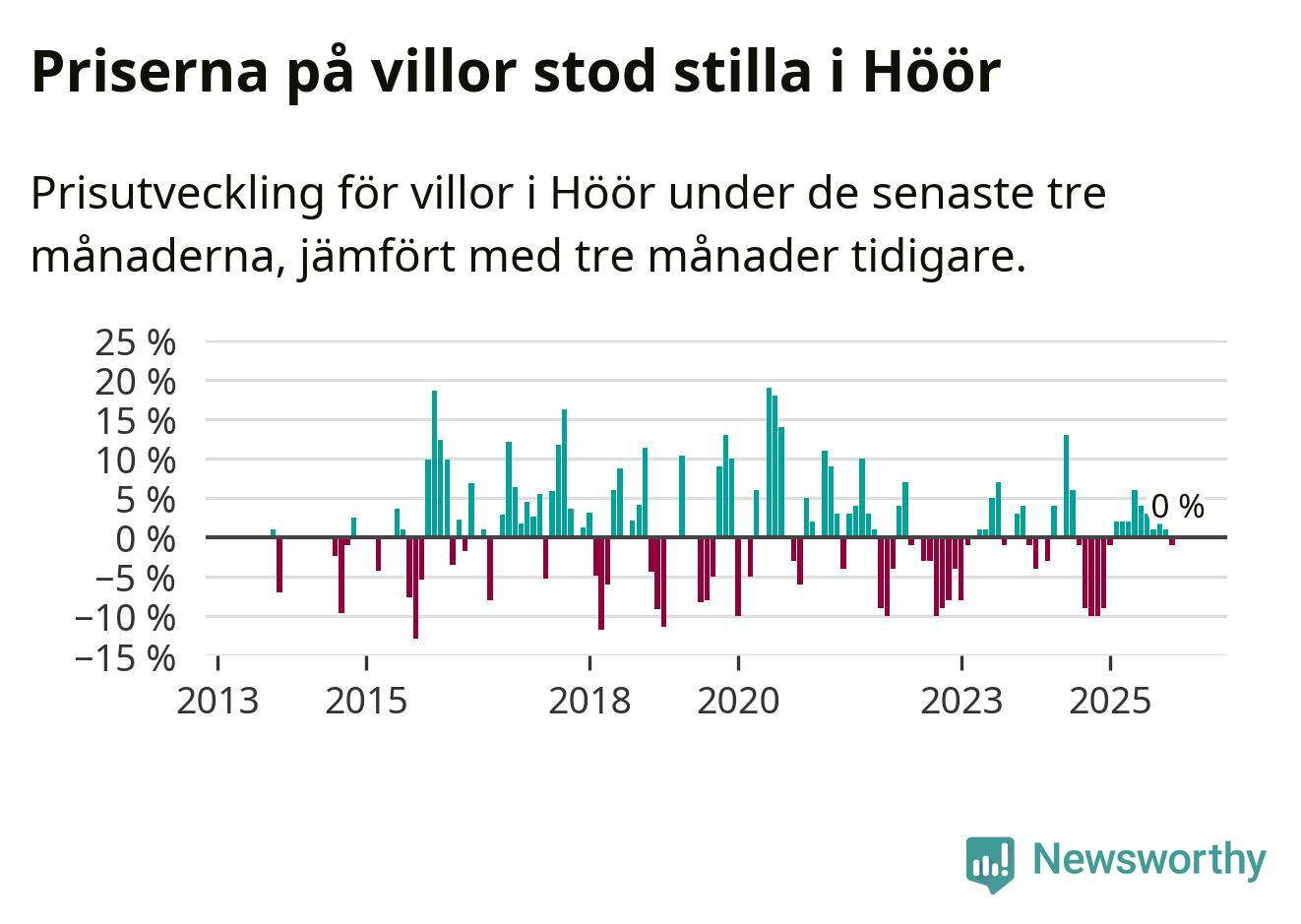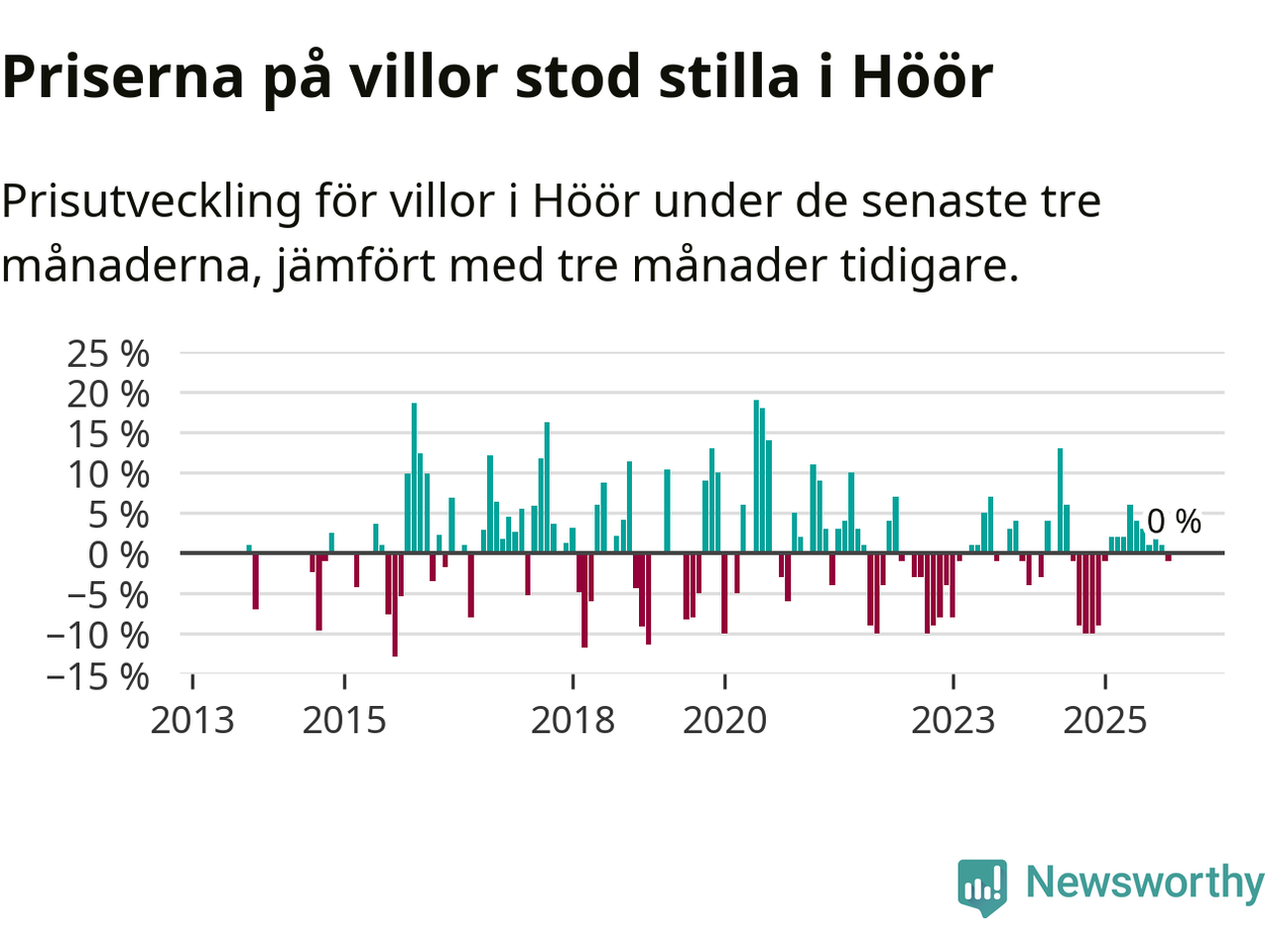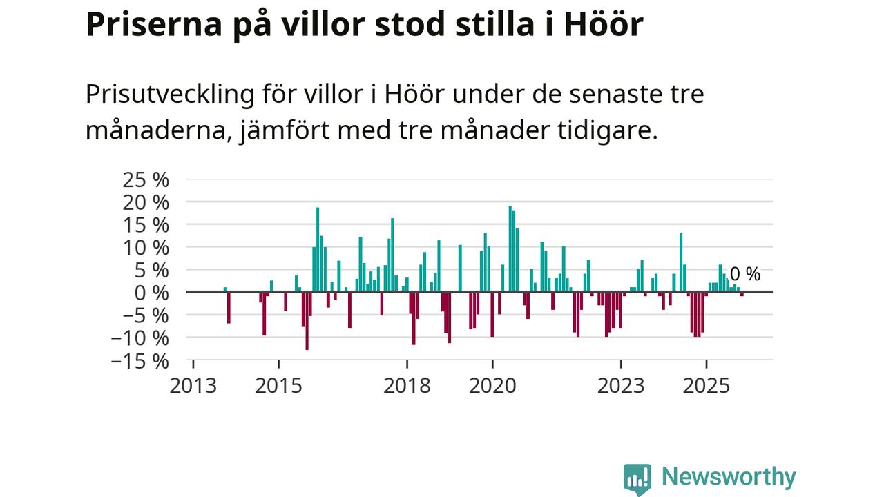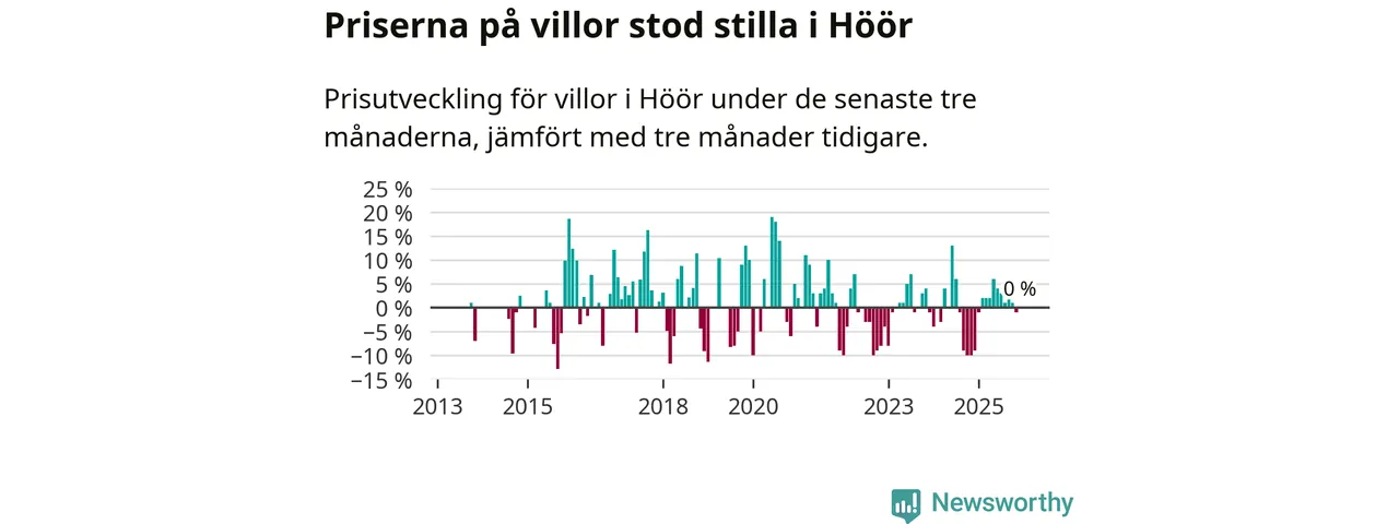 Villapriserna står i stort sett stilla i Höörs kommun. Medelpriset på de på försäljningarna under de senaste tre månaderna låg på samma nivå som för tre månader sedan.