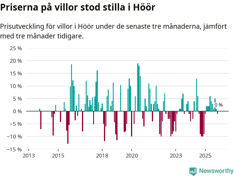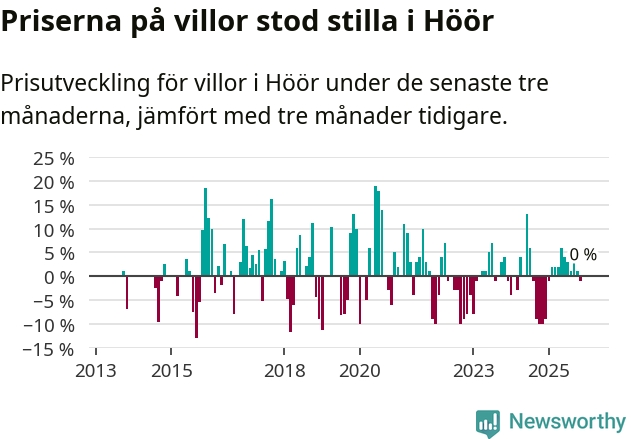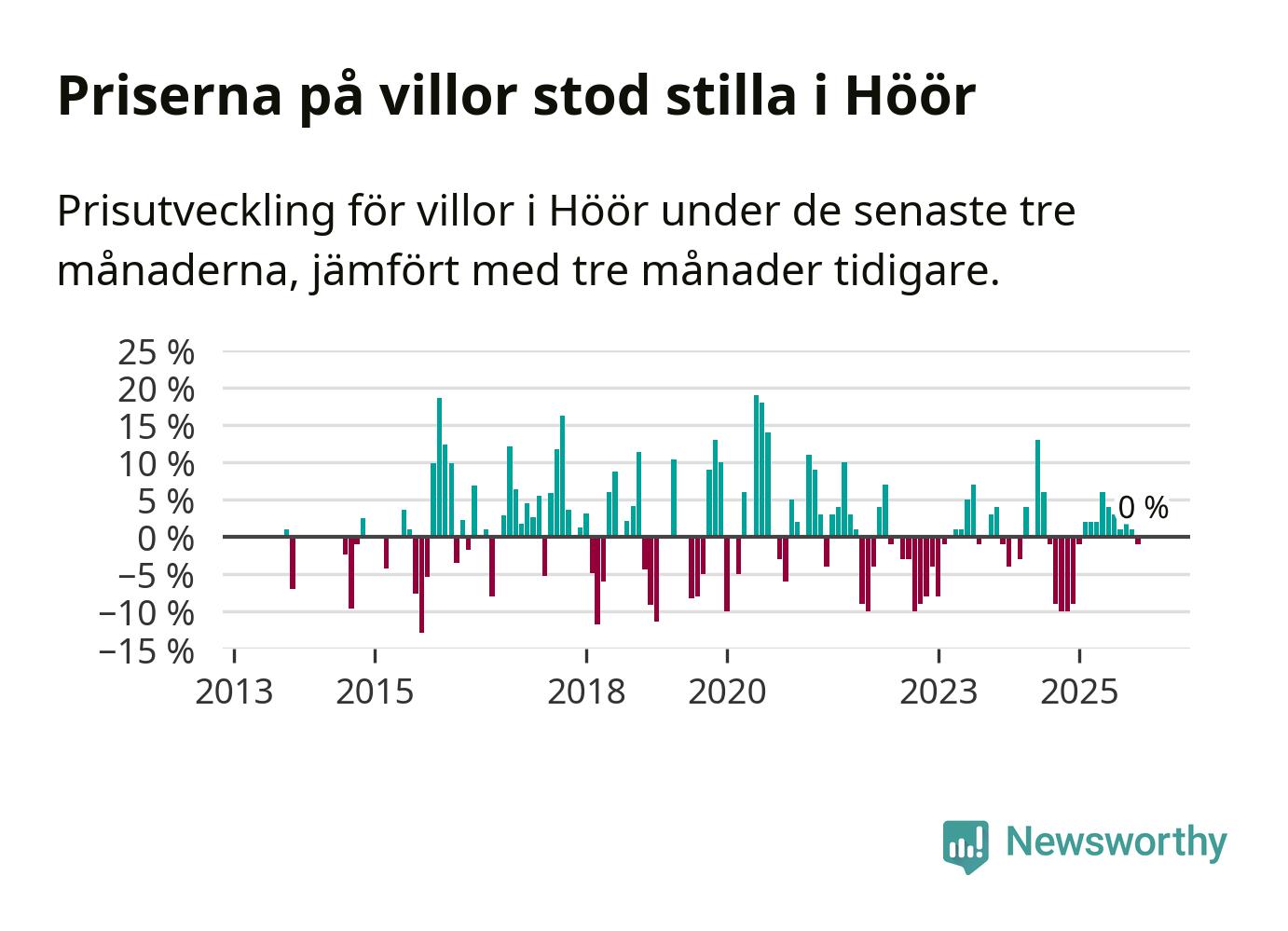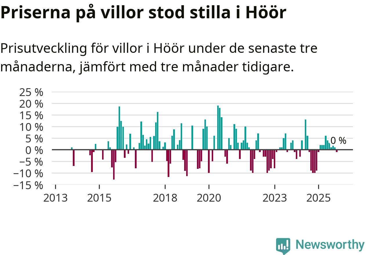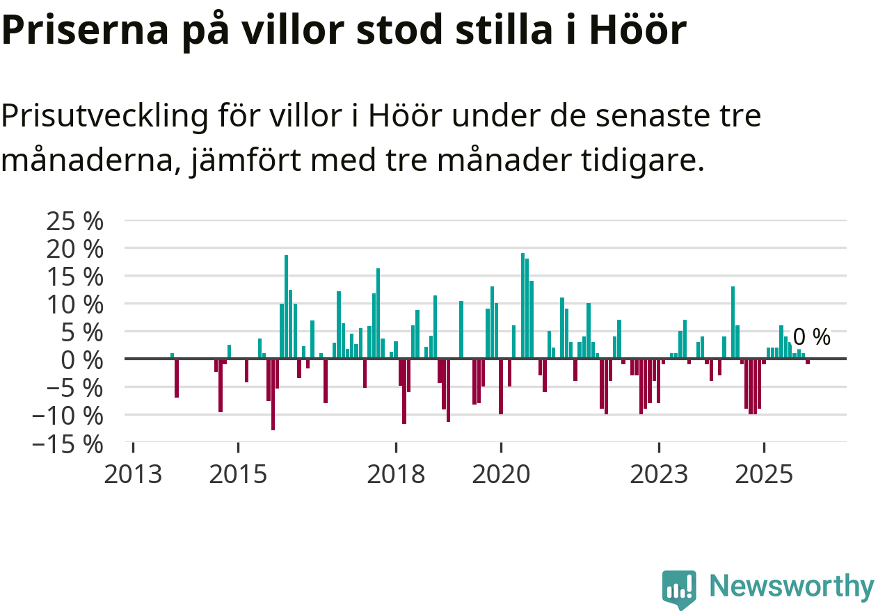 Villapriserna står i stort sett stilla i Höörs kommun. Medelpriset på de på försäljningarna under de senaste tre månaderna låg på samma nivå som för tre månader sedan.