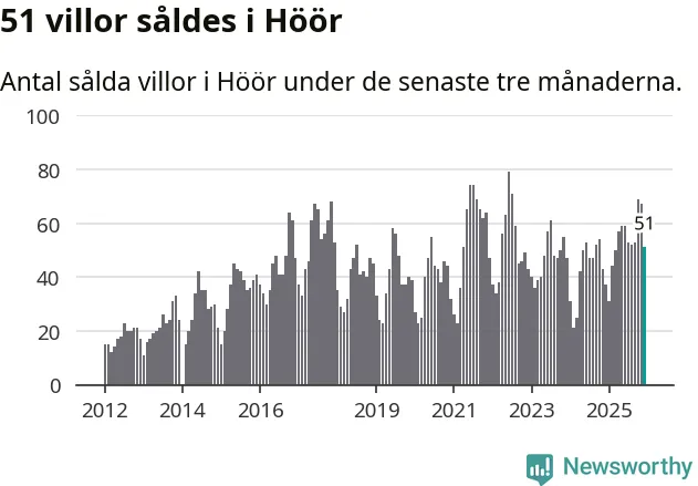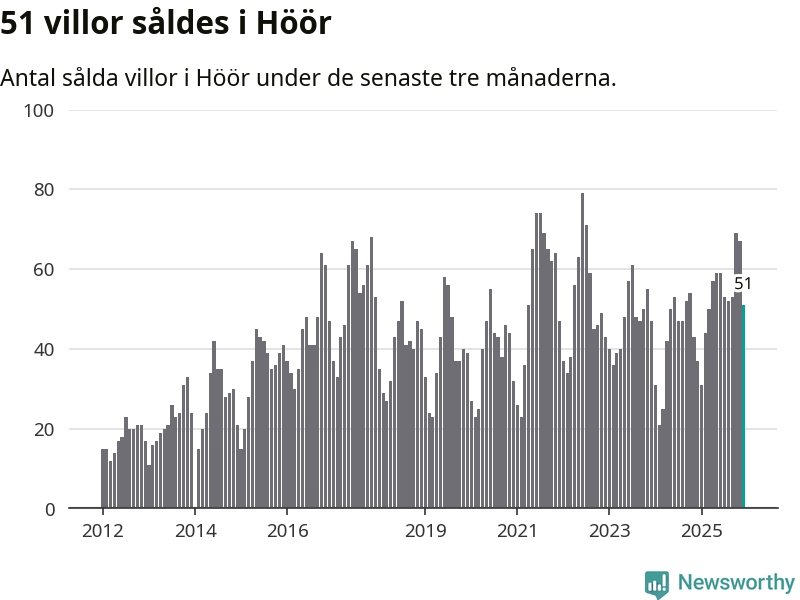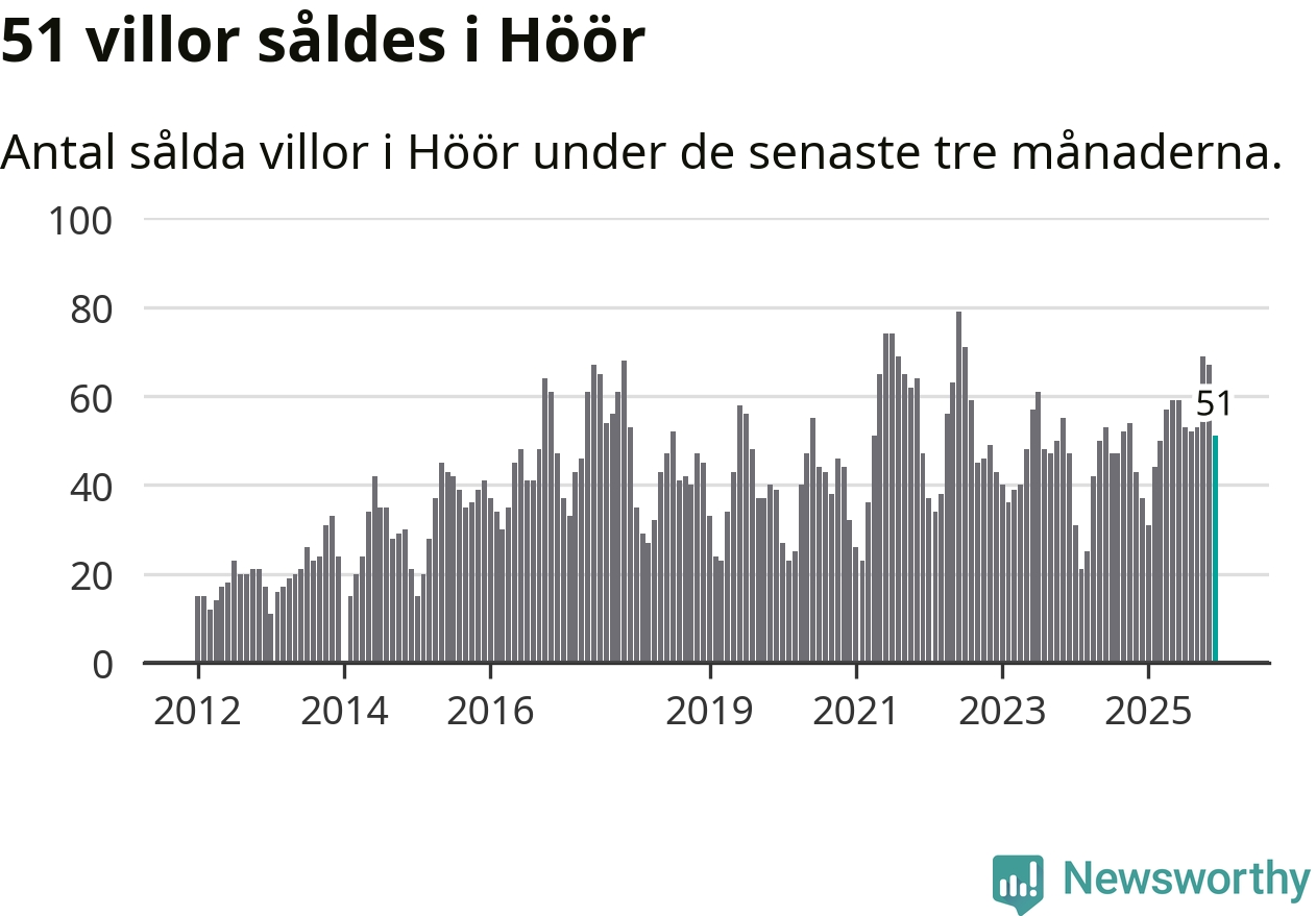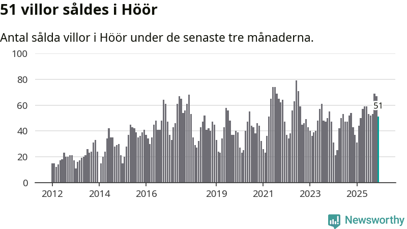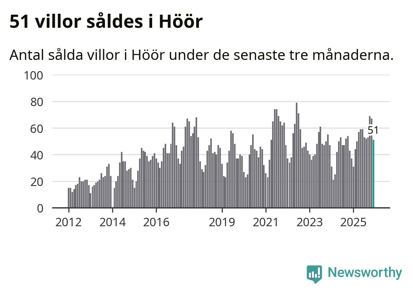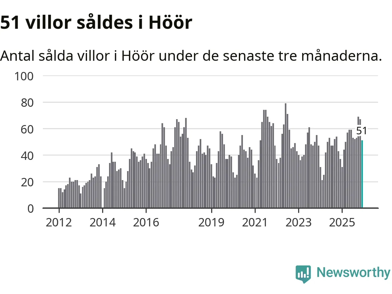 Sammanlagt såldes 51 villor i Höörs kommun mellan oktober och december till ett genomsnittligt pris på 2,6 miljoner kronor. I fjol gjordes 37 affärer vid den här tiden på året.