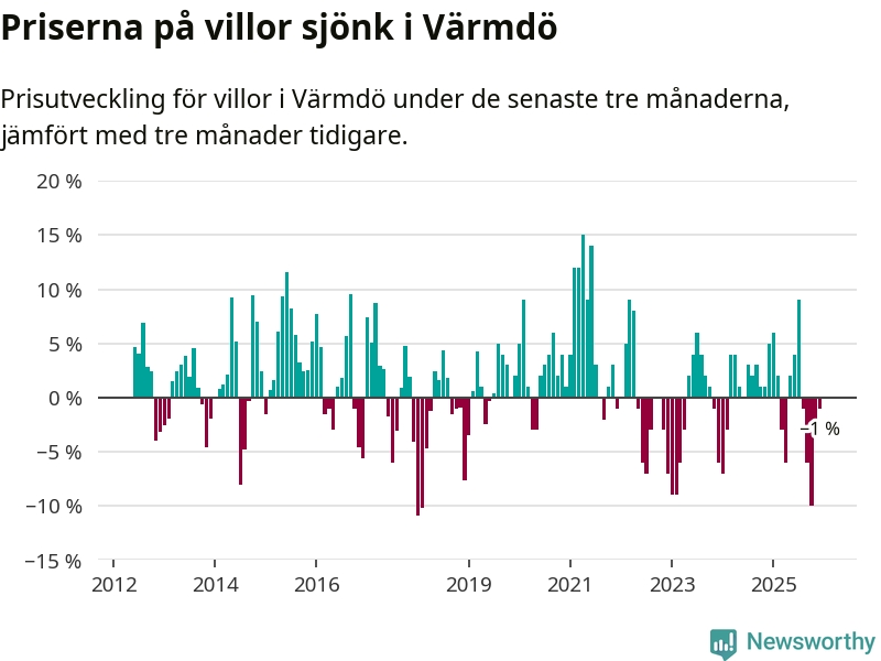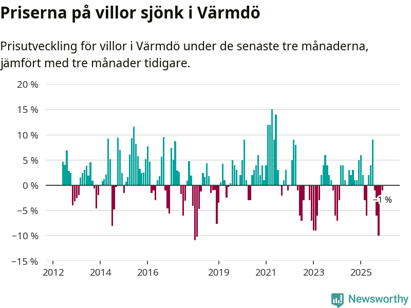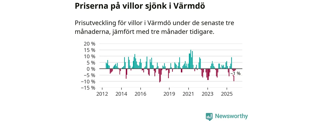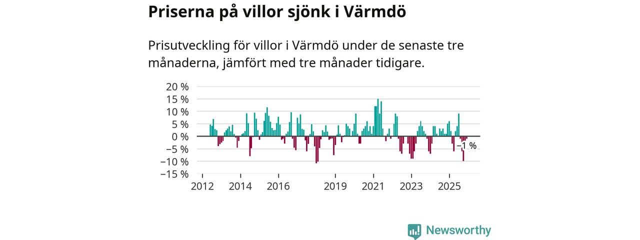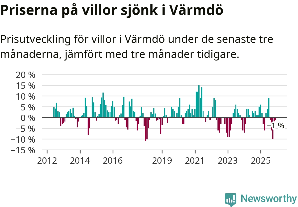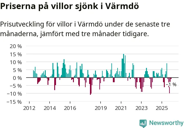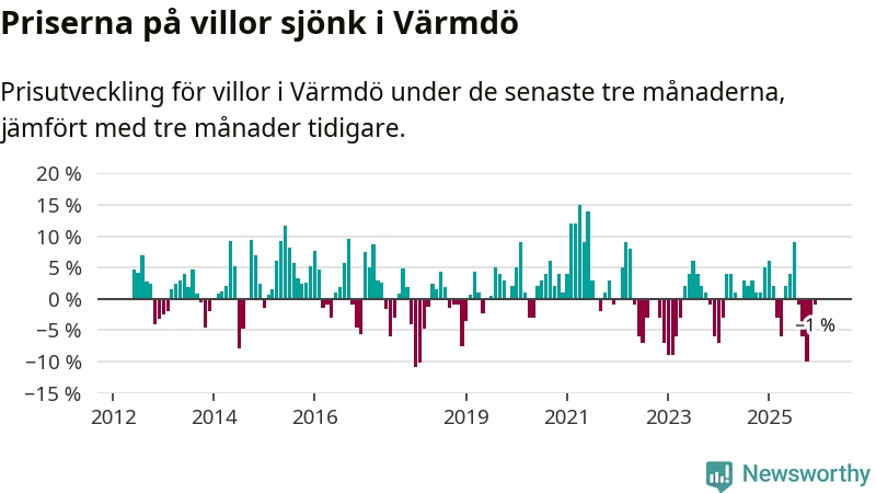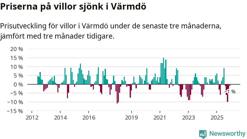 Villapriserna har gått ner i Värmdö kommun. Medelpriset på försäljningarna under de senaste tre månaderna visar på en nedgång med 1 procent.