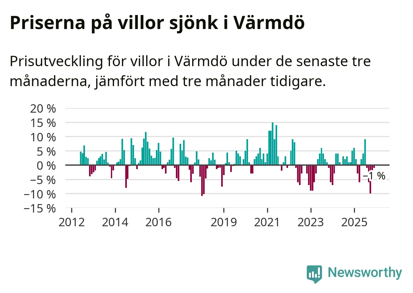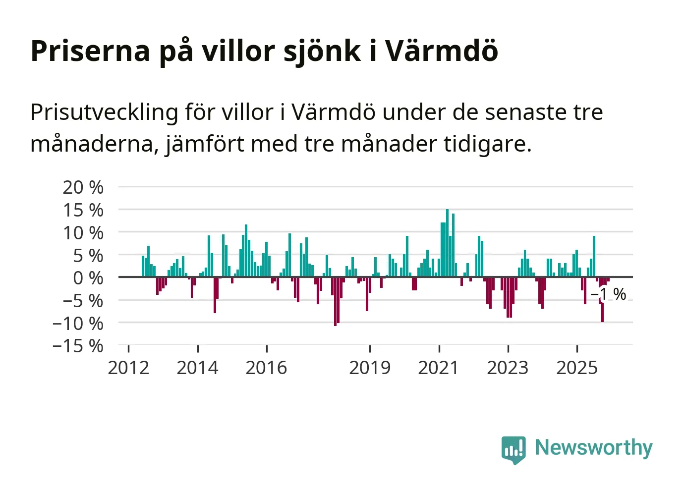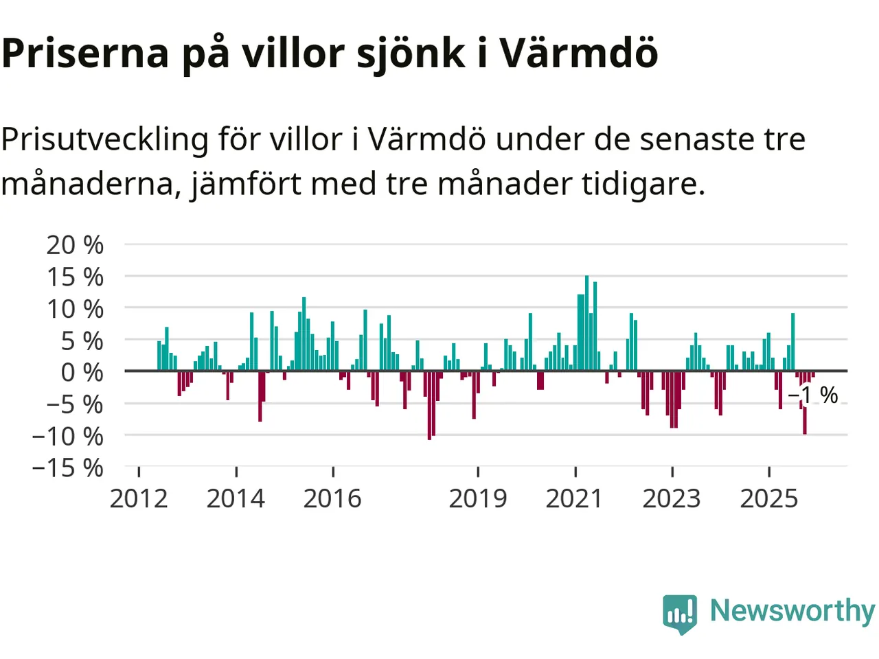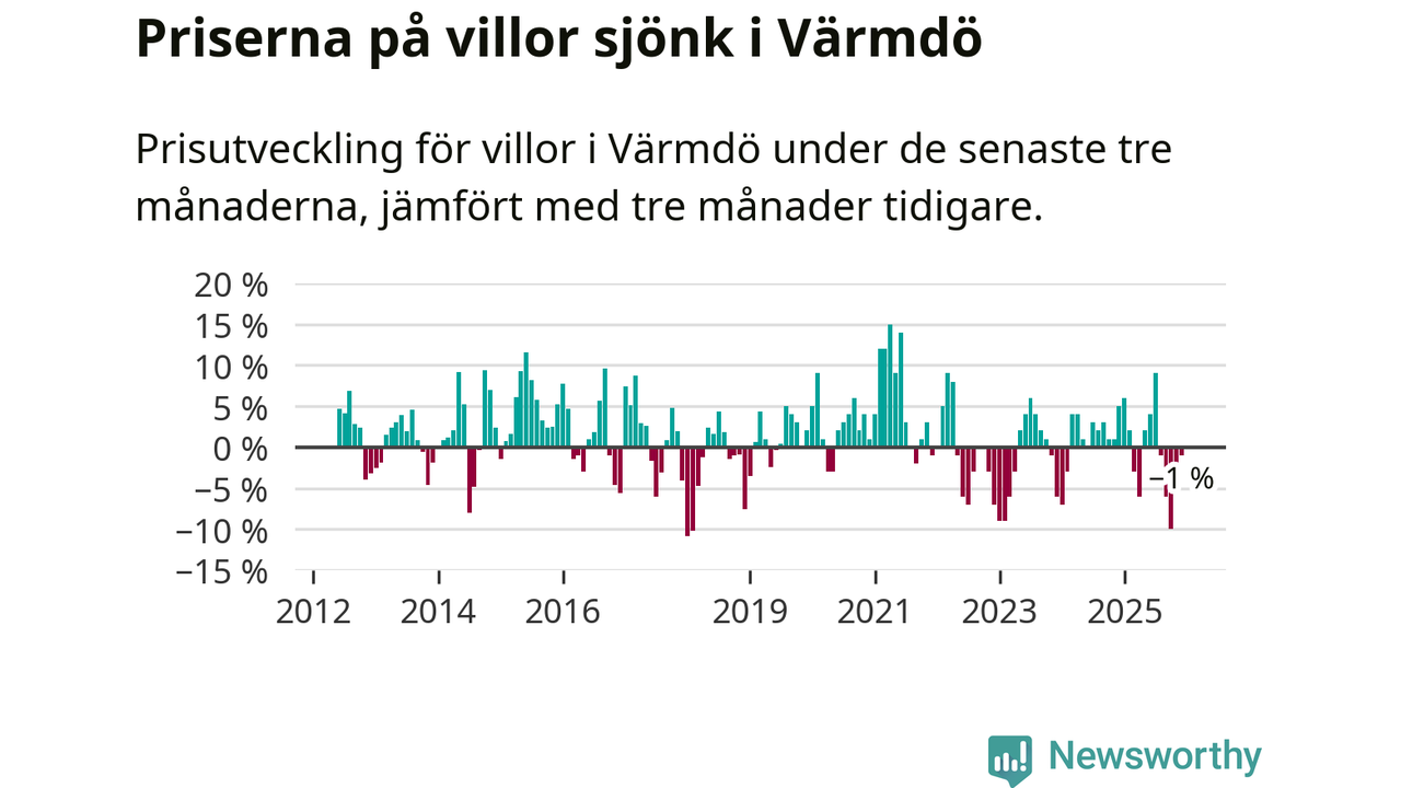 Villapriserna har gått ner i Värmdö kommun. Medelpriset på försäljningarna under de senaste tre månaderna visar på en nedgång med 1 procent.