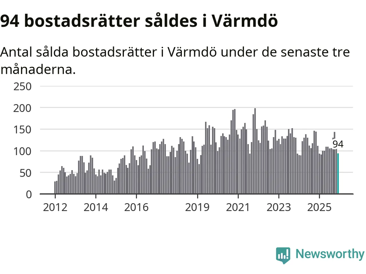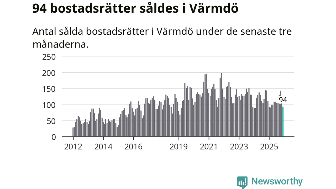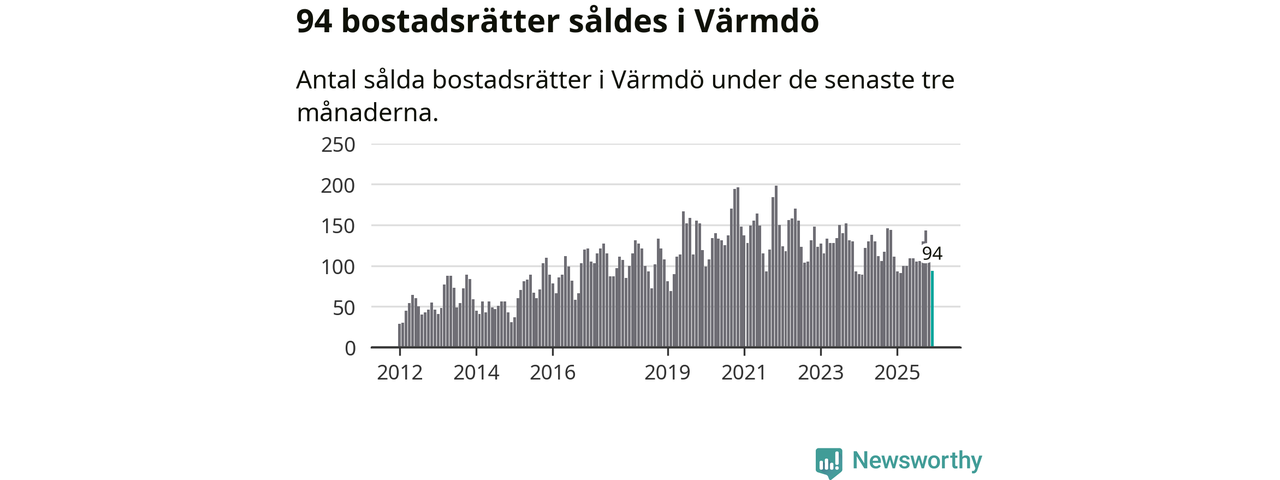 Sammanlagt såldes 94 bostadsrätter i Värmdö kommun mellan oktober och december till ett genomsnittligt pris på 3,0 miljoner kronor. I fjol gjordes 111 affärer vid den här tiden på året.