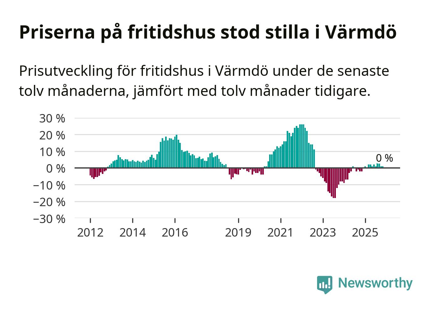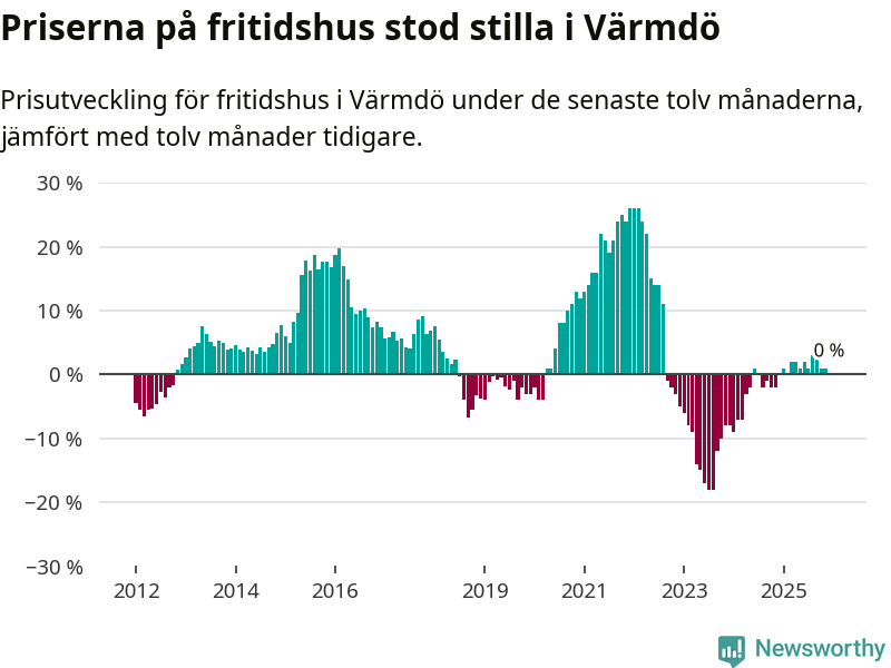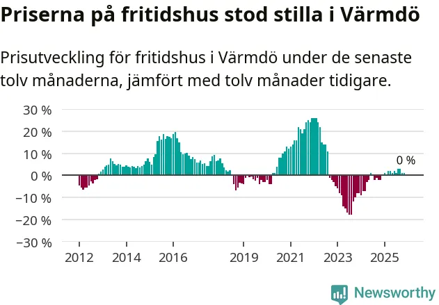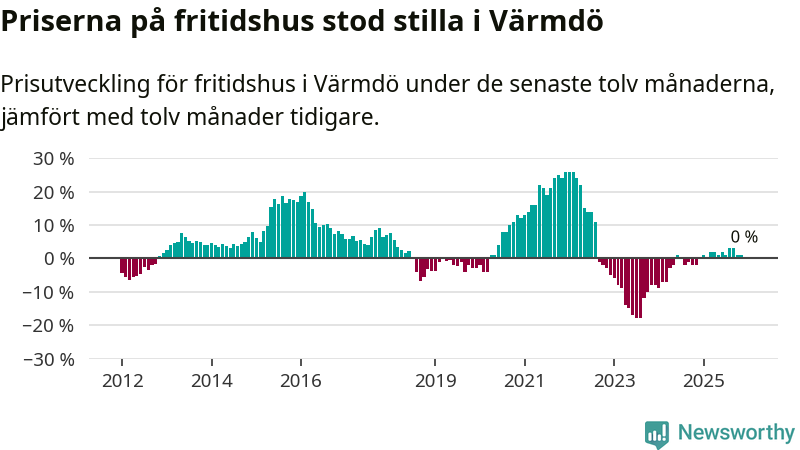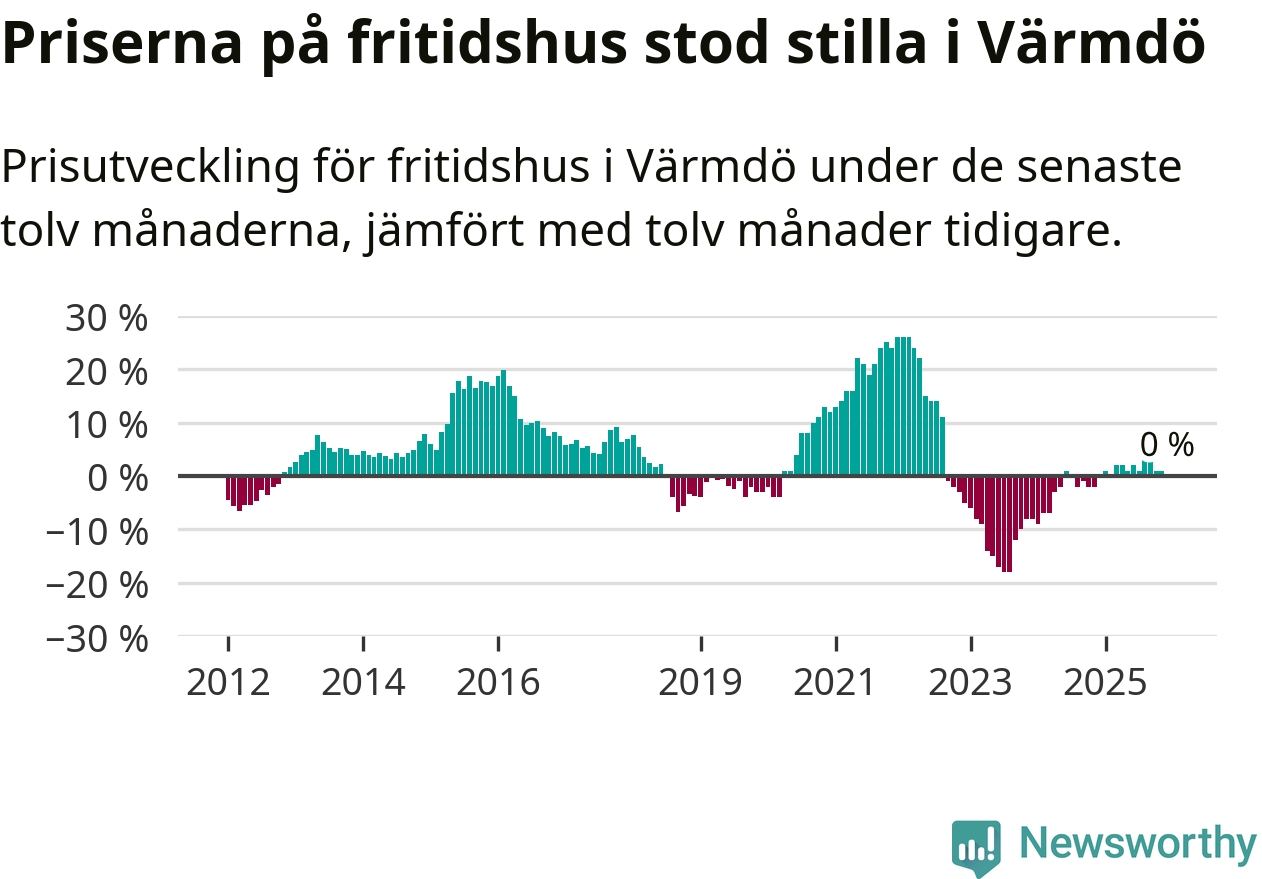 Priserna på fritidshus står i stort sett stilla i Värmdö kommun. Medelpriset på de på försäljningarna under de senaste tolv månaderna låg på samma nivå som för ett år sedan.