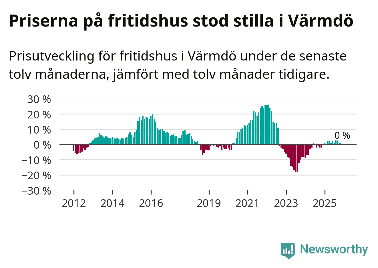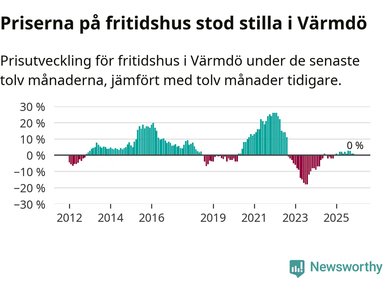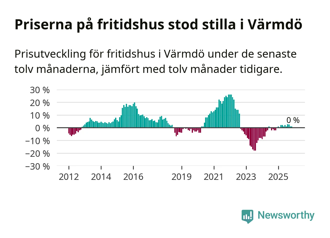 Priserna på fritidshus står i stort sett stilla i Värmdö kommun. Medelpriset på de på försäljningarna under de senaste tolv månaderna låg på samma nivå som för ett år sedan.