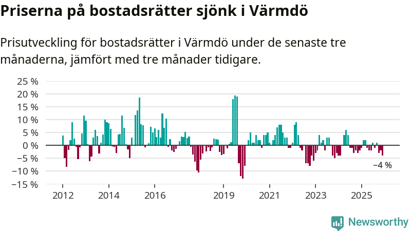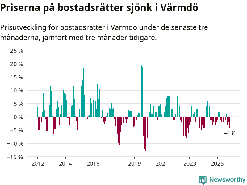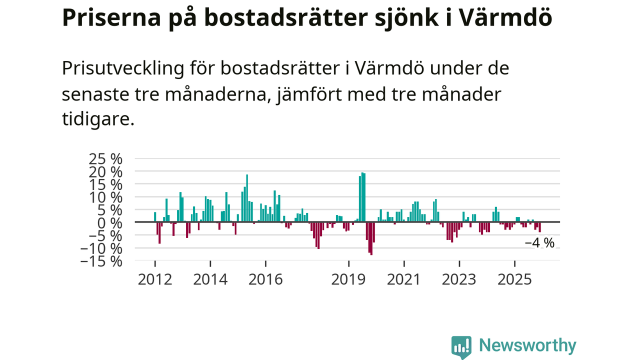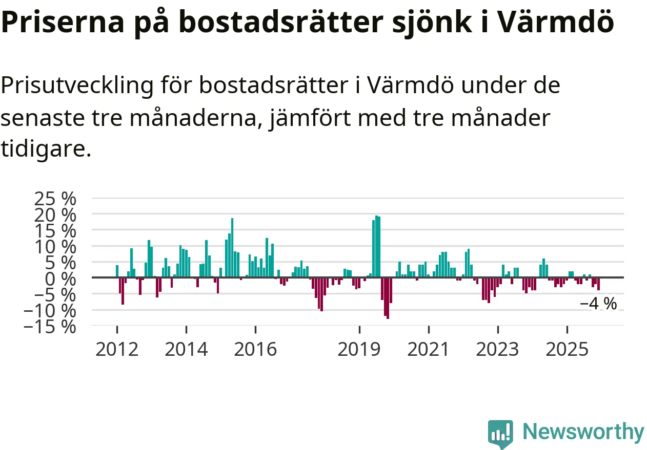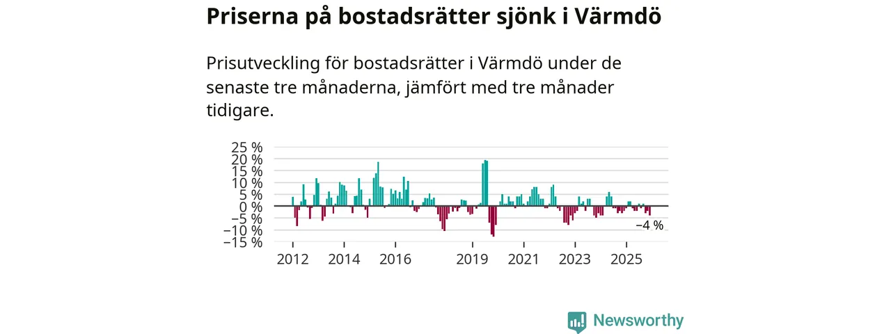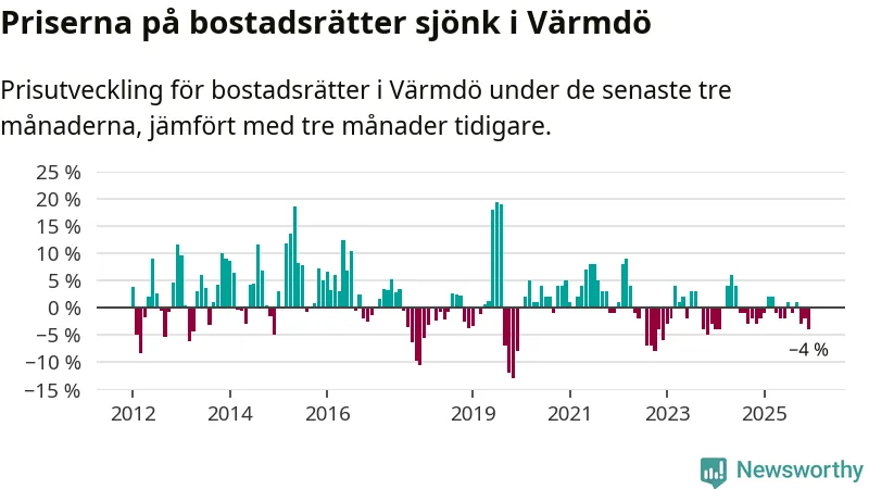 Priserna på bostadsrätter har gått ner i Värmdö kommun. Medelpriset på försäljningarna under de senaste tre månaderna visar på en nedgång med 4 procent.