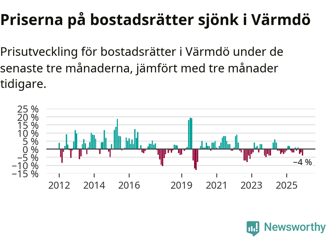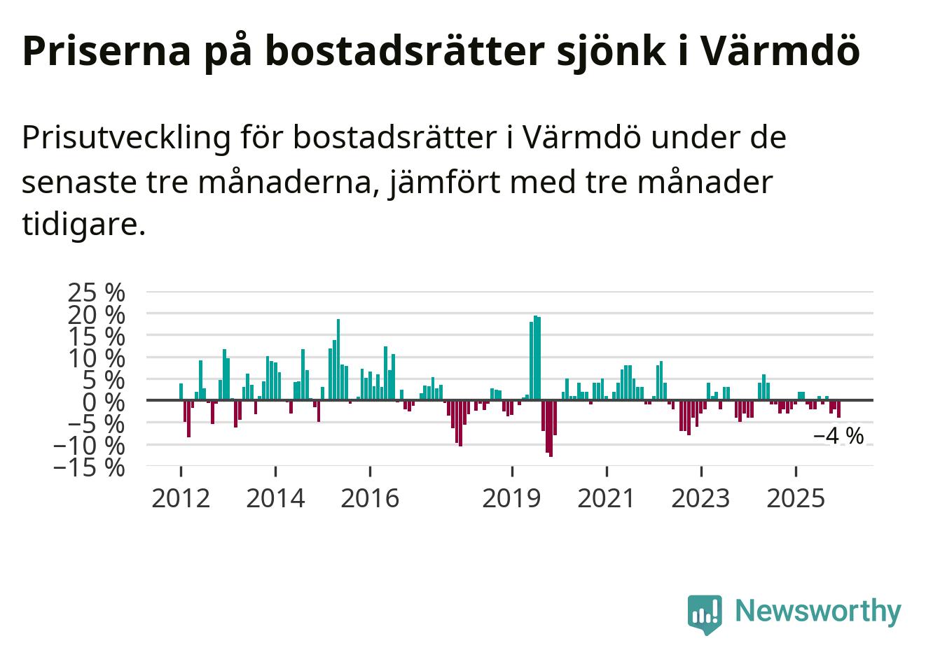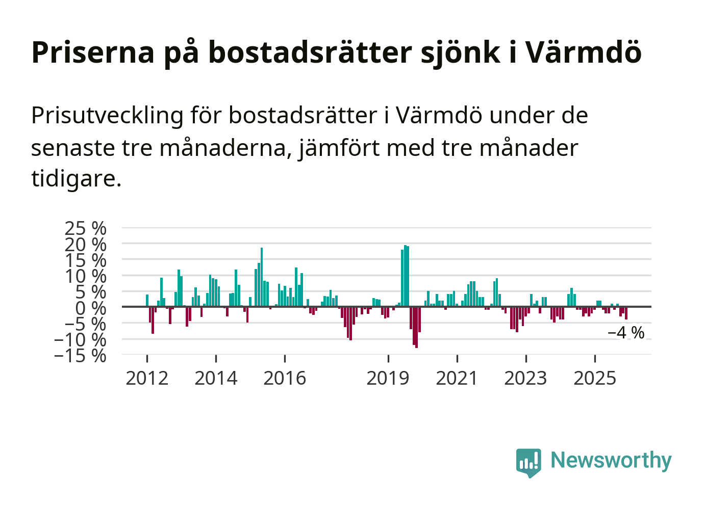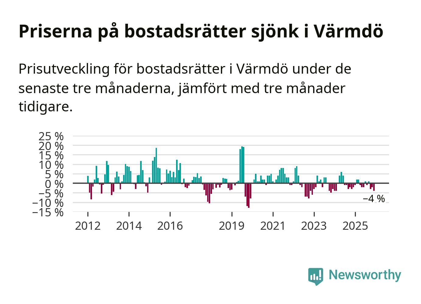 Priserna på bostadsrätter har gått ner i Värmdö kommun. Medelpriset på försäljningarna under de senaste tre månaderna visar på en nedgång med 4 procent.