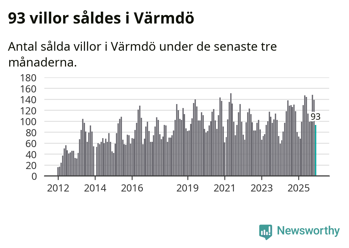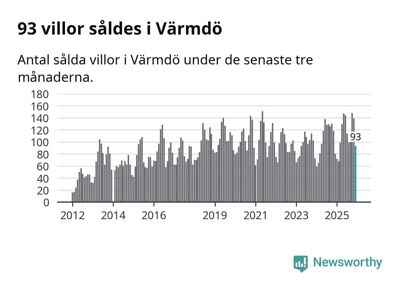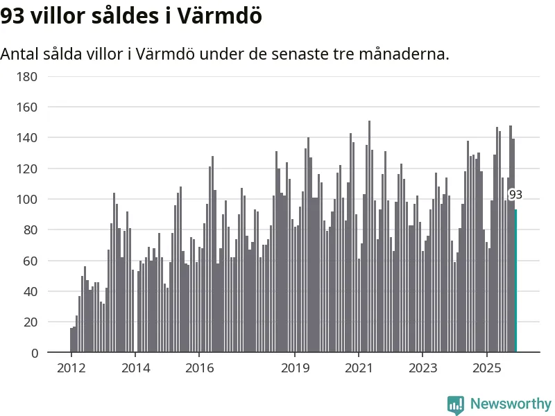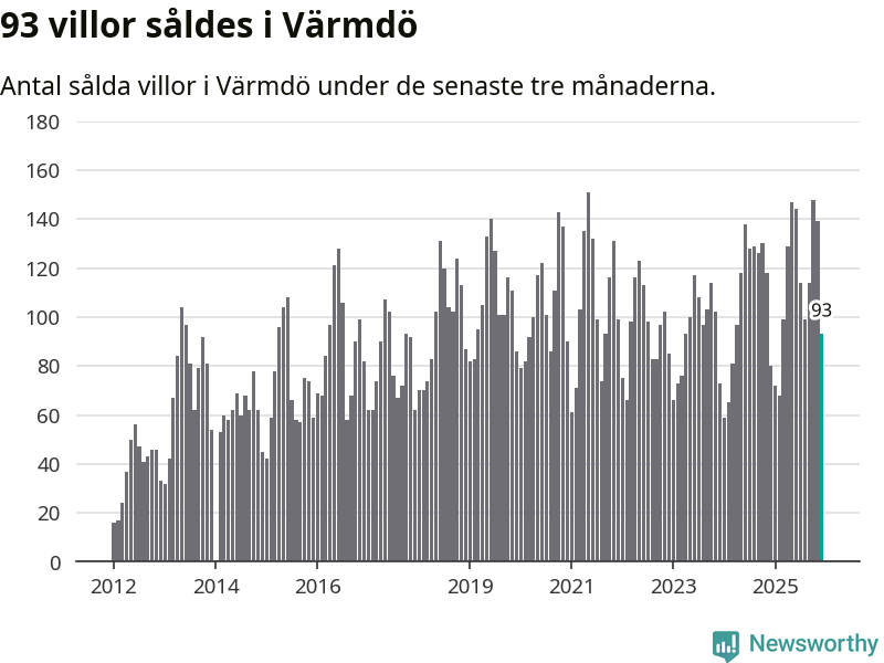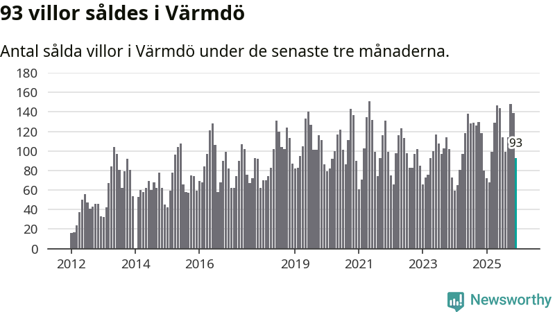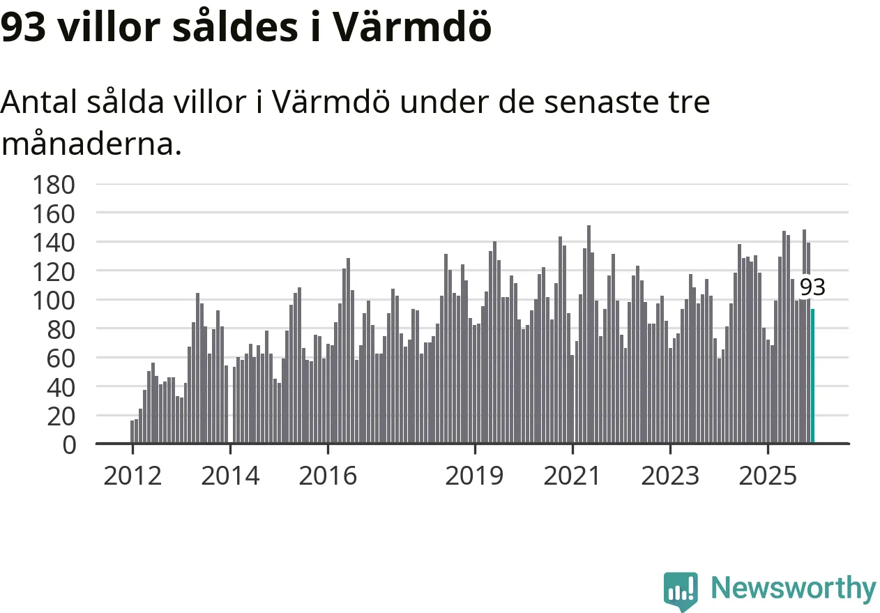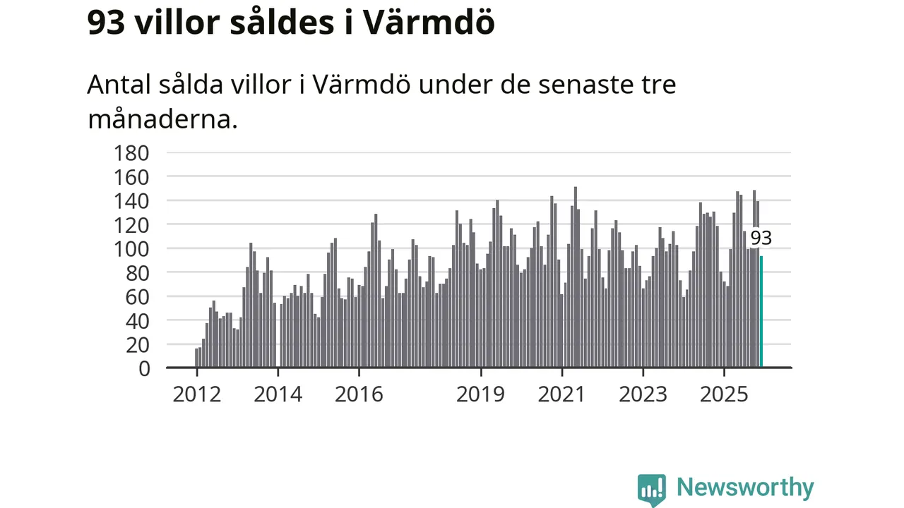 Sammanlagt såldes 93 villor i Värmdö kommun mellan oktober och december till ett genomsnittligt pris på 7,1 miljoner kronor. I fjol gjordes 80 affärer vid den här tiden på året.