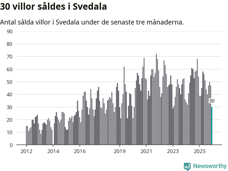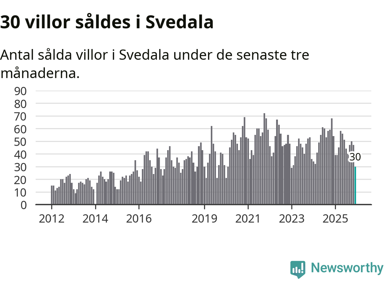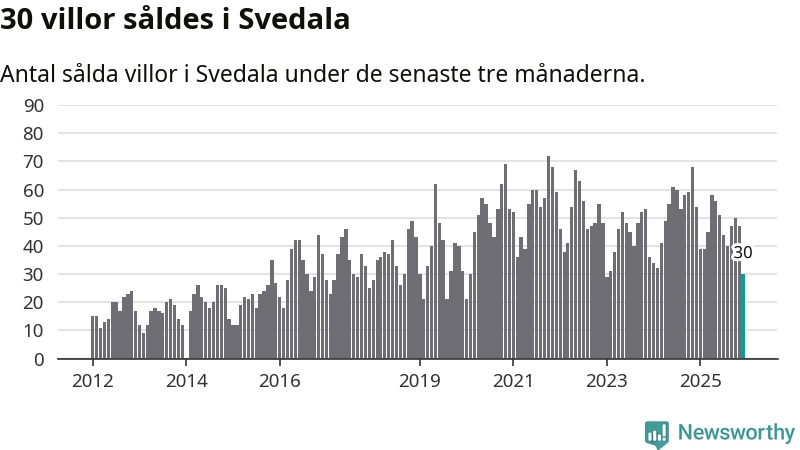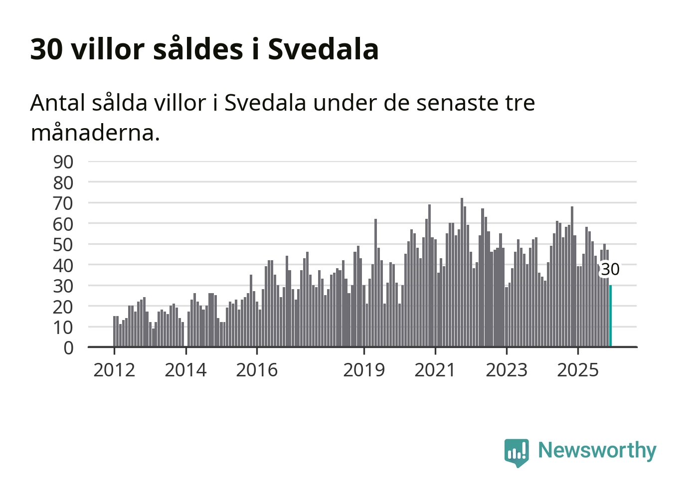 Mellan oktober och december såldes 30 villor i Svedala kommun. Det är relativt få sett till aktiviteten på bostadsmarknaden i kommunen under de senaste tolv månaderna, samt det historiska snittet för den här tiden på året.