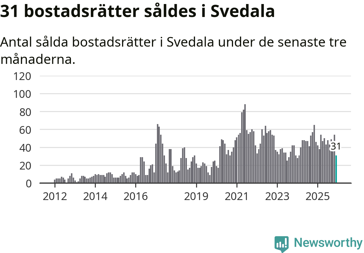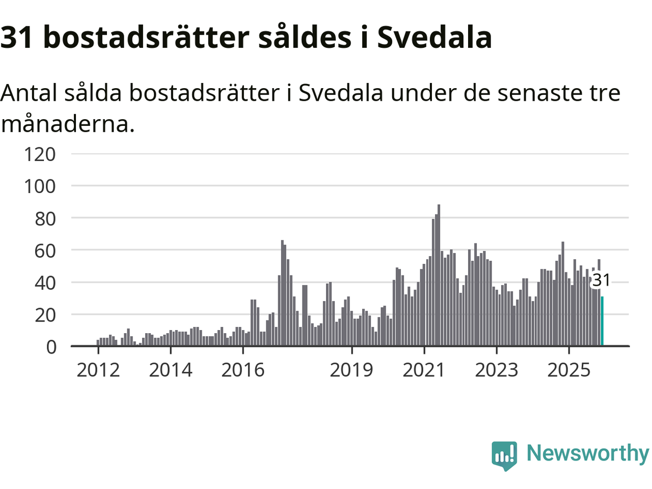 Sammanlagt såldes 31 bostadsrätter i Svedala kommun mellan oktober och december till ett genomsnittligt pris på 2,1 miljoner kronor. I fjol gjordes 46 affärer vid den här tiden på året.