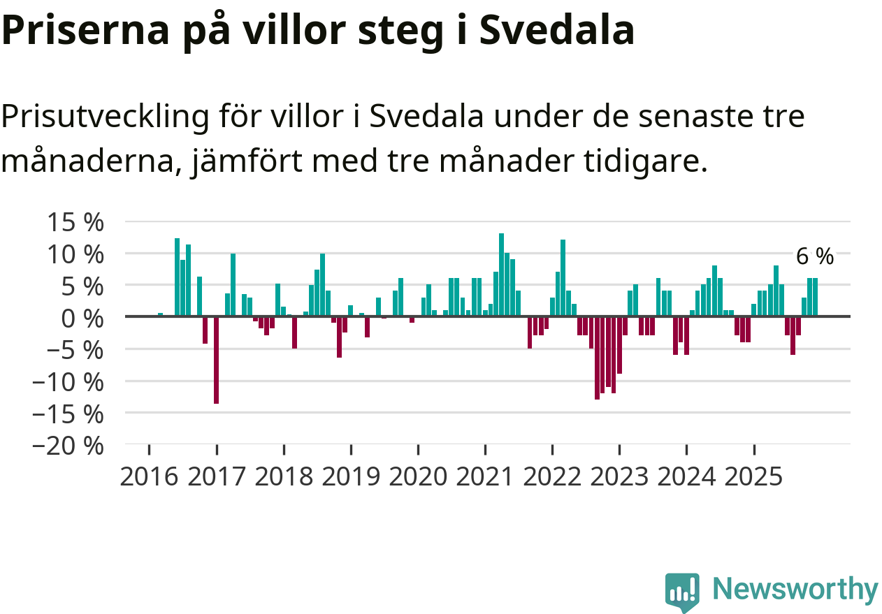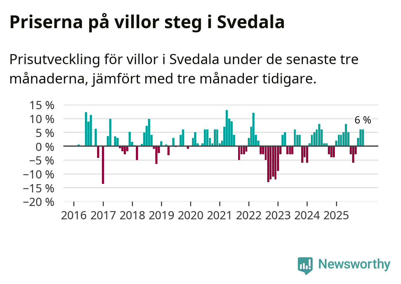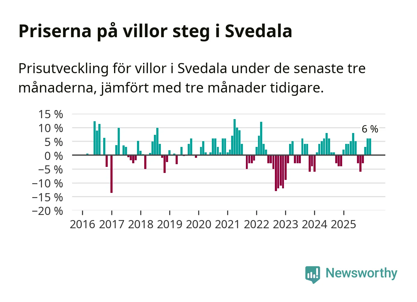 Statistiken visar även på en kännbar prisuppgång i Svedala kommun. Medelpriset på försäljningarna av villor i kommunen var 6 procent högre än för tre månader sedan. I hela Skåne däremot sjunker villapriserna. I hela länet noterades en prisnedgång på 2 procent.