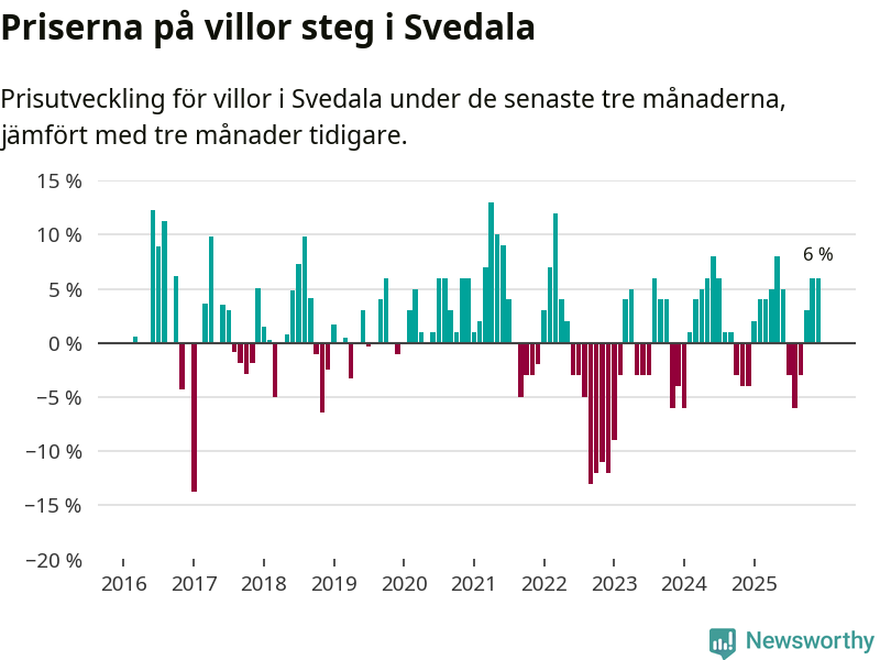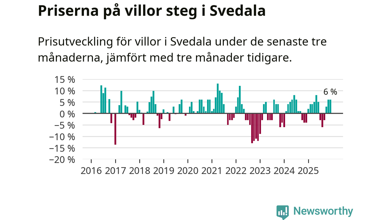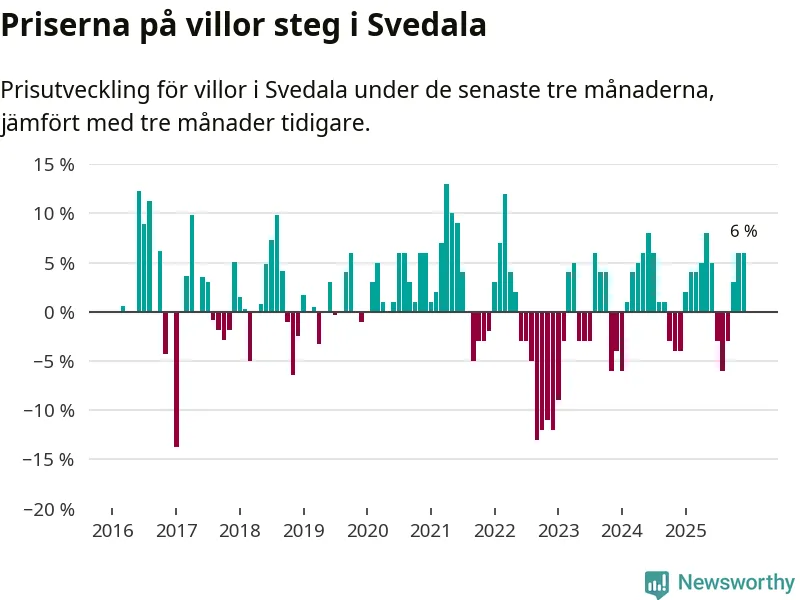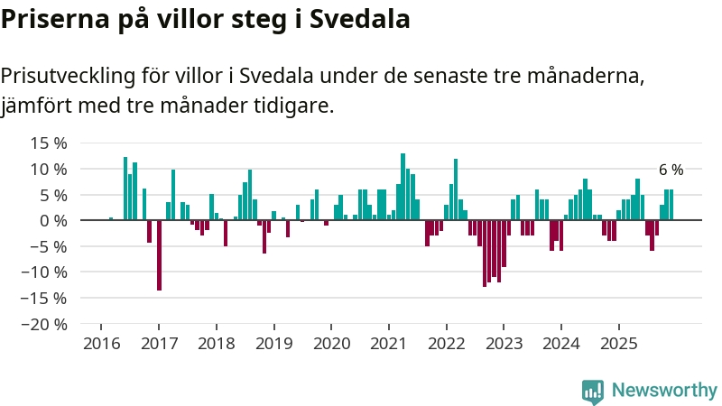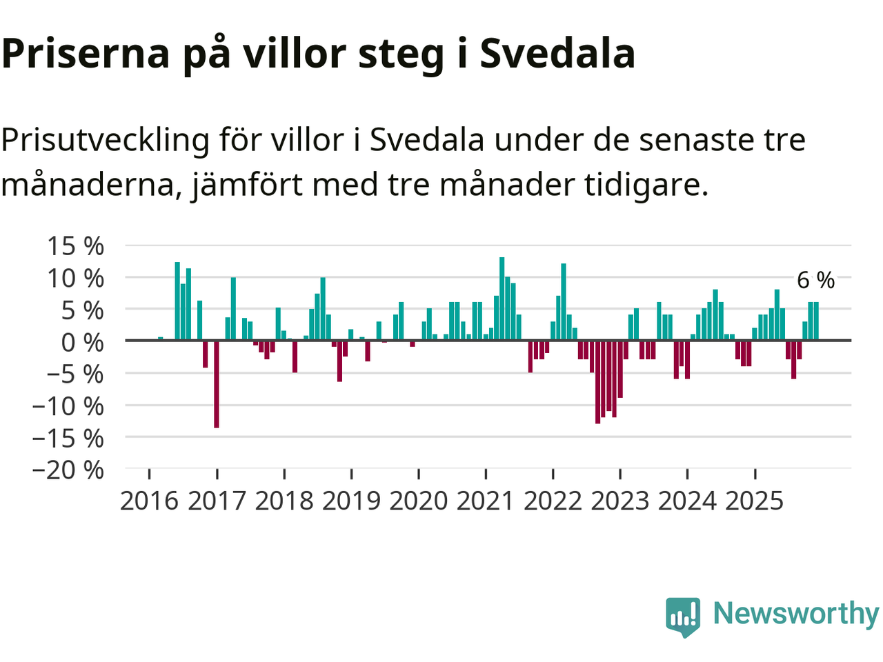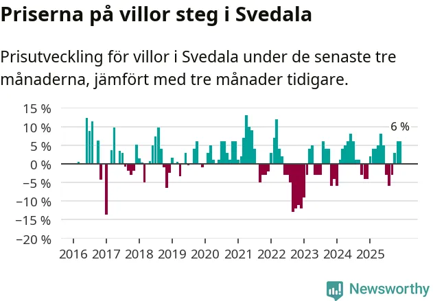 Statistiken visar även på en kännbar prisuppgång i Svedala kommun. Medelpriset på försäljningarna av villor i kommunen var 6 procent högre än för tre månader sedan. I hela Skåne däremot sjunker villapriserna. I hela länet noterades en prisnedgång på 2 procent.