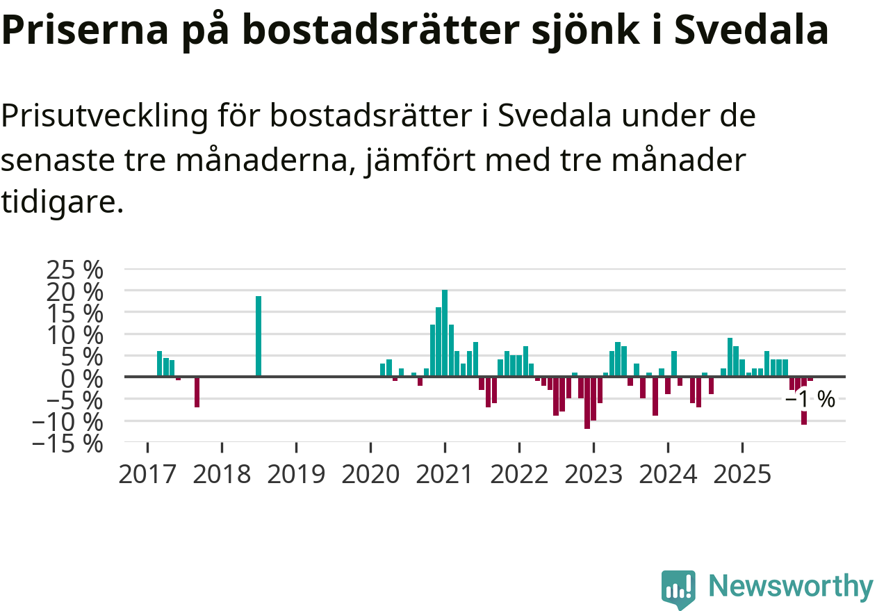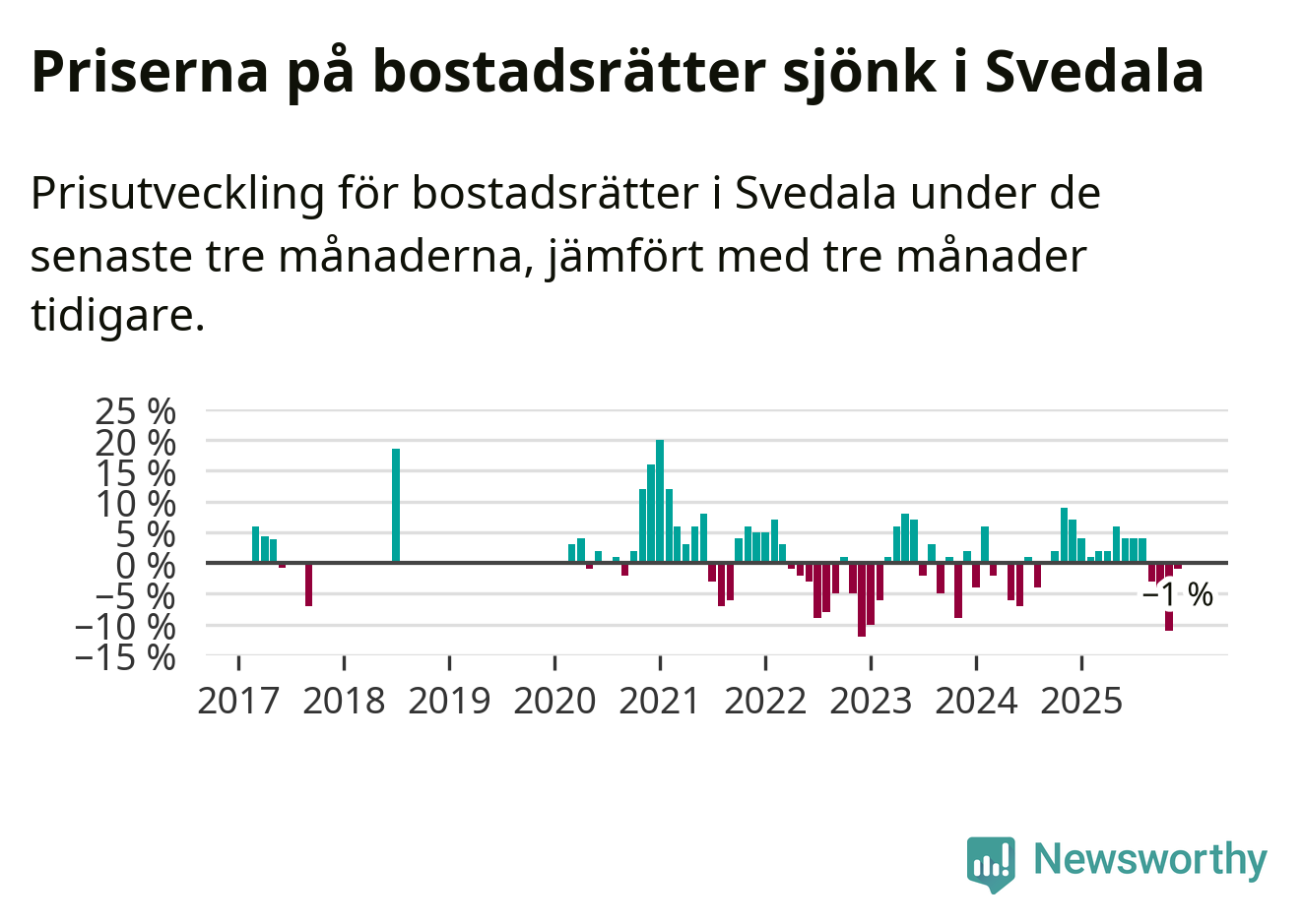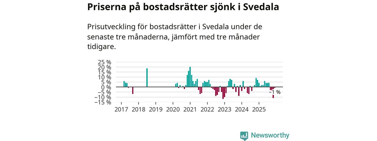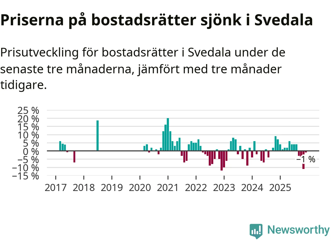 Priserna på bostadsrätter har gått ner i Svedala kommun. Medelpriset på försäljningarna under de senaste tre månaderna visar på en nedgång med 1 procent.