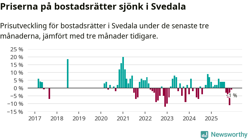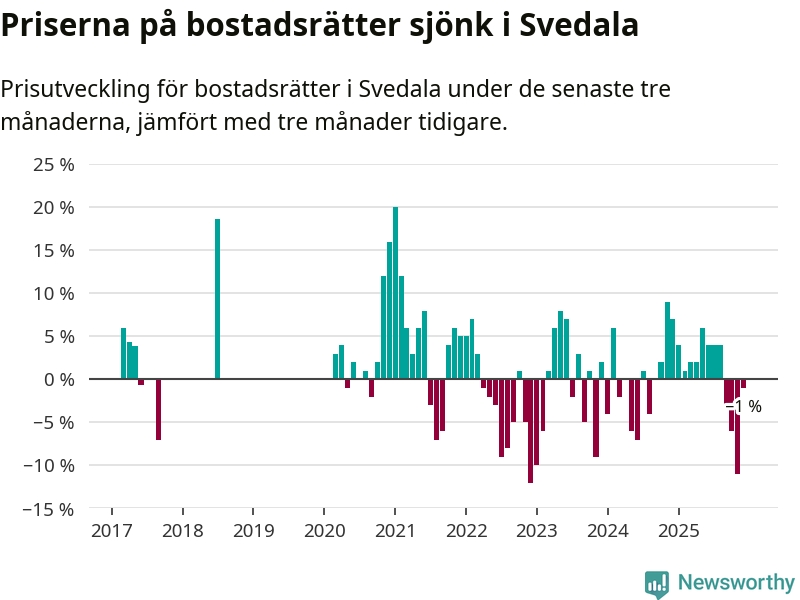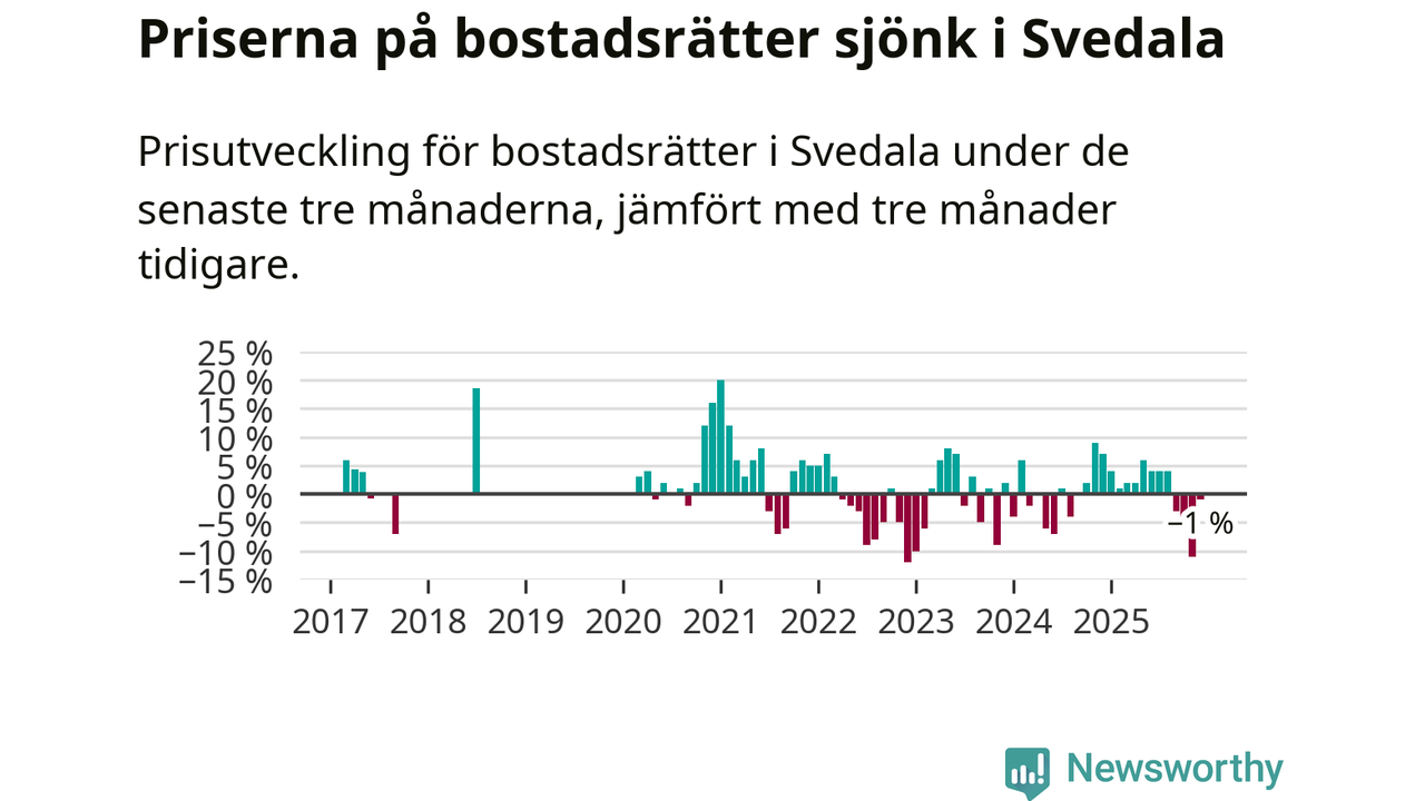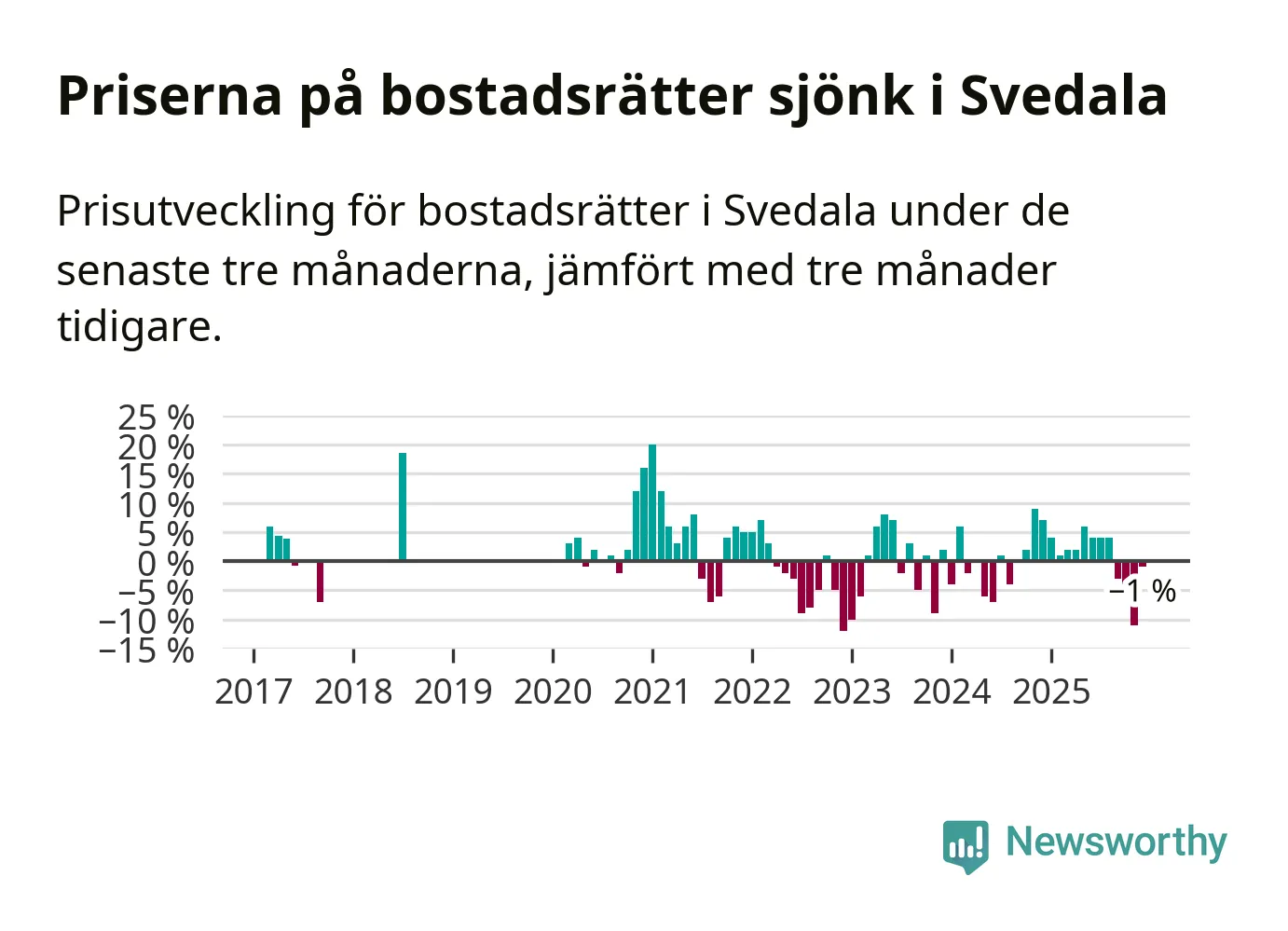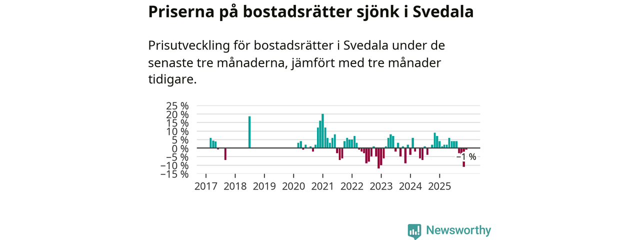 Priserna på bostadsrätter har gått ner i Svedala kommun. Medelpriset på försäljningarna under de senaste tre månaderna visar på en nedgång med 1 procent.