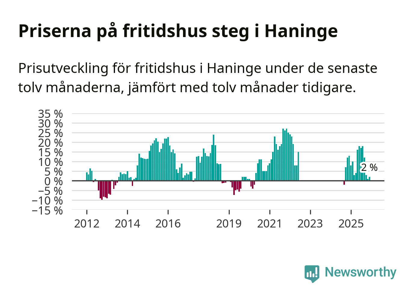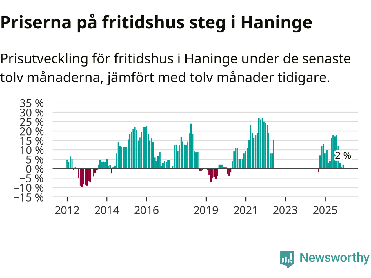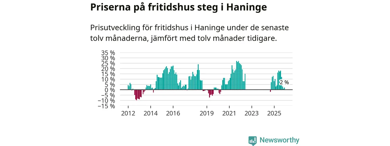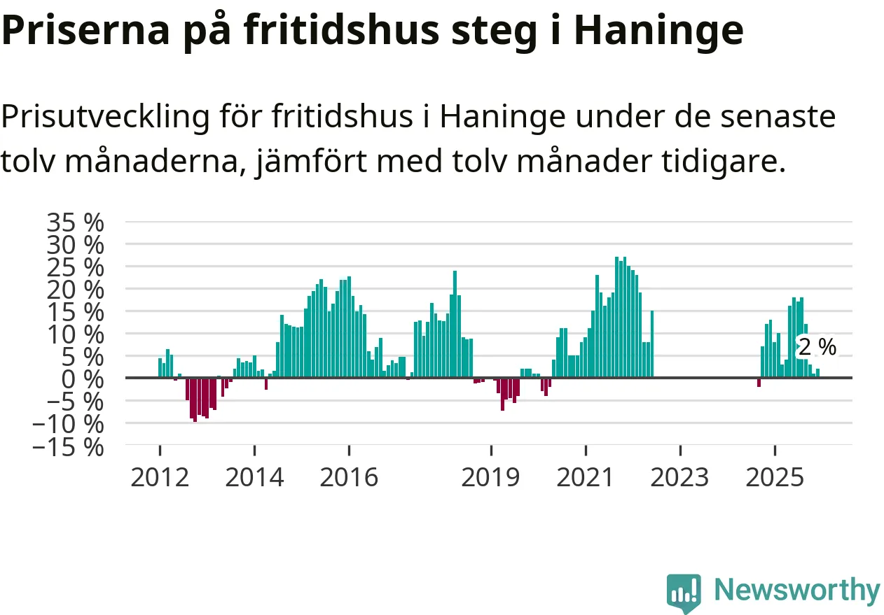 Priserna på fritidshus har gått upp i Haninge kommun. Medelpriset på försäljningarna under de senaste tolv månaderna visar på en uppgång med 2 procent.