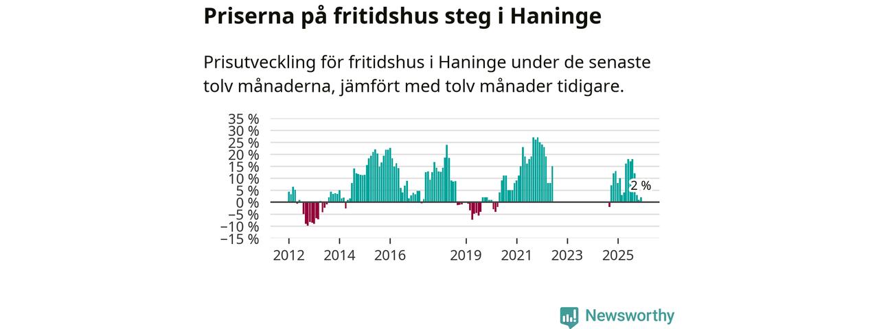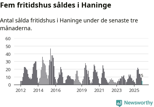 Sammanlagt såldes fem fritidshus i Haninge kommun mellan oktober 2025 och december 2025 till ett genomsnittligt pris på 3,5 miljoner kronor. I fjol gjordes sex affärer vid den här tiden på året.
