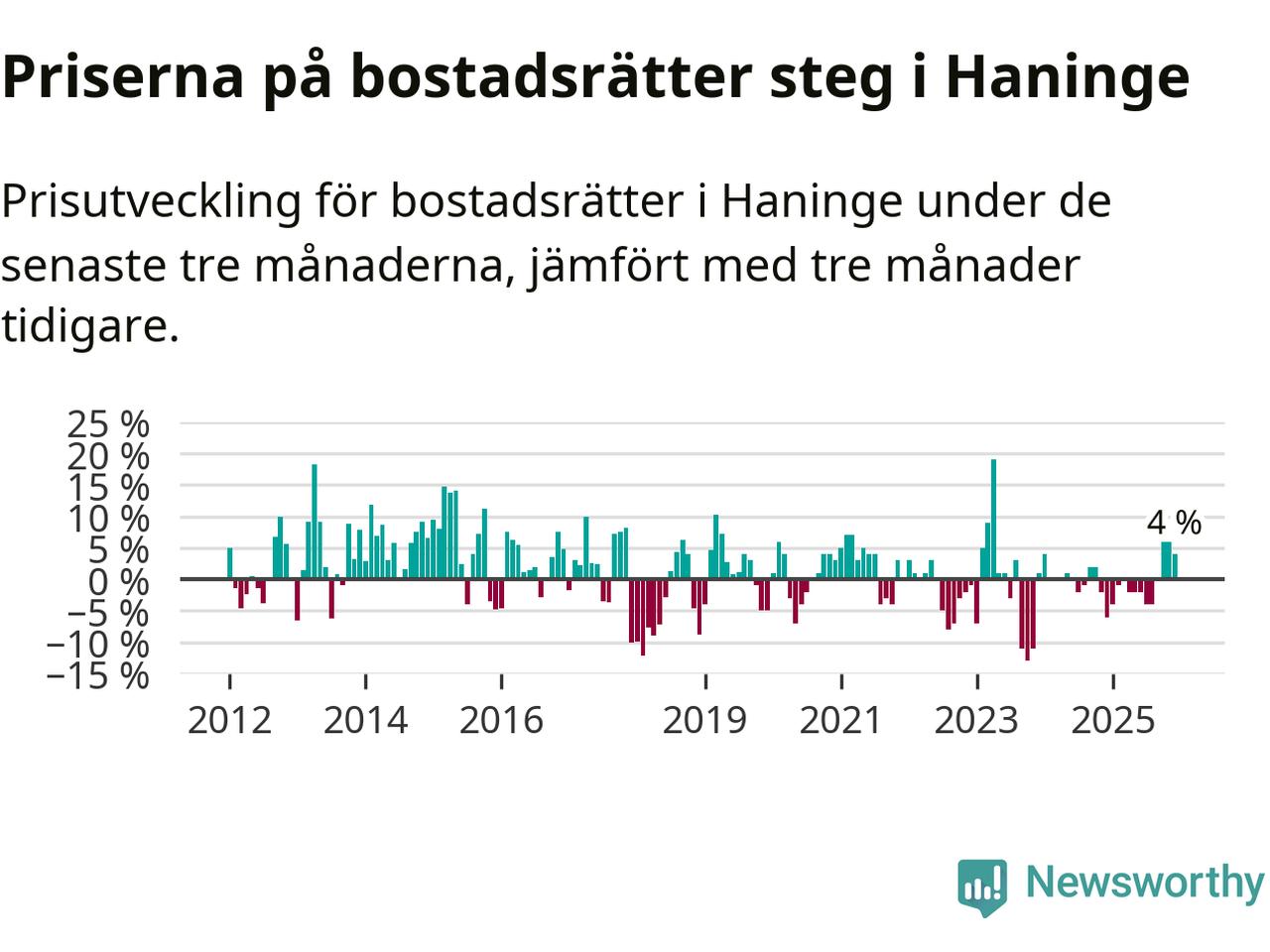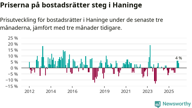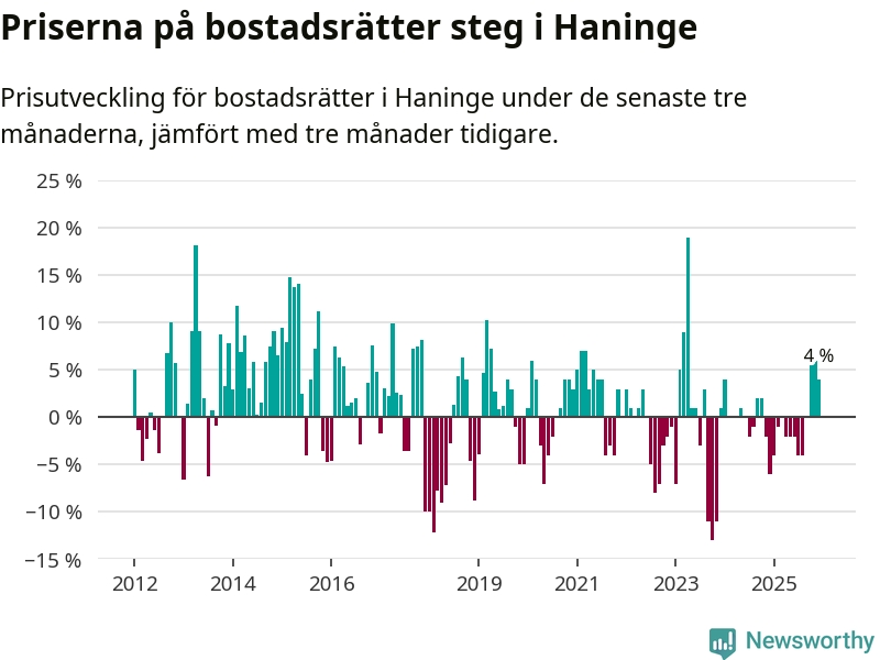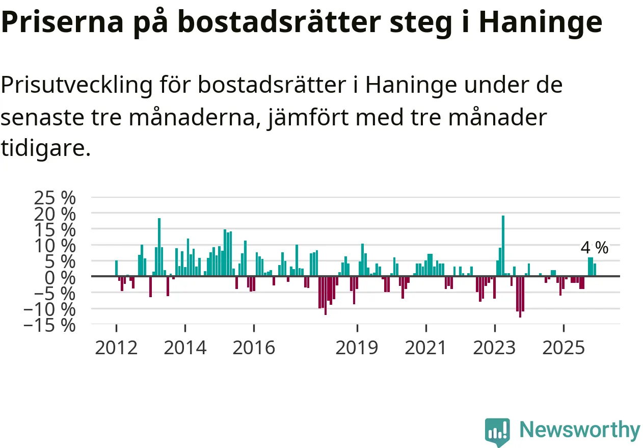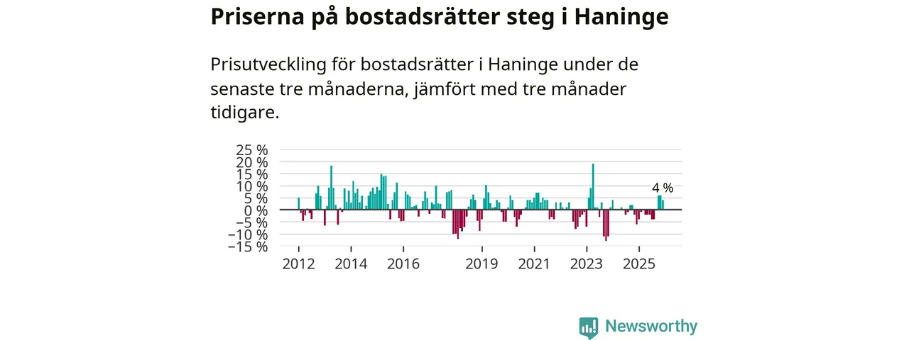 Priserna på bostadsrätter har gått upp i Haninge kommun. Medelpriset på försäljningarna under de senaste tre månaderna visar på en uppgång med 4 procent.