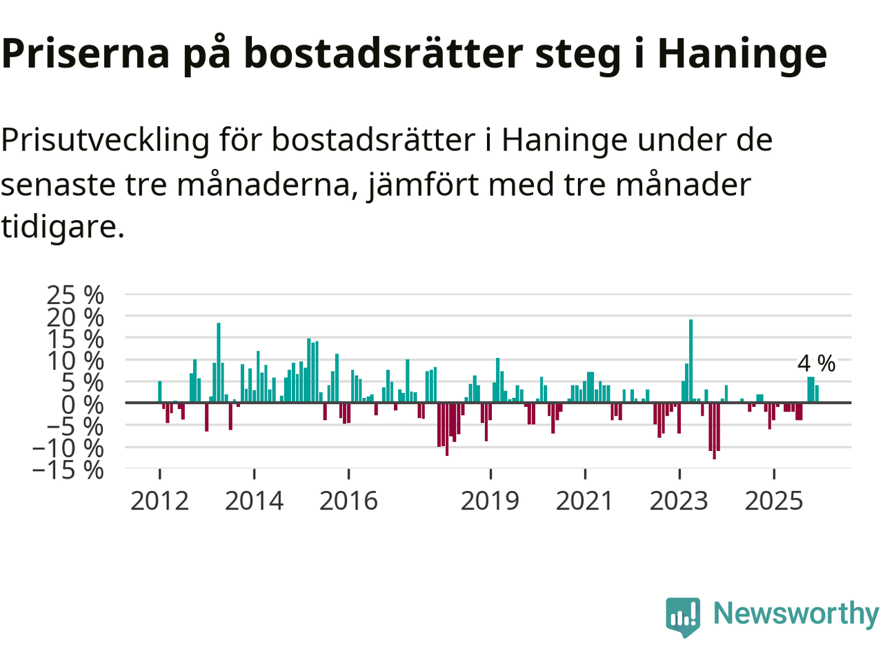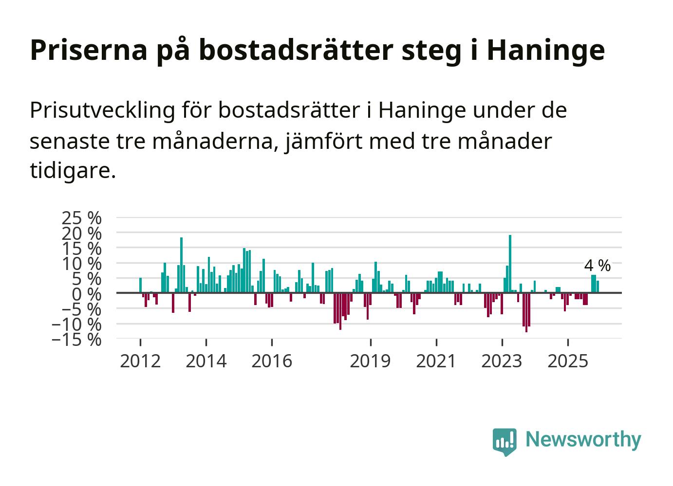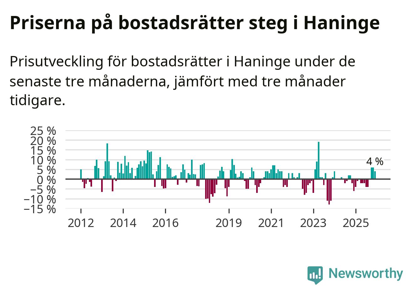 Priserna på bostadsrätter har gått upp i Haninge kommun. Medelpriset på försäljningarna under de senaste tre månaderna visar på en uppgång med 4 procent.
