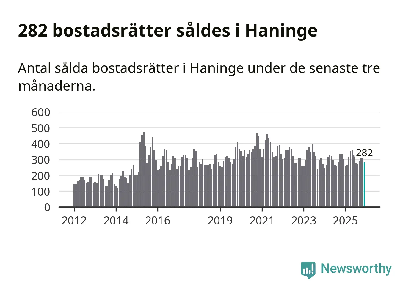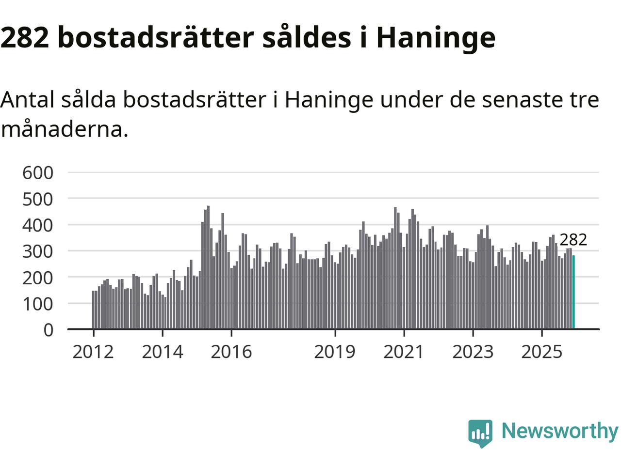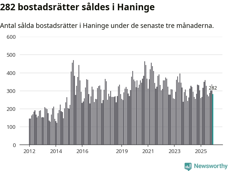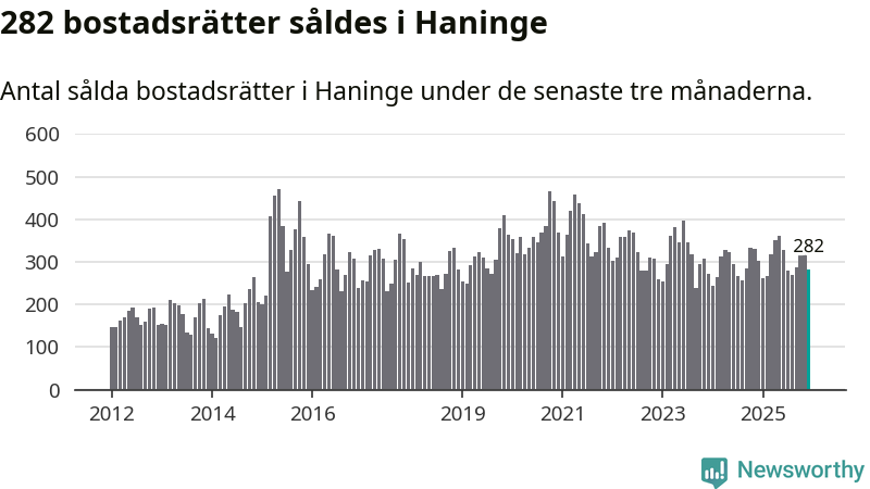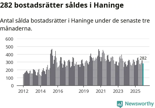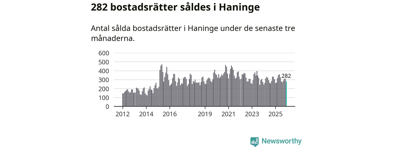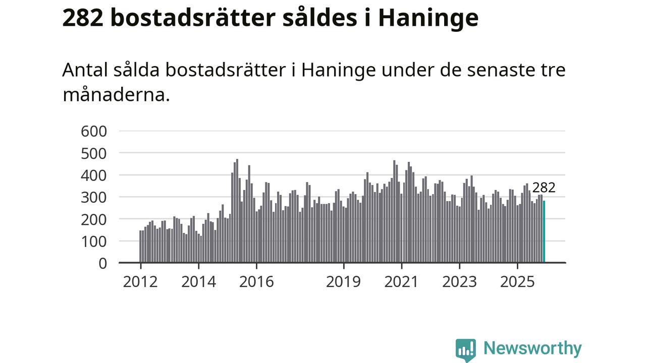 Sammanlagt såldes 282 bostadsrätter i Haninge kommun mellan oktober och december till ett genomsnittligt pris på 2,3 miljoner kronor. I fjol gjordes 303 affärer vid den här tiden på året.