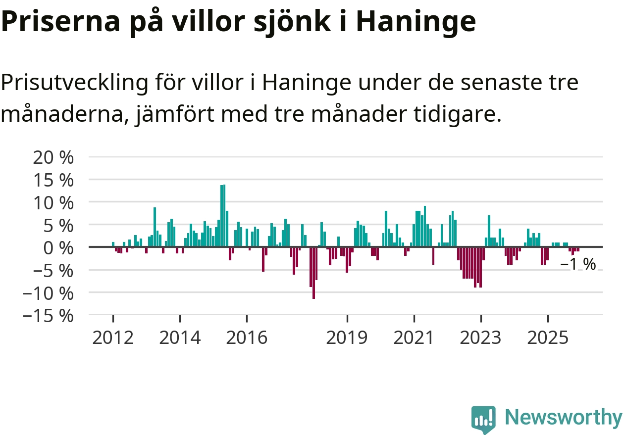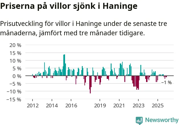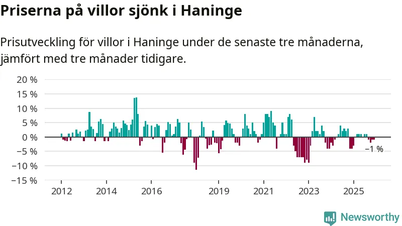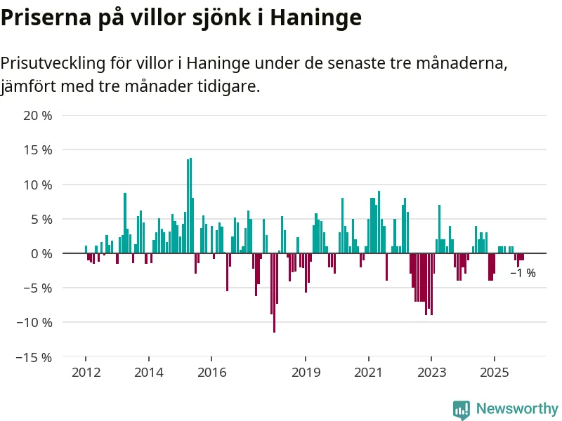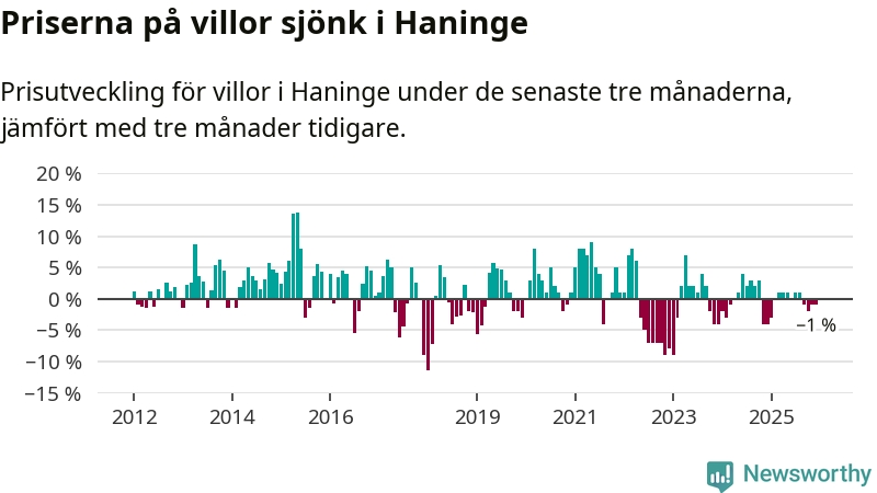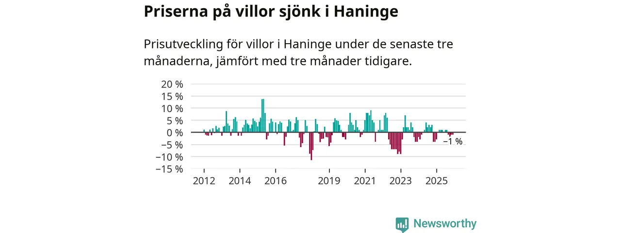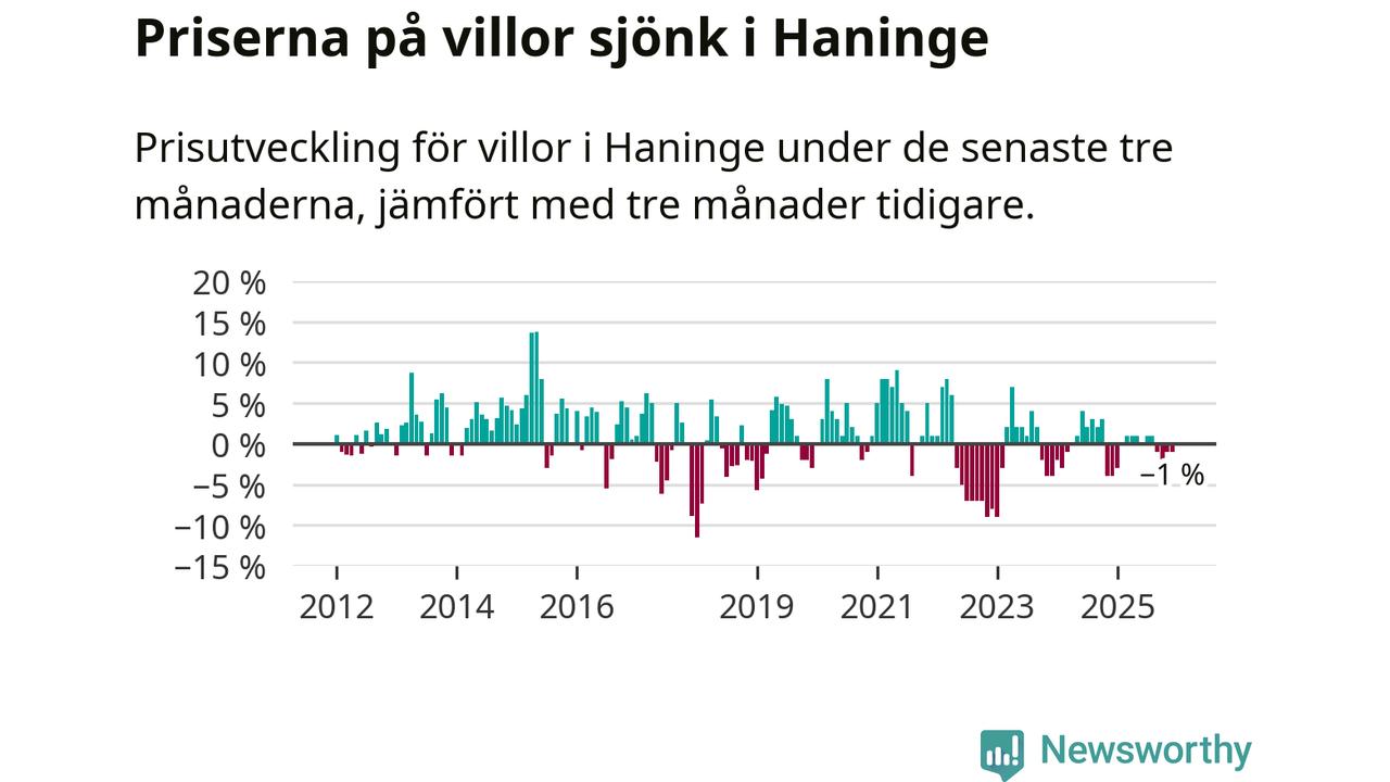 Villapriserna har gått ner i Haninge kommun. Medelpriset på försäljningarna under de senaste tre månaderna visar på en nedgång med 1 procent.