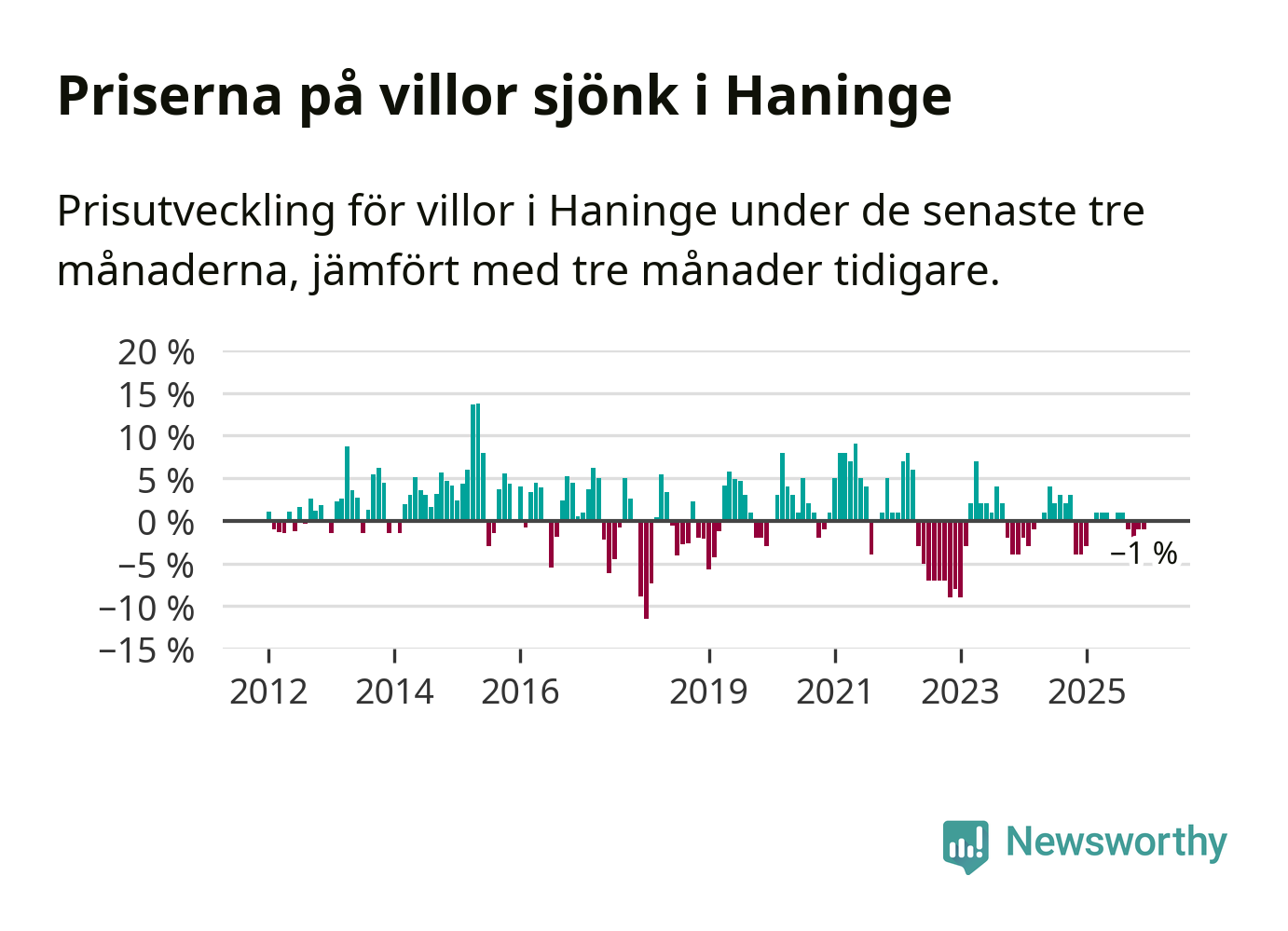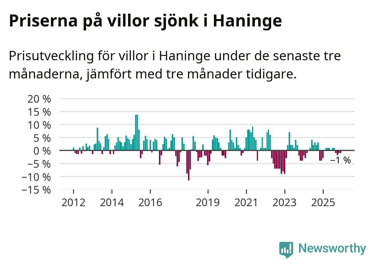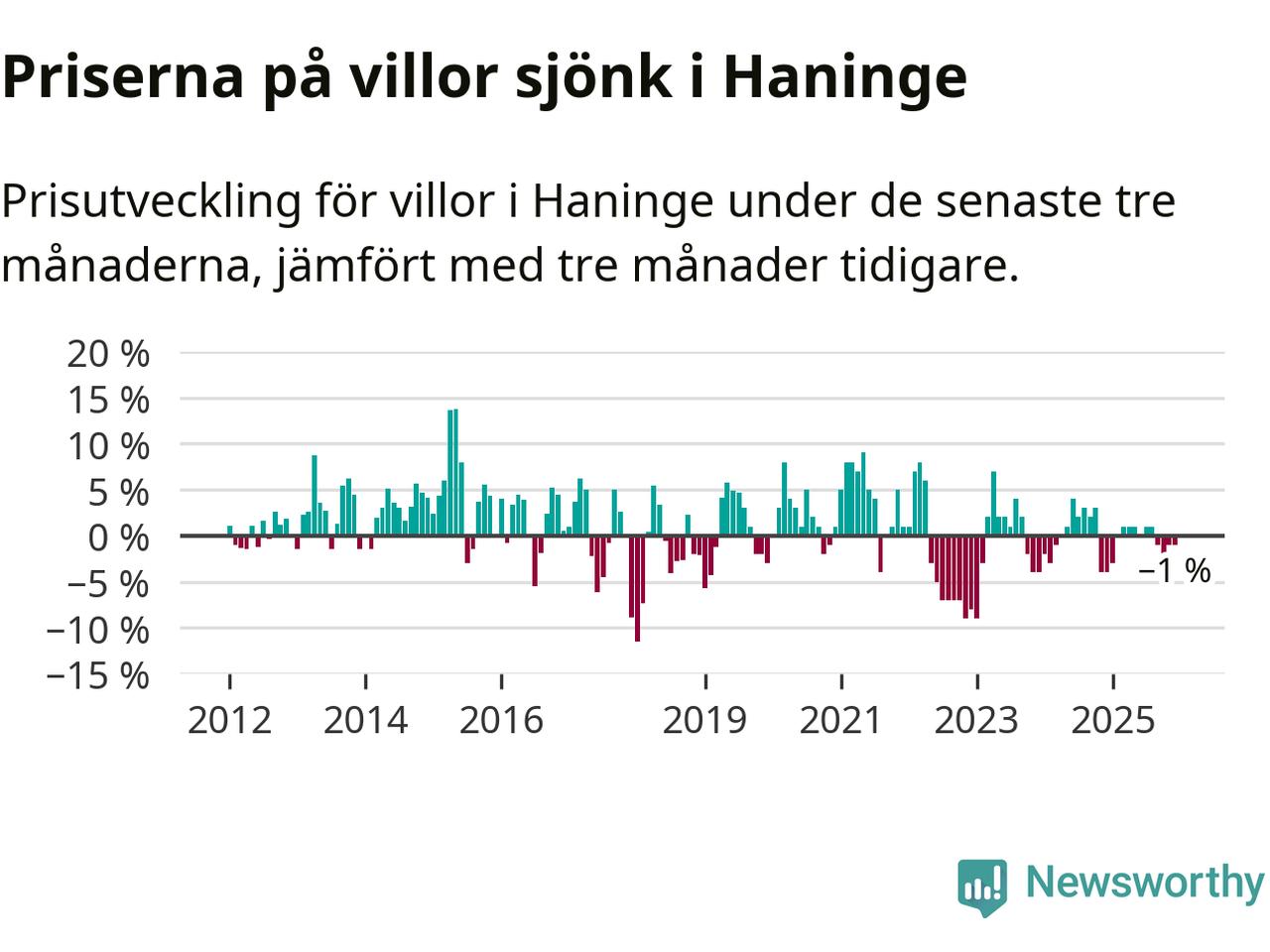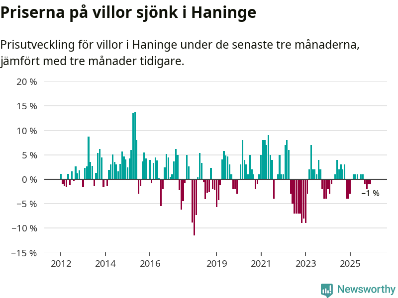Villapriserna har gått ner i Haninge kommun. Medelpriset på försäljningarna under de senaste tre månaderna visar på en nedgång med 1 procent.
