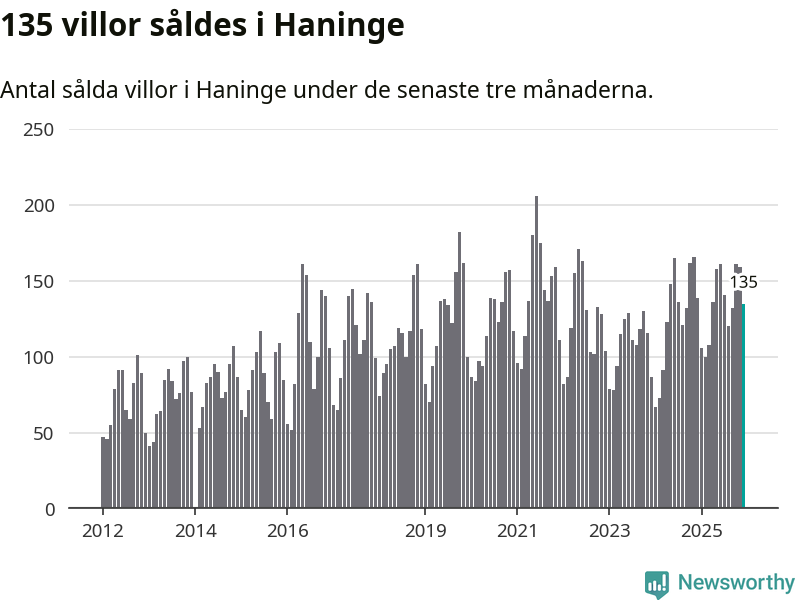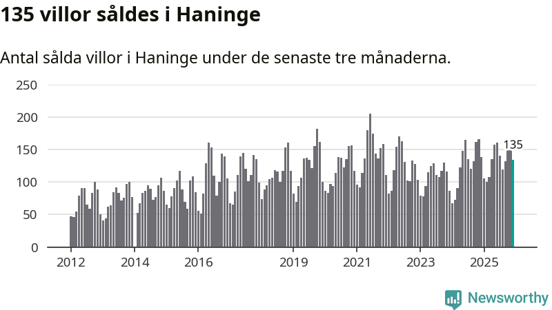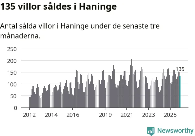 Sammanlagt såldes 135 villor i Haninge kommun mellan oktober och december till ett genomsnittligt pris på 5,3 miljoner kronor. I fjol gjordes 139 affärer vid den här tiden på året.